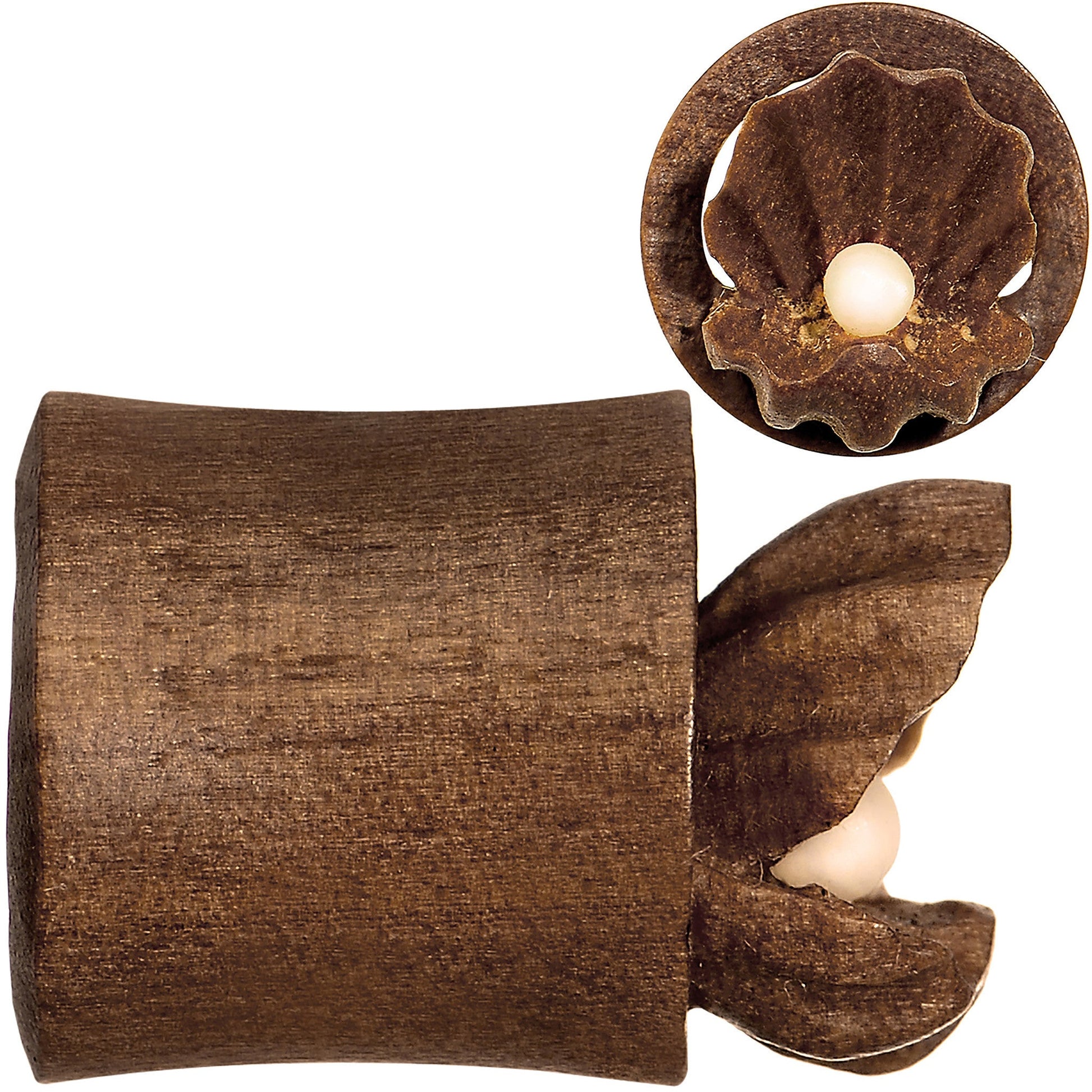Urban Star organic ear plugs, 10mm left and right double flare tunnel ear plug set. These fabulous clamshell ear stretchers are created from gorgeous natural brown sabo wood with a natural bone "pearl" in the center. Pierced ear expander body jewelry sold as a pair of two. Nautical themed Urban Star jewelry is handcrafted by highly experienced artisans.