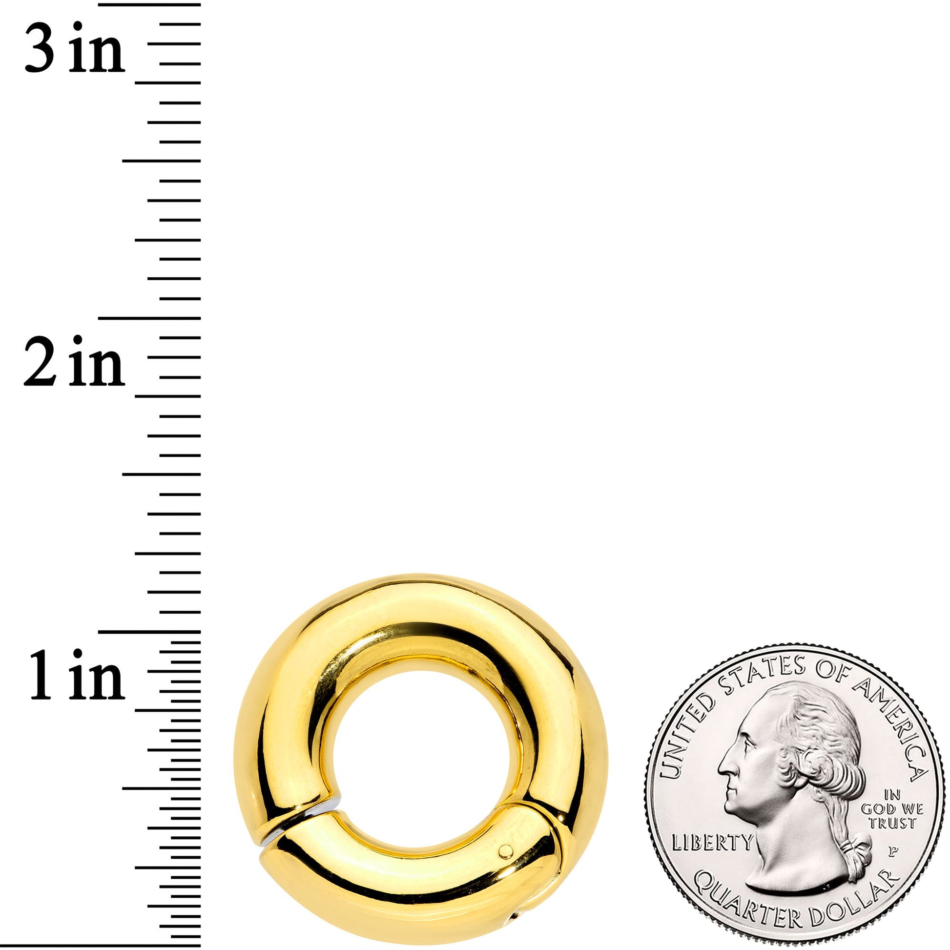 Look no further if you seek body jewelry for your larger gauge piercings because this 0 gauge body piercing ring is perfect! It's made with a 14mm gold tone PVD over 316L surgical grade stainless steel circular ring that features a hinged, non-removable segment which makes it super easy to insert and remove. Your larger gauge or stretched piercing is nothing to worry about with the classic style of this universal body piercing ring!Specifications