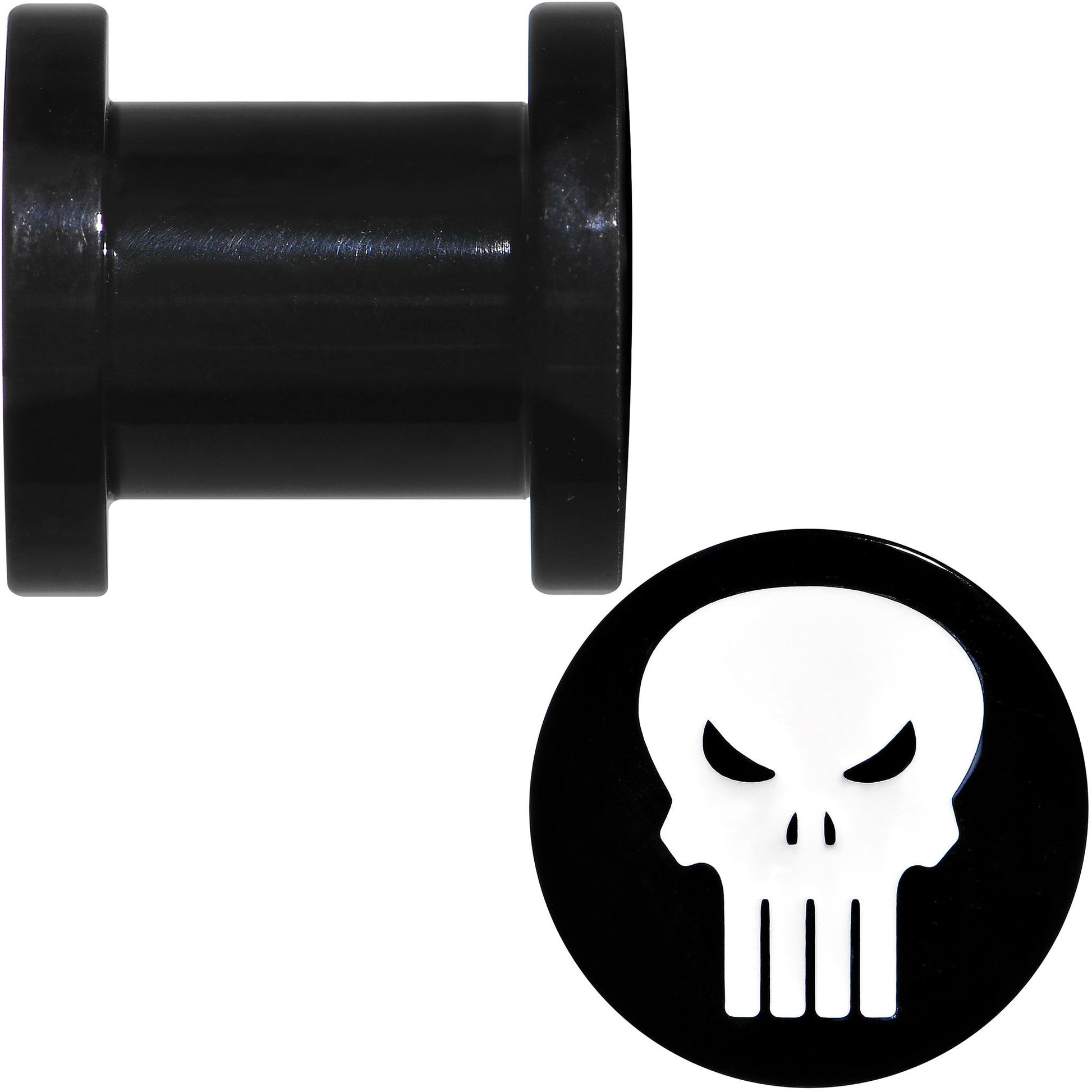 This 8mm ear gauge size plug set features two black PVD over stainless steel Punisher logo ear plugs. Take on the mob and the criminal underworld with Frank Castle and Punisher ear plug body jewelry. These white enamel skull logo superhero steel screw fit plugs are sold as a pair of two (2). The Punisher is from Marvel Comics jewelry. Licensed cartoon ear plugs.