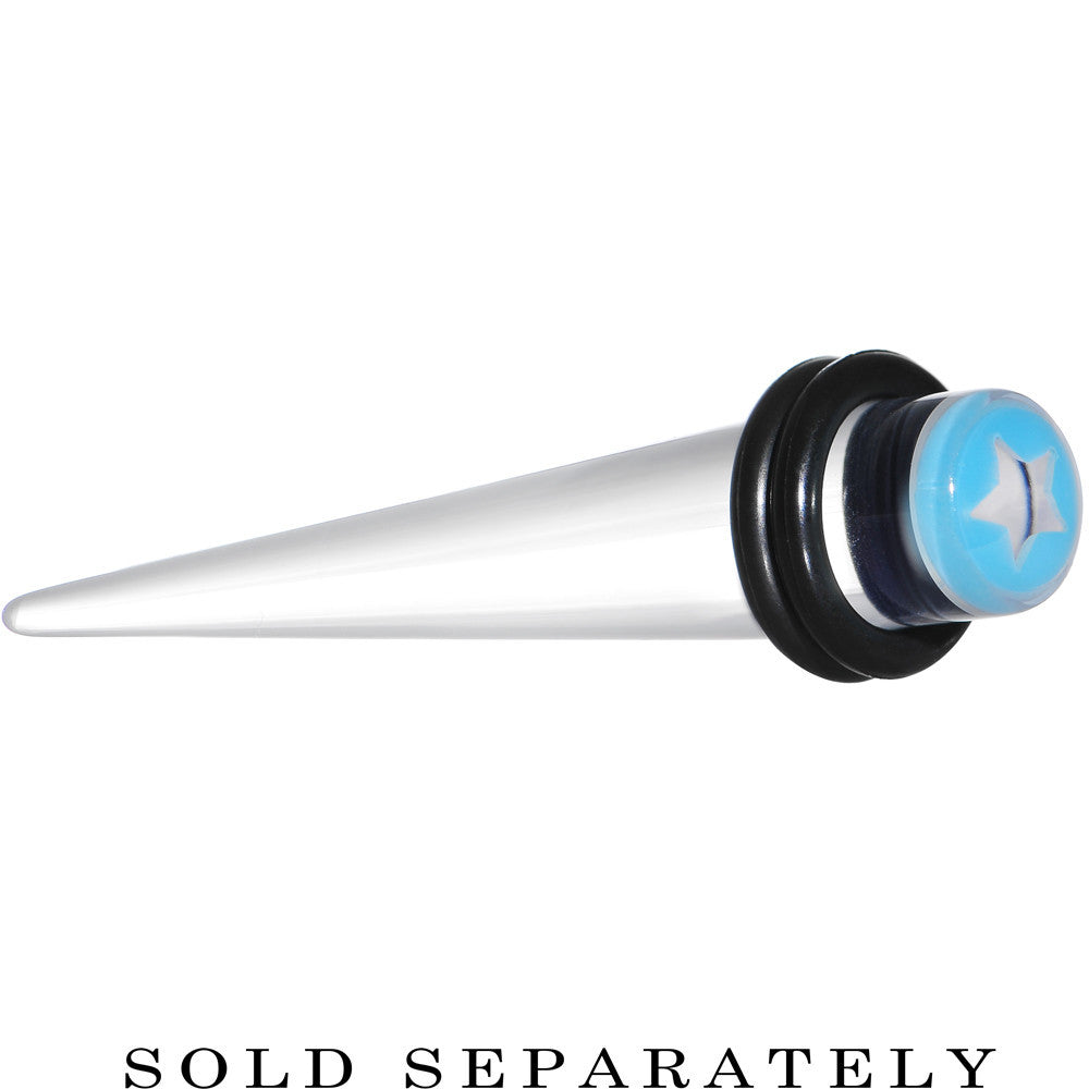 Hypoallergenic jewelry for sensitive skin.Item sold individually, purchase two for a pair. Always have a wish on hand when you wear this star acrylic ear expander taper plug. The solid clear acrylic 8mm ear stretcher is topped with light blue and a clear star at the center. Pierced body jewelry straight taper ear gauge plug comes with two rubber O-rings.