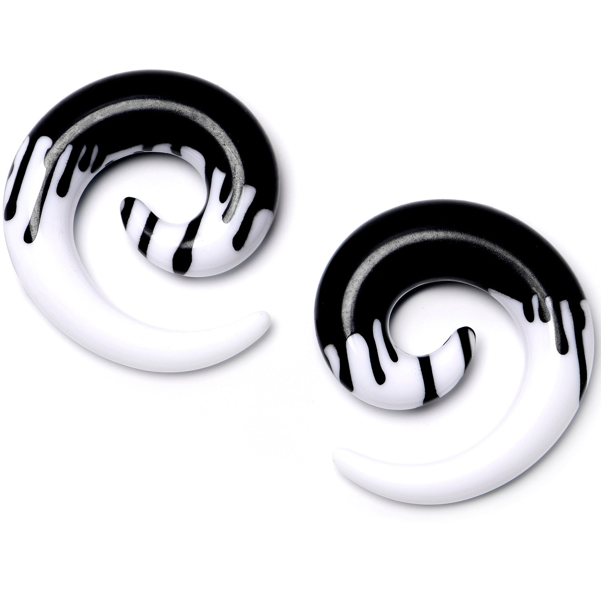 Hypoallergenic jewelry for sensitive skin.0 Gauge White Black Drip Acrylic Spiral Taper Set
