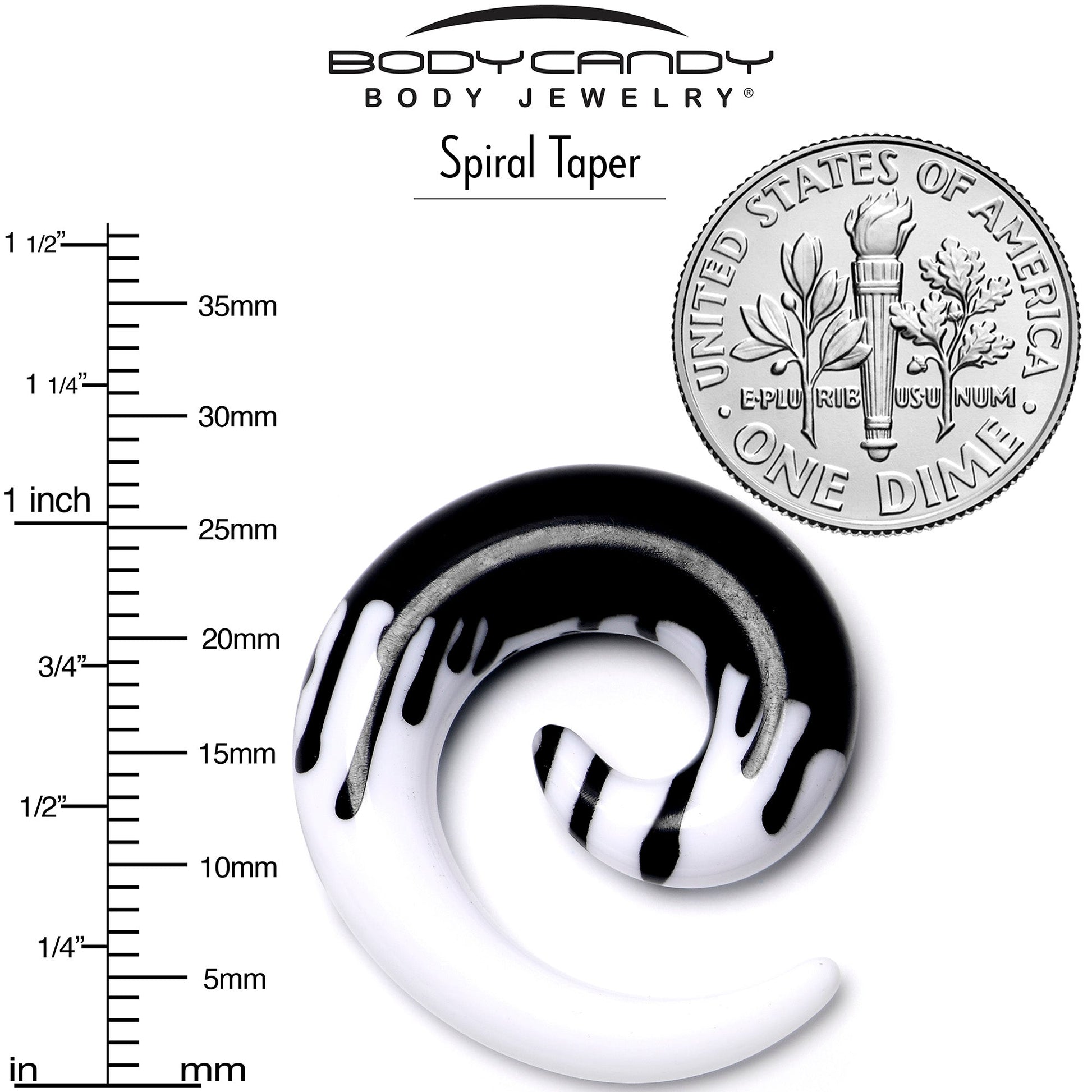 Your look will be dripping with gothic glamour when you are rocking these spooky 0mm spiral plugs for stretched ear lobes. They are made with acrylic and feature a spiral taper design for comfortable insertion. They feature a black drip-look design on a white background for a look that is full of eye-catching contrast. Why be a drip when you can be a diva and rock these stylishly spooky tapers. Sold as a set of two.Specifications