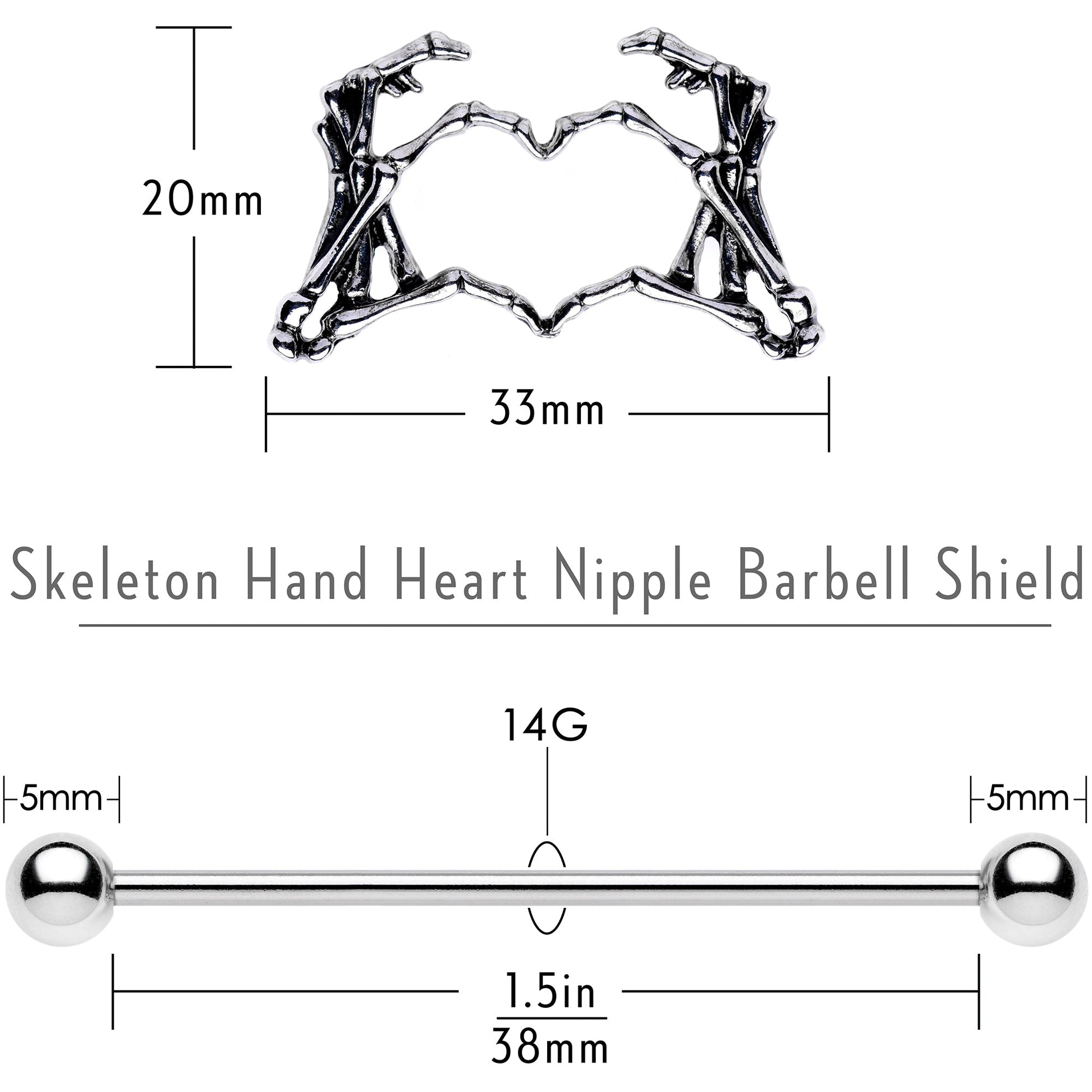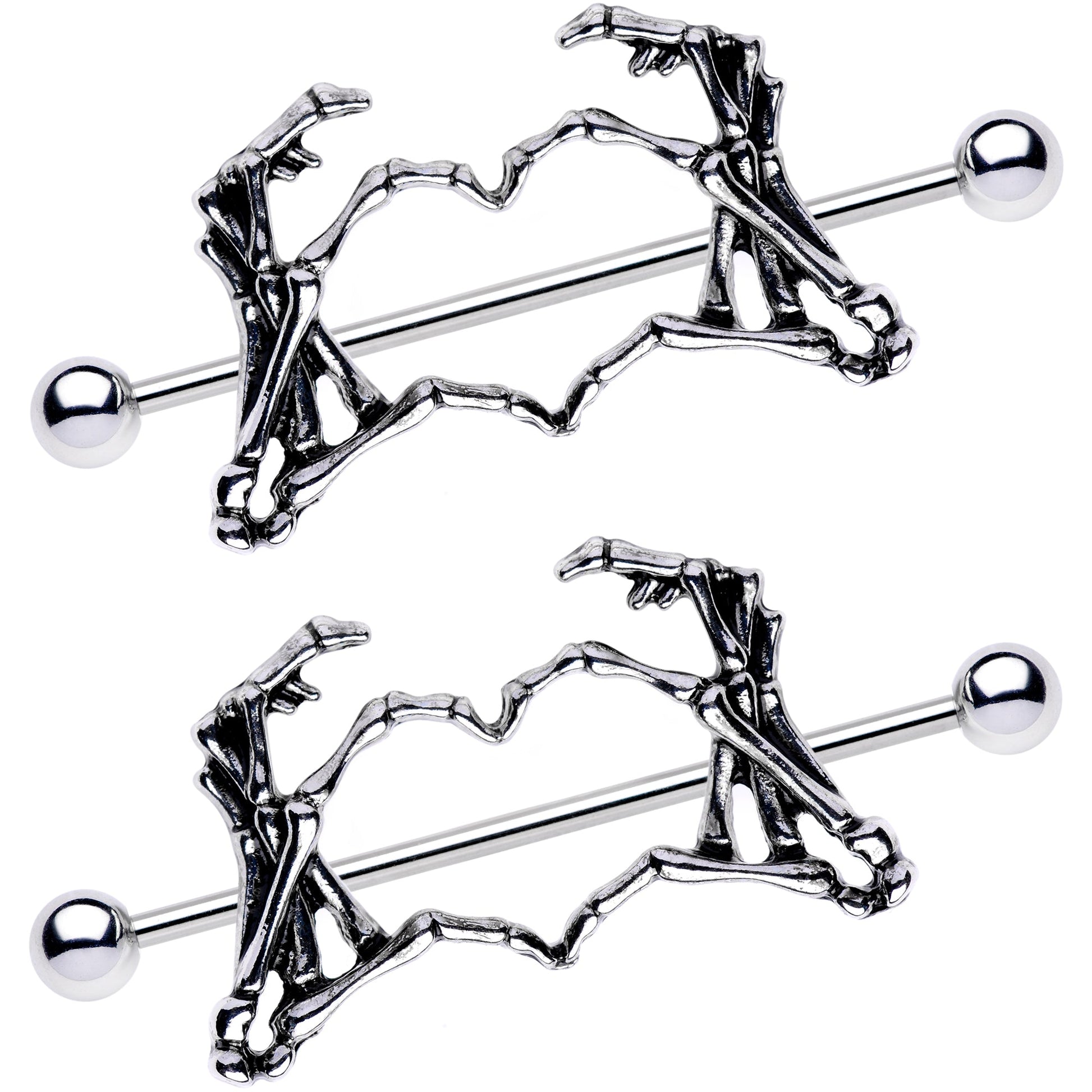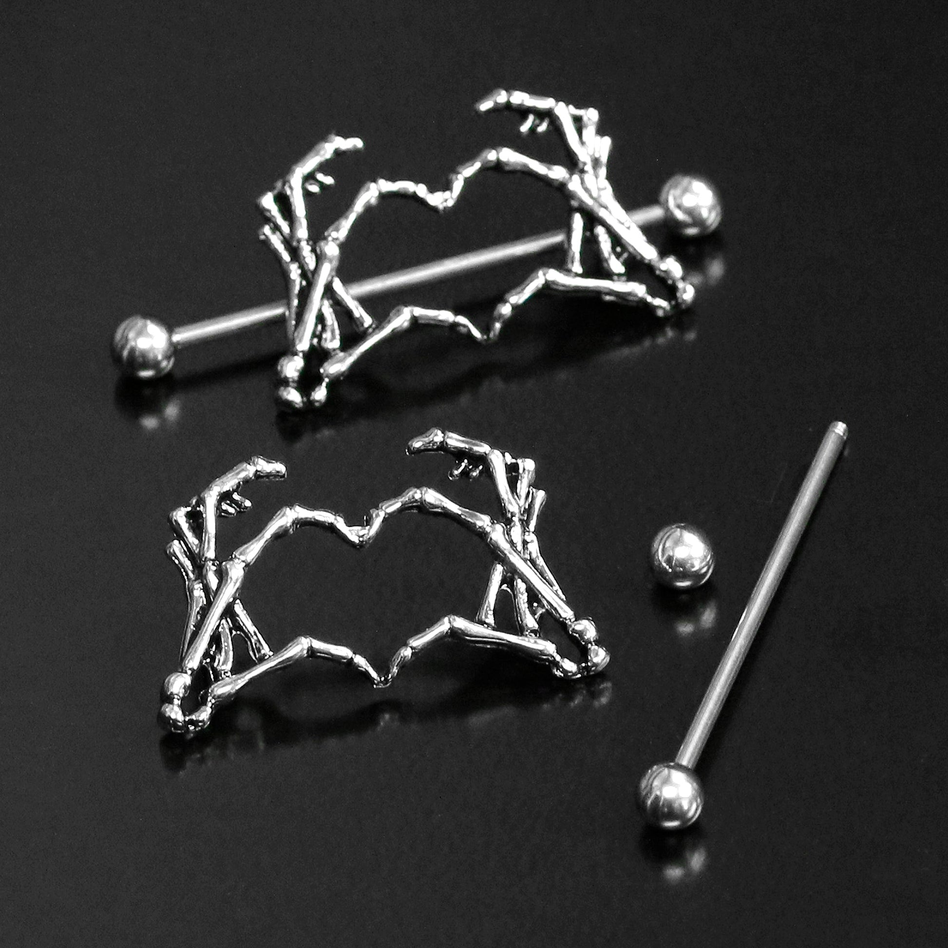 Tap into your creepy side with these lovely, weird, and fun barbell nipple rings. These 14 gauge barbell nipple shields feature large, skeleton hand charms that form a heart between their fingers! The skeleton hand charms are set on a pair of 38mm in length straight barbells made with durable 316L surgical grade stainless steel and are perfect for Halloween, Valentine's Day, or any time of year. Sold as a set of two!