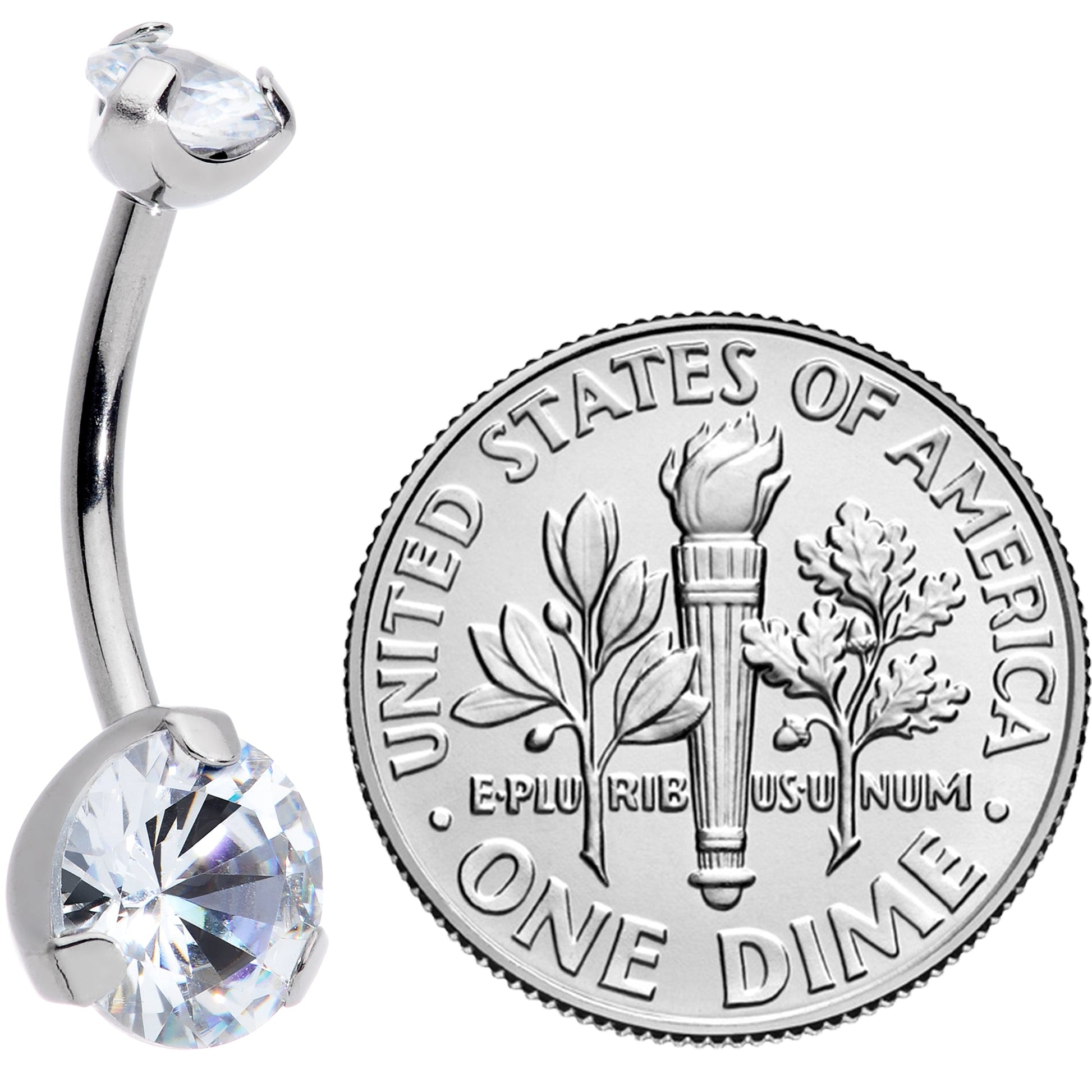 Sometimes you have to choose between style and substance....but not with this 14 gauge navel ring! This internally threaded belly button ring is made with a 1/2" solid grade 23 implant grade titanium curved barbell for durability and comfort of insertion, as well as offering a bit of extra length. It features a matching pair of clear cubic zirconia gems, a 5mm one set into the top end and an 8mm one that composes the bottom end. The overall look is subtle but sumptuous and elegantly understated. Add a dash of glamour to your navel piercing with this tasteful titanium belly button jewelry!Specifications