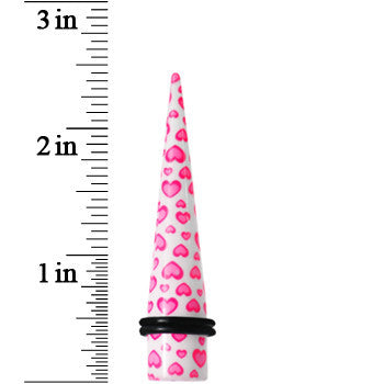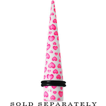 Hypoallergenic jewelry for sensitive skin.Sold individually, Please purchase a quantity of 2 for a pair. 12mm taper ear plug. White acrylic straight taper with cute pink heart print design. Heart taper ear expander.