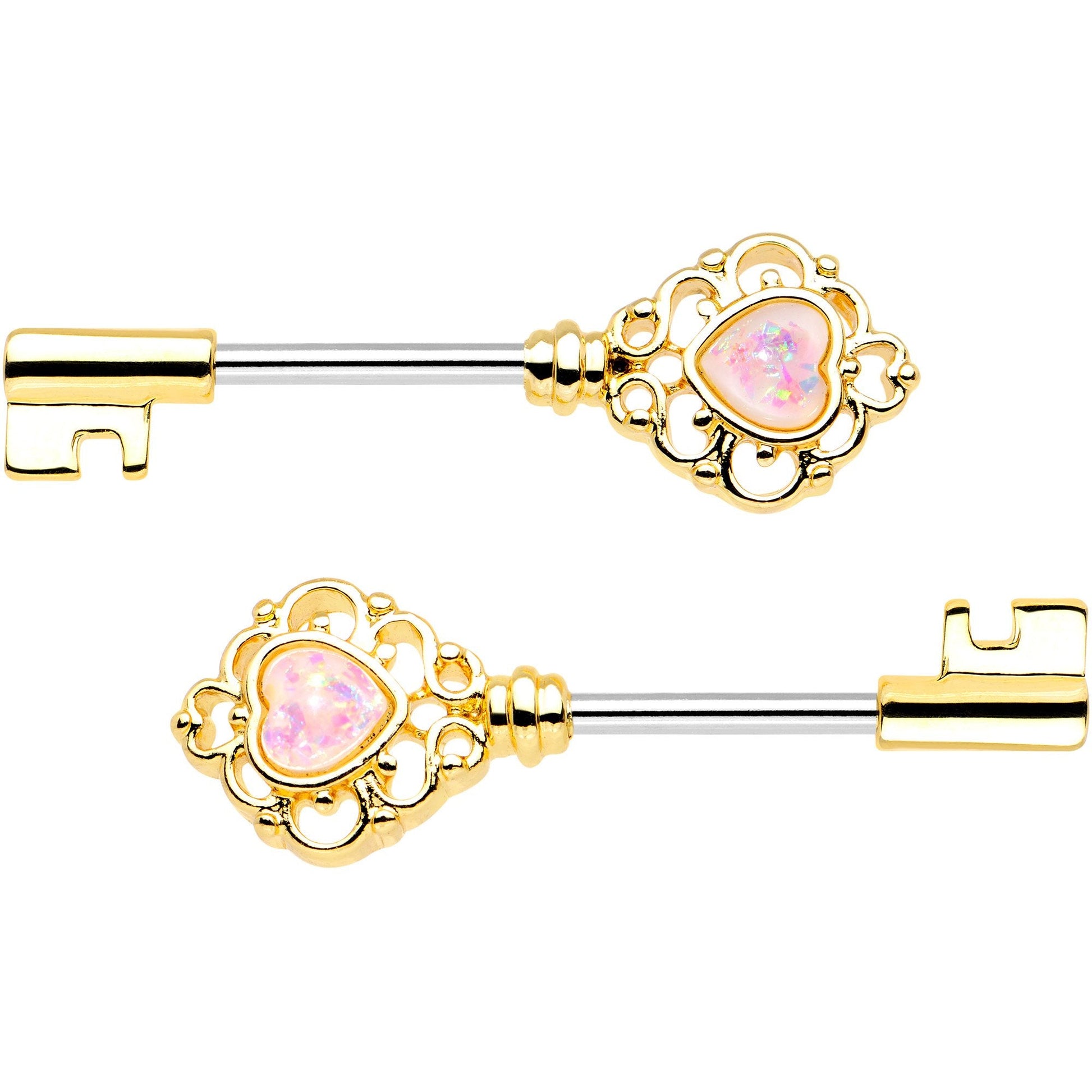 1/2" White Faux Opal Gold Tone Heart Key Barbell Nipple Ring Set