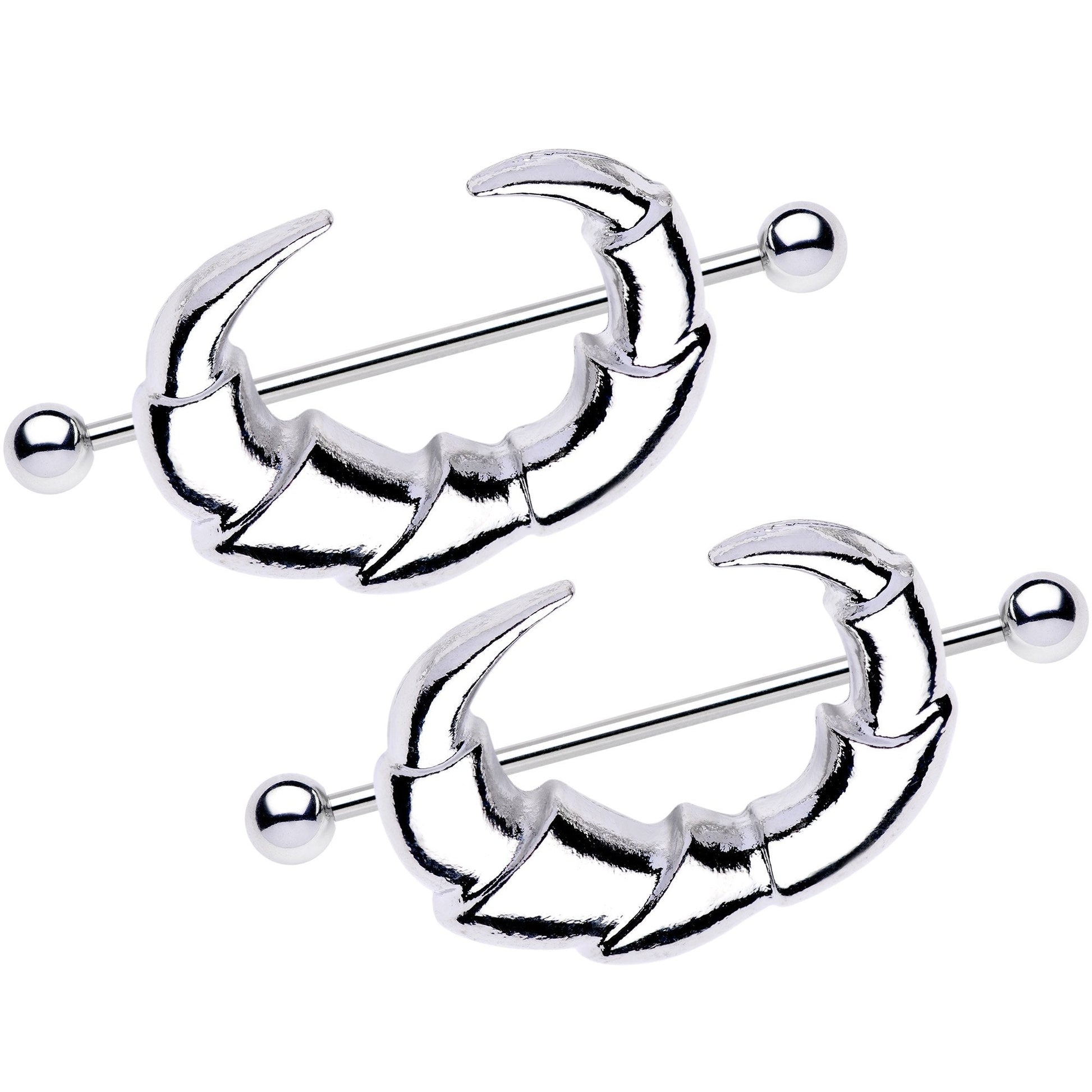 Now, these nipple shields are badass! Pick up this pair of claw tooth nipple rings to show off your badass side. These 14 gauge barbell nipple shields feature large, talon charms with long claws. The claw tooth charms are set on a pair of 35mm in length straight barbells made with durable 316L surgical grade stainless steel. Sold as a set of two!Specifications
