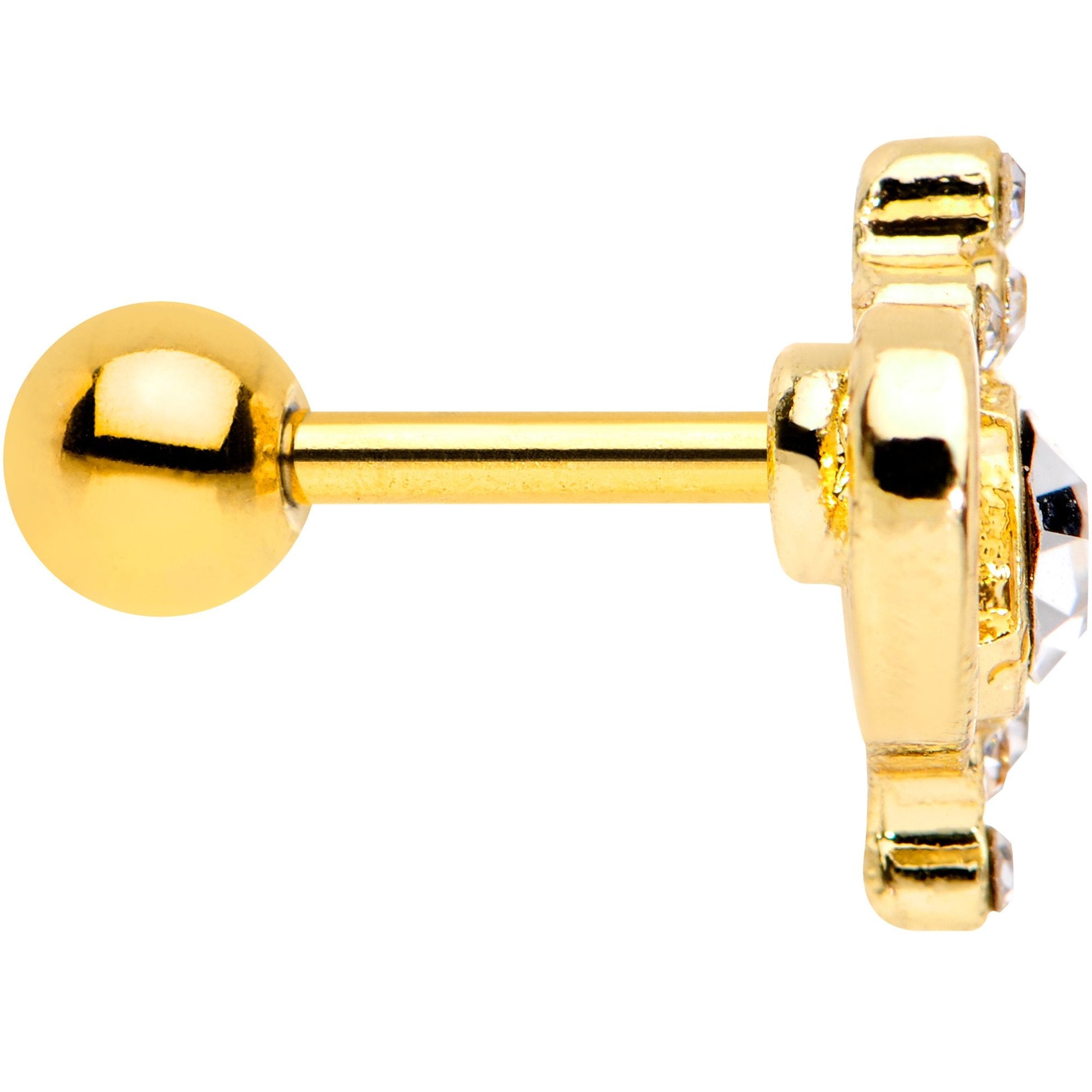 Wear your heart on your sleeve, or in this case on your ear, with this beautiful heart-shaped cartilage stud. This heart-shape stud features a cluster of clear gems surrounding one large central clear gem. The 16 gauge heart charm is mounted on a 1/4" straight barbell made with gold PVD over 316L surgical grade stainless steel. Great for a tragus piercing or other cartilage piercings.
