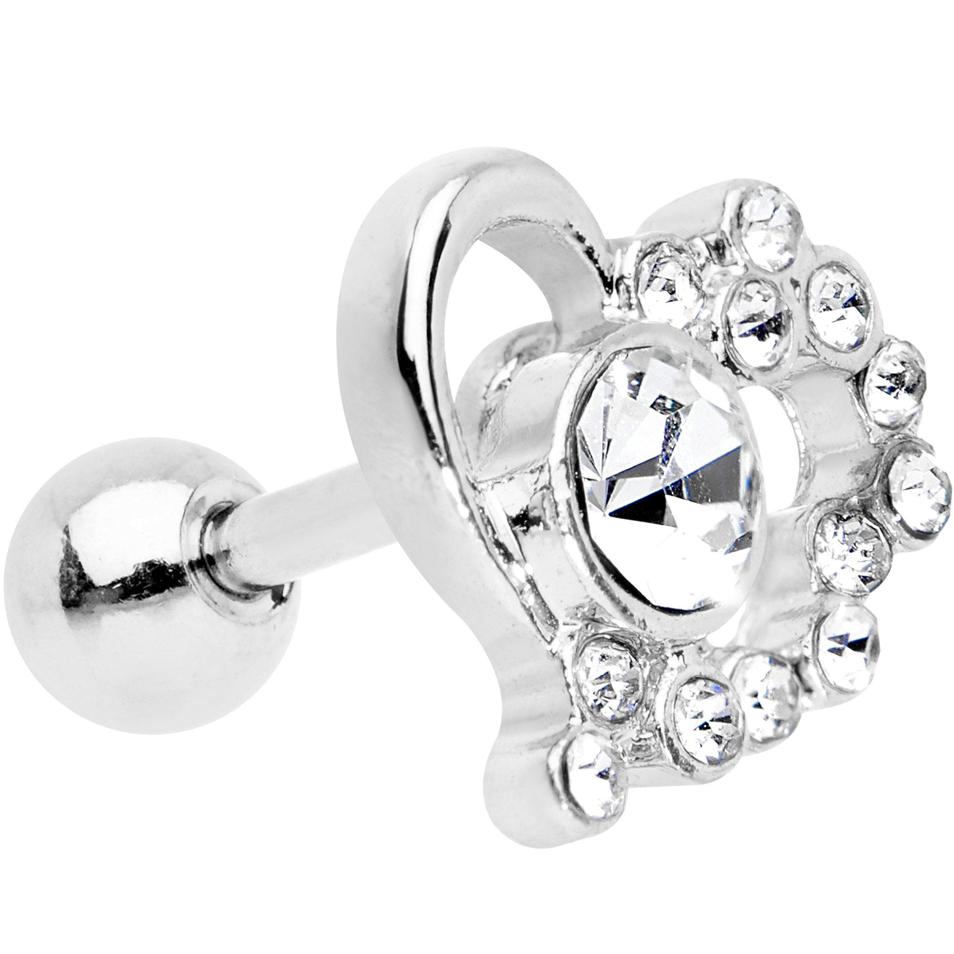 Wear your heart on your sleeve, or in this case on your ear, with this beautiful heart-shaped cartilage stud. This heart-shaped stud features a cluster of clear gems surrounding one large central clear gem. The 16 gauge heart charm is mounted on a 1/4" straight barbell made with durable 316L surgical grade stainless steel. Great for a tragus piercing or other cartilage piercings.