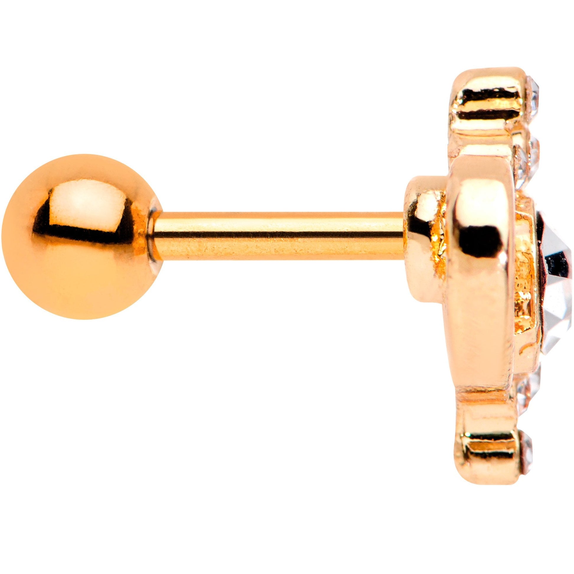 Wear your heart on your sleeve, or in this case on your ear, with this beautiful heart-shaped cartilage stud. This heart-shaped stud features a cluster of clear gems surrounding one large central clear gem. The 16 gauge heart charm is mounted on a 1/4" straight barbell made with rose gold PVD over 316L surgical grade stainless steel. Great for a tragus piercing or other cartilage piercings.