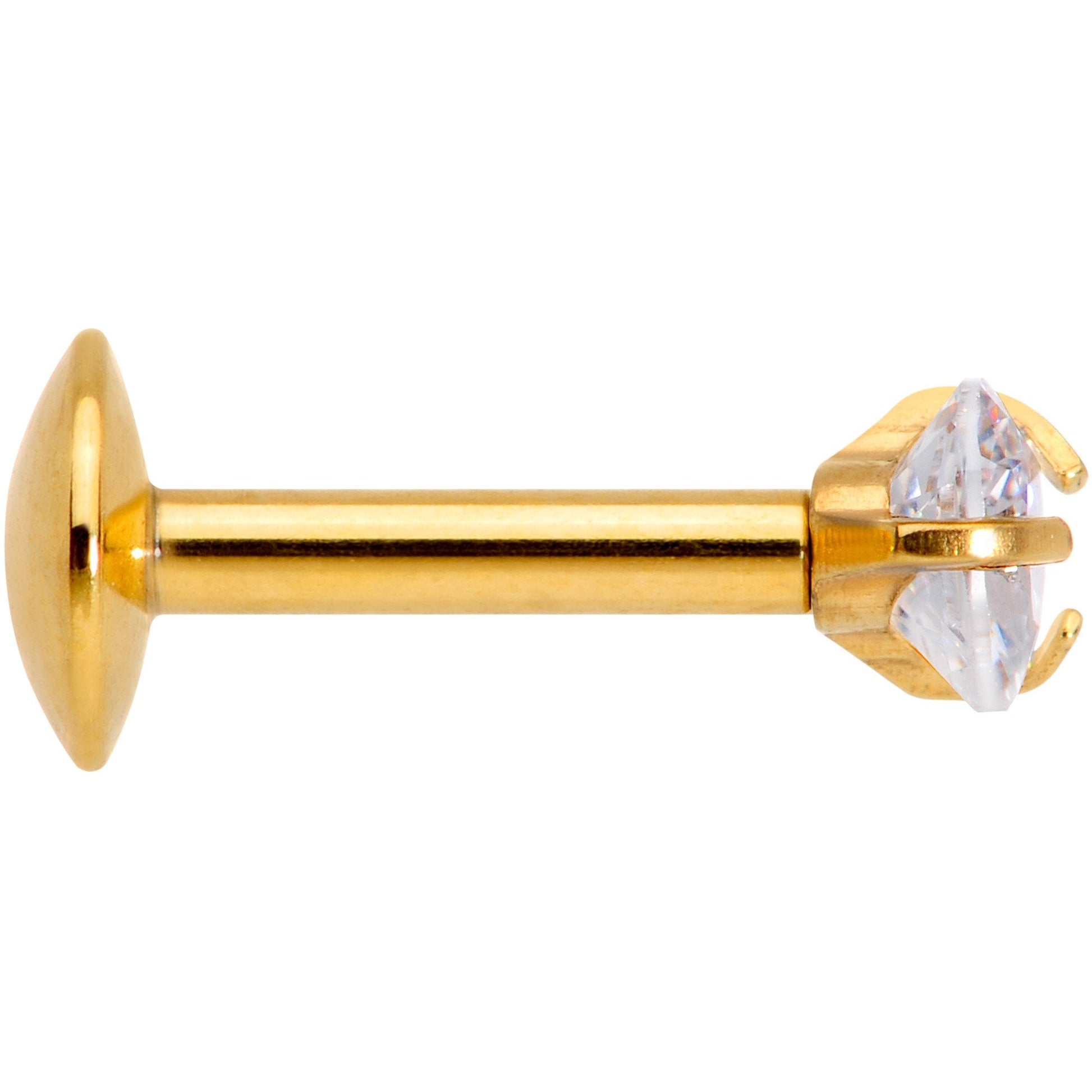 If you love simple yet stylish labret jewelry, then you will love this 16 gauge flat back barbell. Made with a 6mm gold PVD over 316L surgical grade stainless steel straight post, this labret piercing features an internally threaded 2mm clear cubic zirconia, heart-shaped gem end. Features a flat back that is perfect for a labret piercing, monroe piercing, or even a cartilage piercing.Specifications