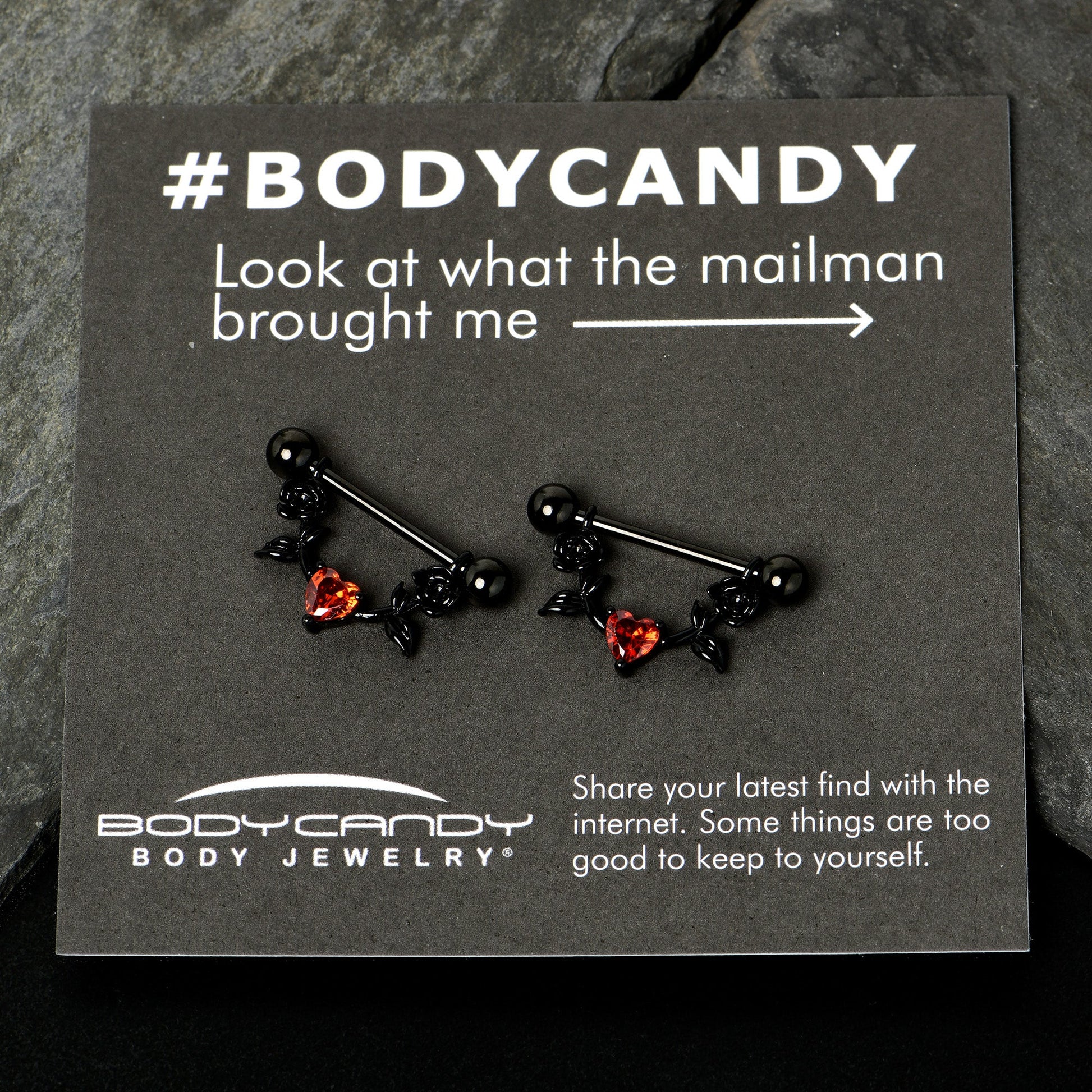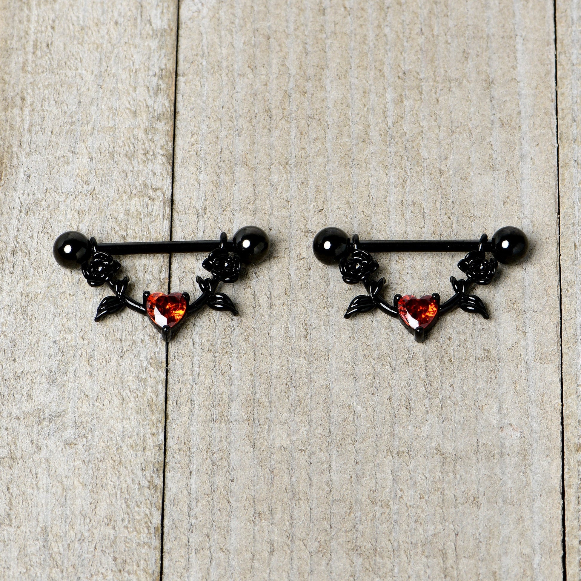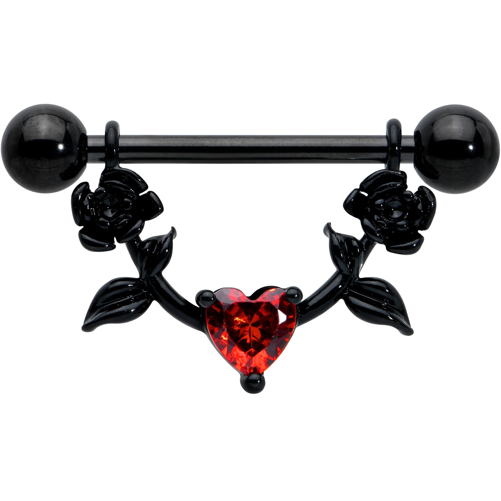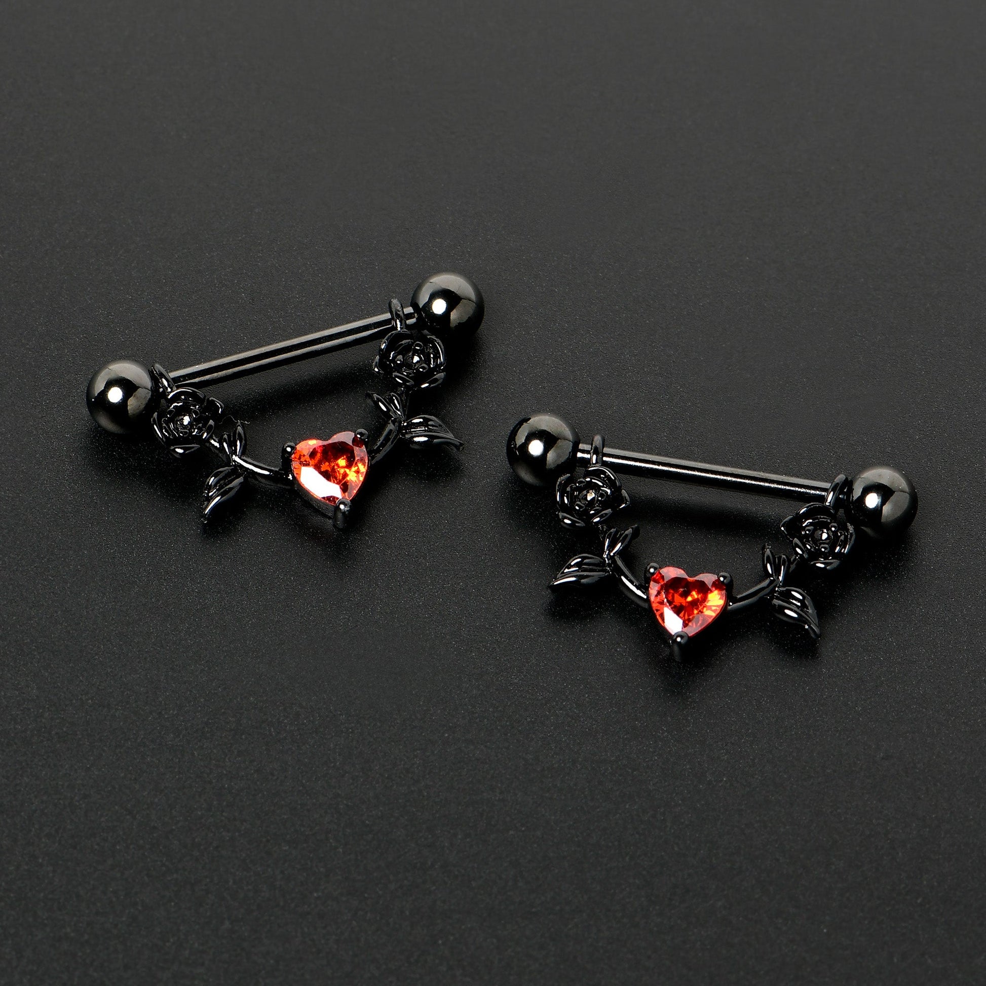 Celebrate love in gothic style with this 14 gauge nipple jewelry! It's made with 18mm black PVD over 316L surgical grade stainless steel straight barbells with 5mm ball ends. The dangling portions are each composed of a pair of detailed black flowers. At the central point is a red, heart-shaped cubic zirconia gem for a stunning touch of eye-catching color. These gorgeously goth styled nipple piercings rings are sure to steal your heart! Sold as a set of two.Specifications
