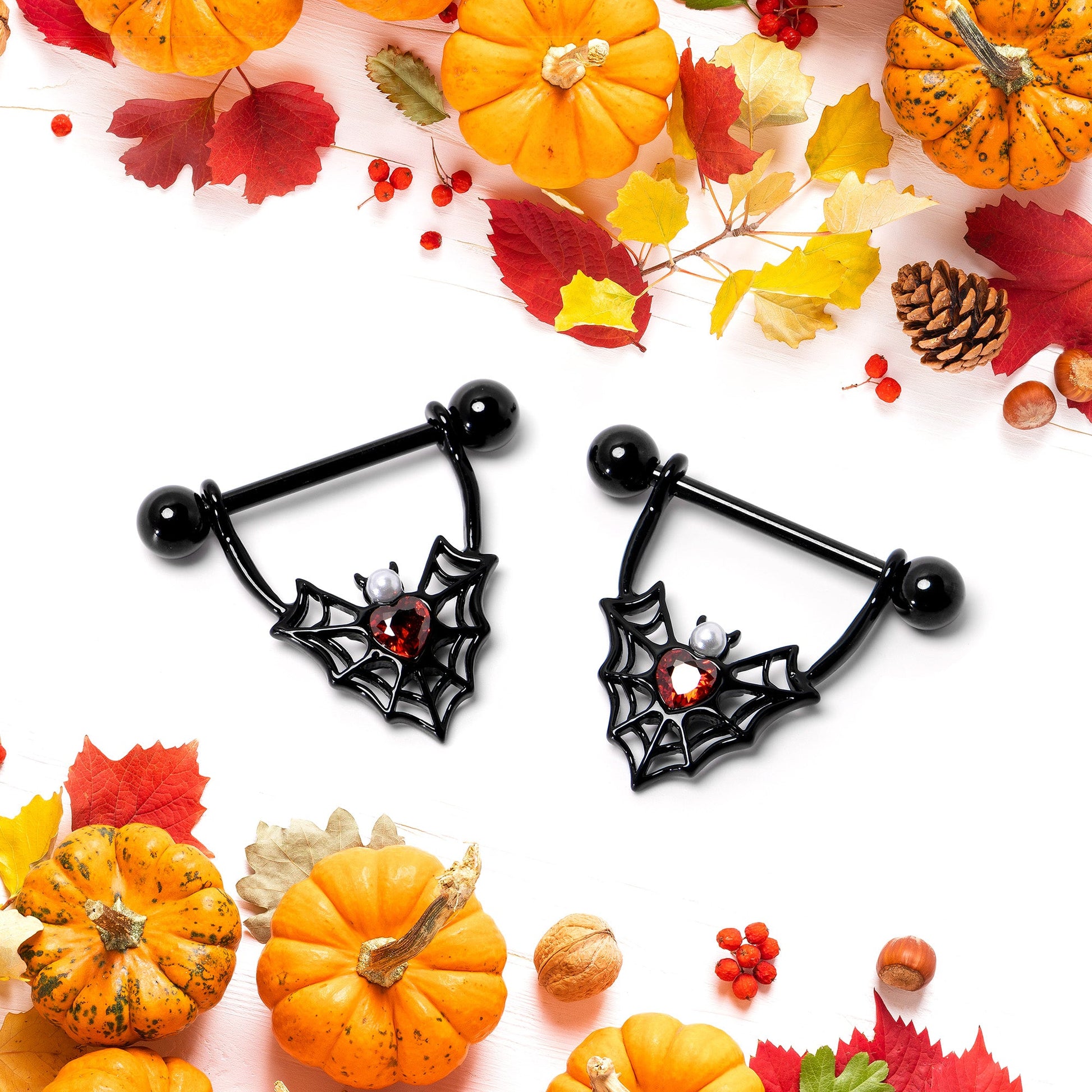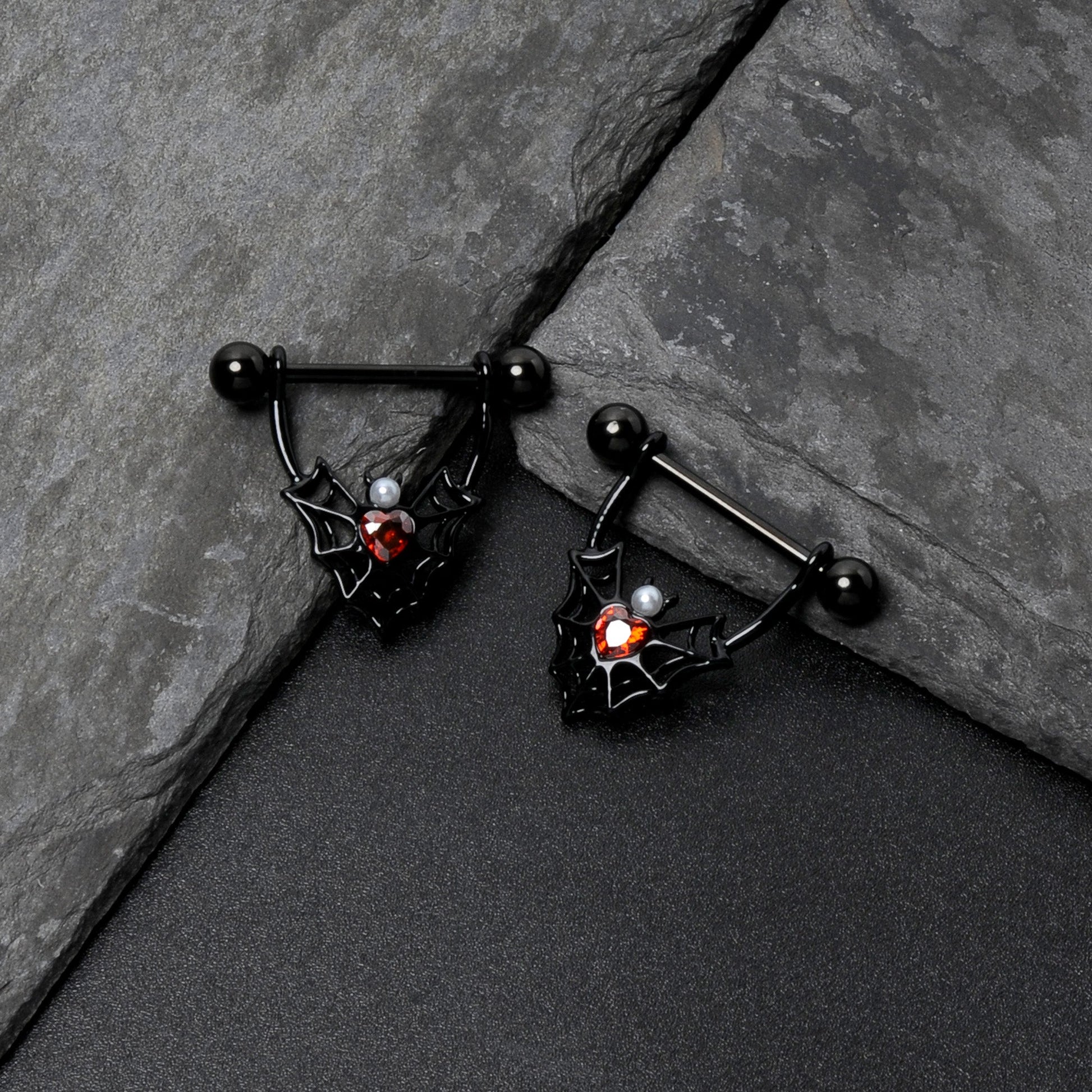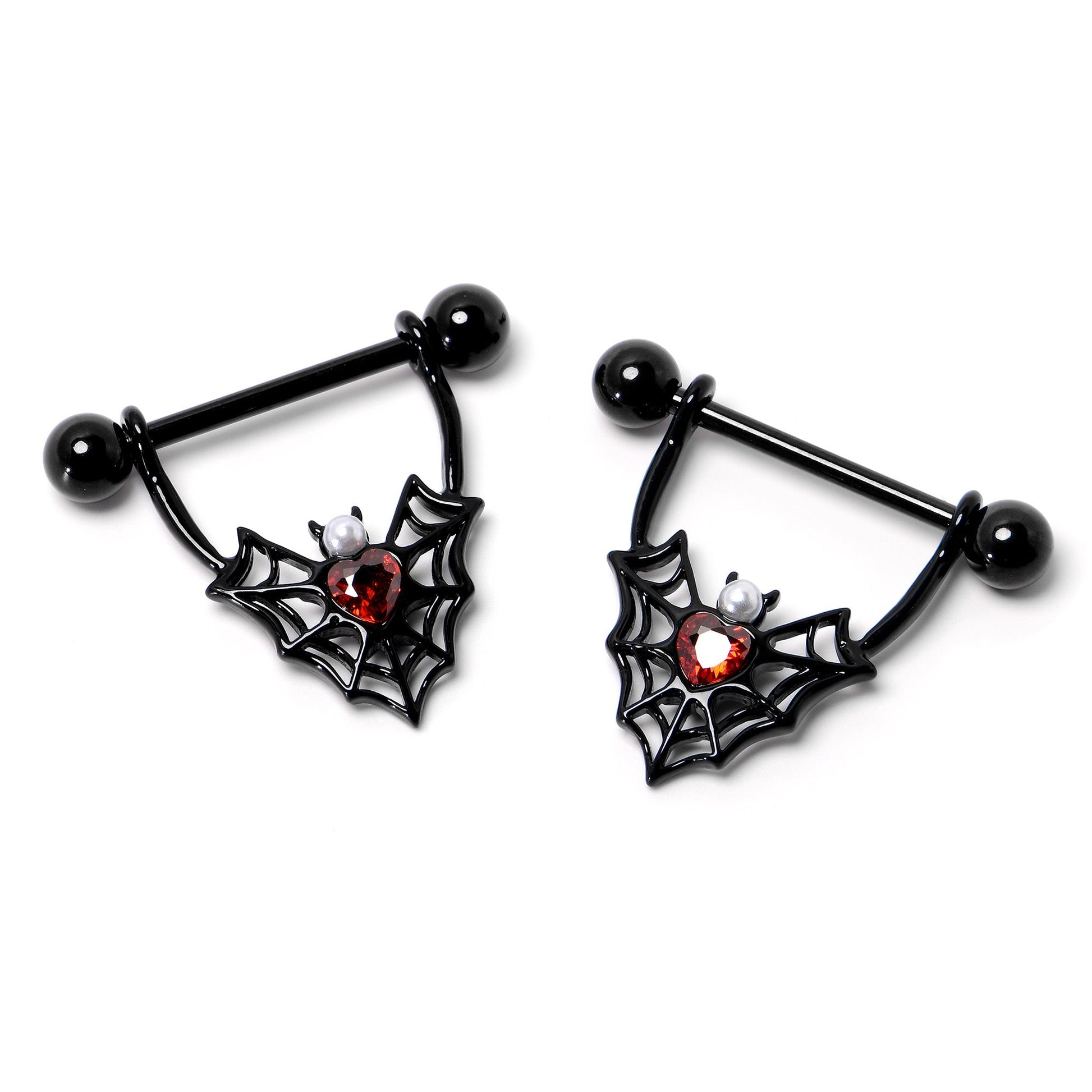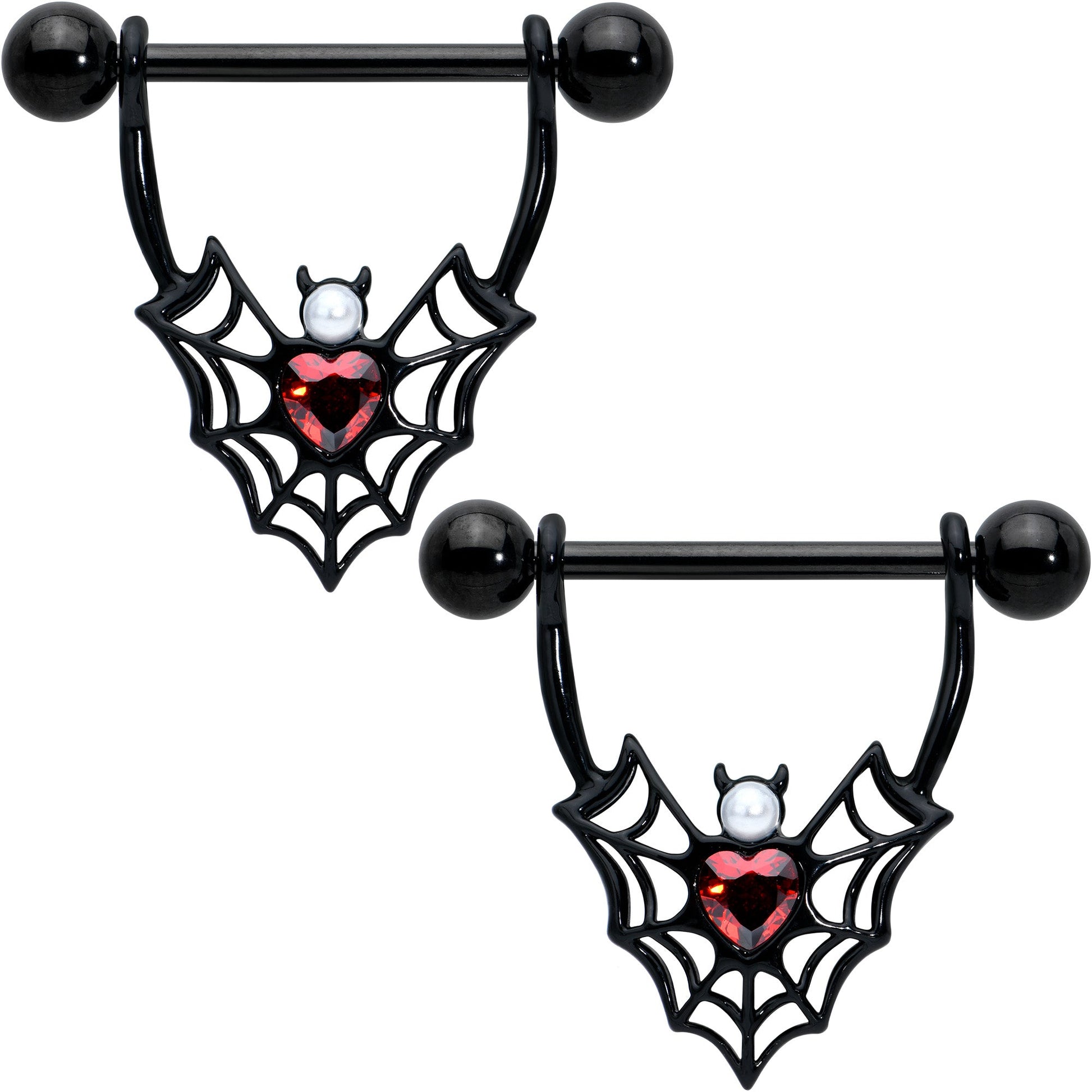 Show your appreciation for those beautiful bats with this 14 gauge nipple jewelry. It is made with 18mm black PVD over 316L surgical grade stainless steel straight barbells with 5mm ball ends. The shield portions each feature a heart charm, composed of a spider web pattern. The hearts serve as wings for bat embellishments, with pearlescent white orb heads and red gem, heart shaped bodies. Show your fondness for all the creepy, crawly, flying friends of the night with these gorgeous and gothic nipple piercing rings. Sold as a set of two.Specifications