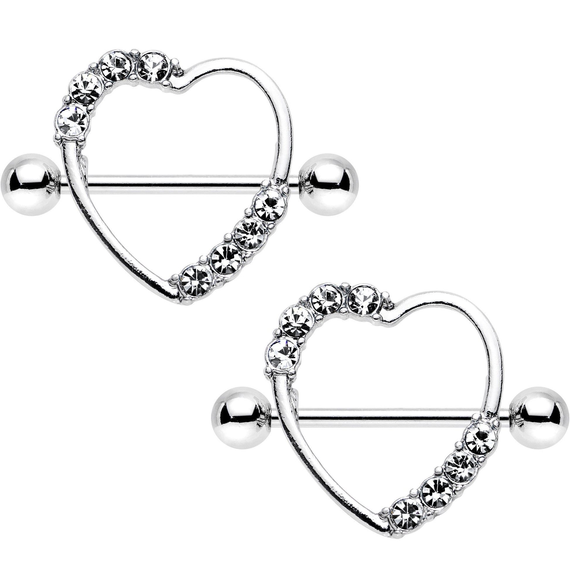 Dress up your breasts with the essence of love and beauty when you wear this pretty pair of 14 gauge nipple piercings. Made with 19mm durable 316L surgical grade stainless steel straight barbells, this set of nipple shields features heart shield charms with a 14mm diameter opening lined with clear gems. This pair of Valentine's Day inspired nipple barbells is sold as a set of two for you!