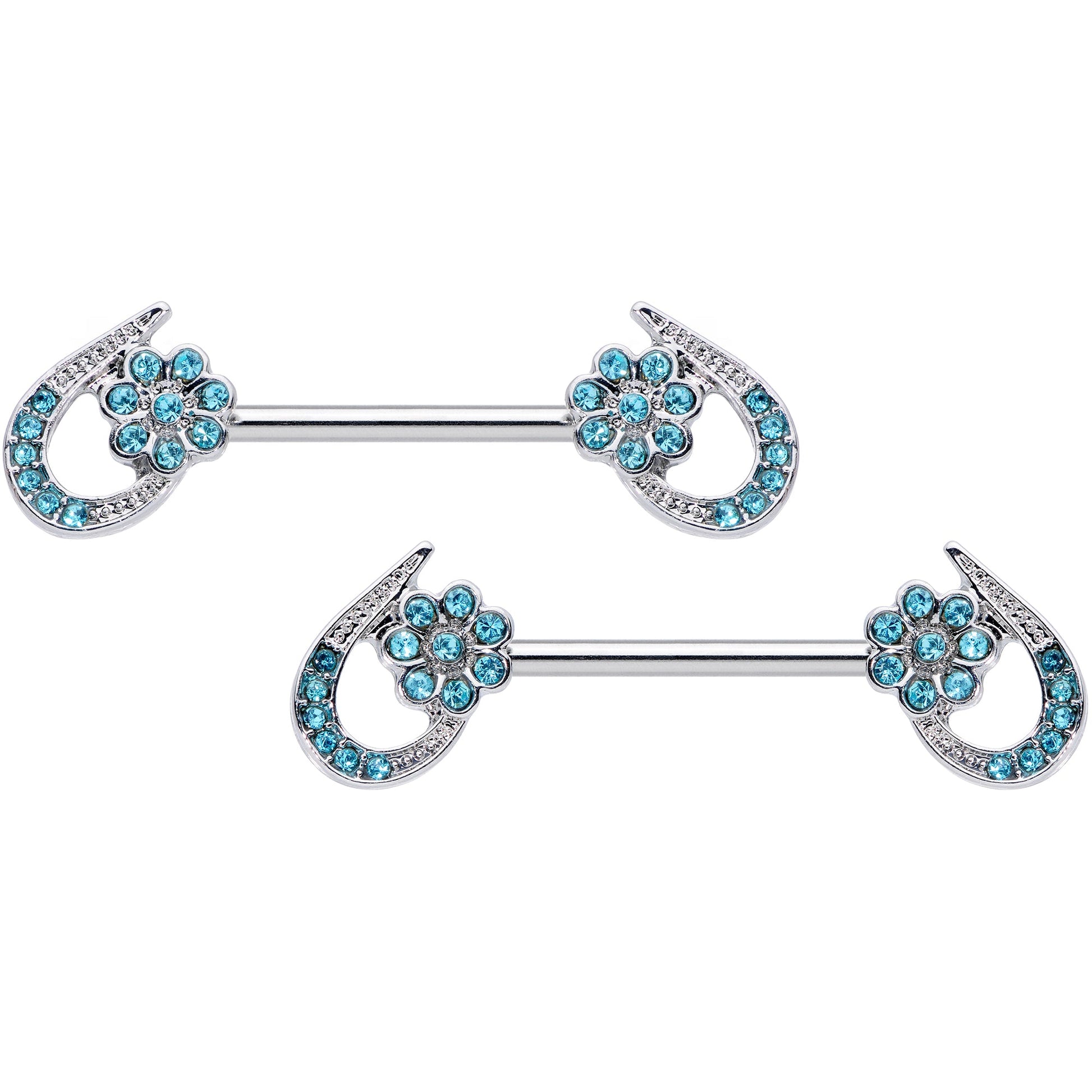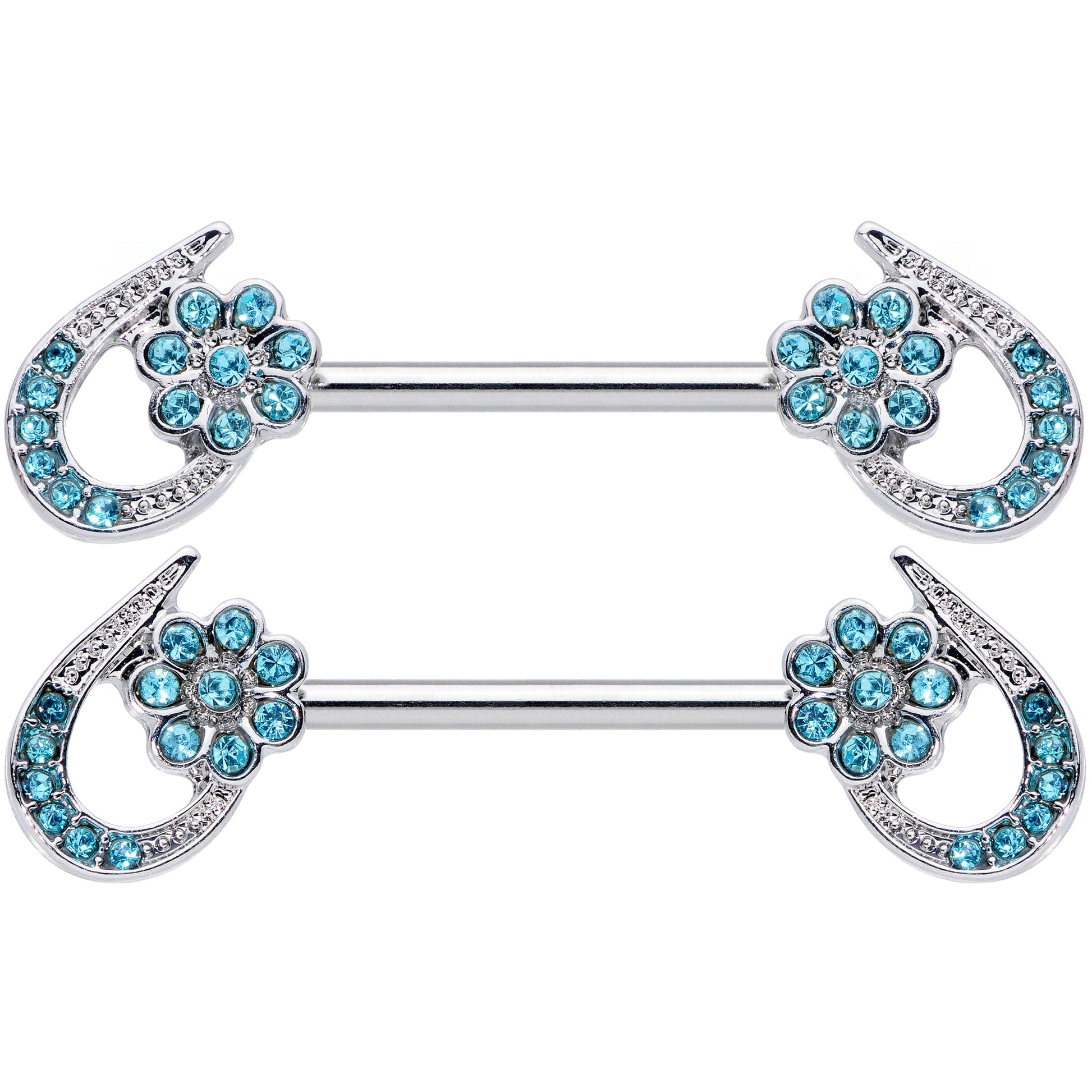 Half a heart this Valentine's Day with this 14 gauge nipple jewelry! It's made with 16mm durable 316L surgical grade stainless steel straight barbells. Each of the ends features a half heart charm set with aqua gems. Between the heart's ends is an aqua flower, composed of matching aqua gems. These half hearts are sure to steal your whole heart with the graceful style they'll bring to your nipple piercings! Sold as a set of two.Specifications