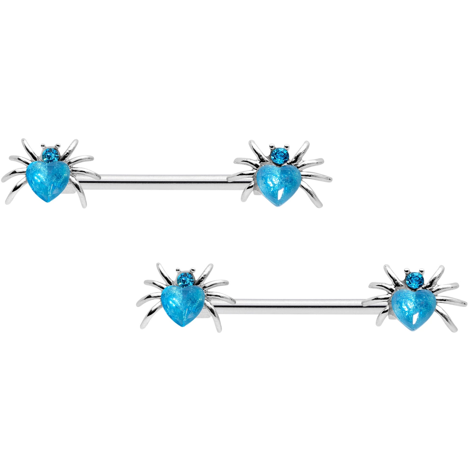 These little spiders will give you the shivers this Halloween...but not shivers of fear! This 14 gauge nipple jewelry is made with 16mm durable 316L surgical grade stainless steel straight barbells. The ends feature beautiful spider charm ends with the spider's bodies made of heart-shaped Valentine's Day blue gems with the head composed of smaller blue gems. So whether you cherish creepy crawlies or appreciate arachnids, these nipple piercing rings are sure to snare you in their web! Sold as a set of two.Specifications