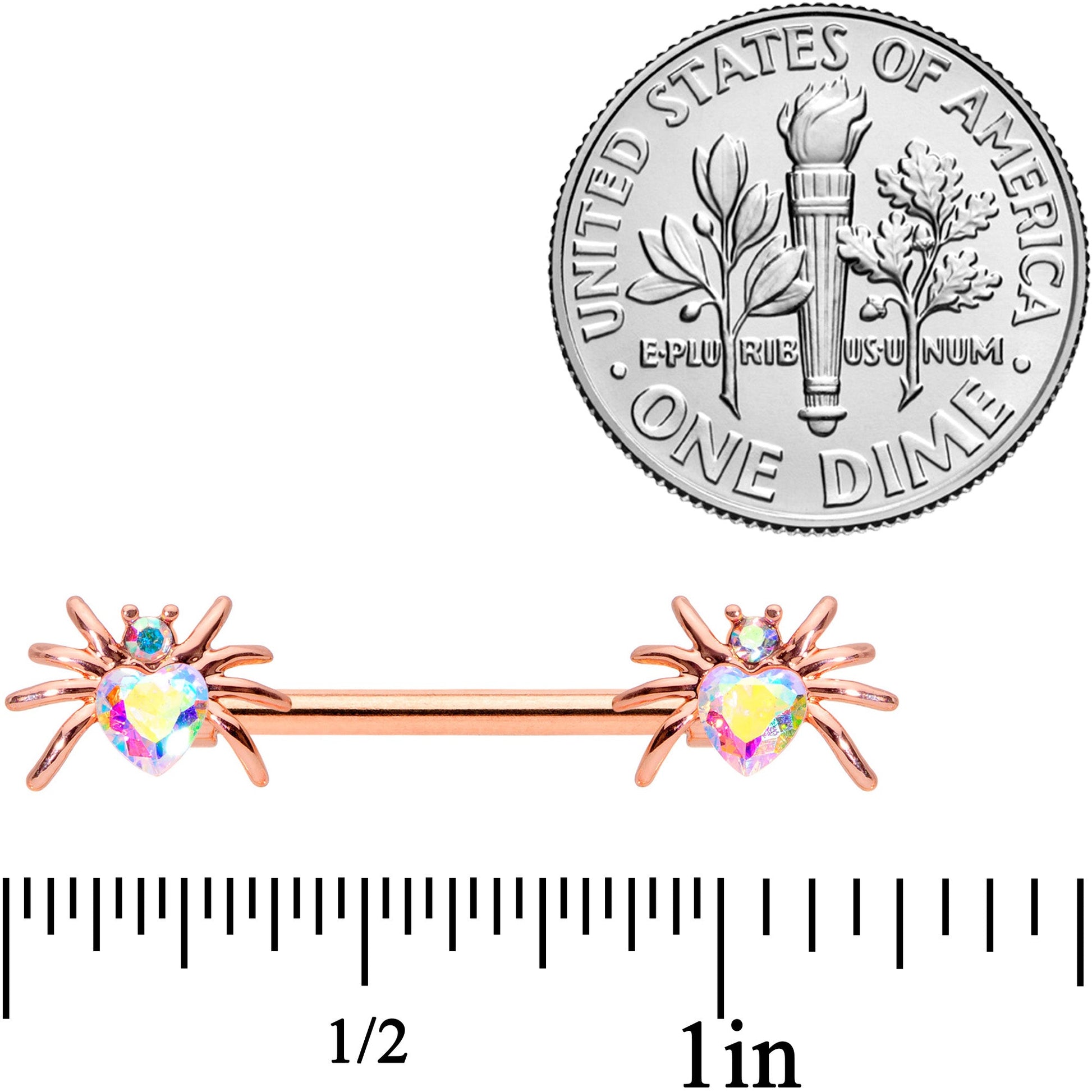 These little spiders will give you the shivers this Halloween...but not shivers of fear! This 14 gauge nipple jewelry is made with 16mm rose gold tone over 316L surgical grade stainless steel straight barbells. The ends feature beautiful spider charm ends with the spider's bodies made of heart-shaped Valentine's Day aurora gems with the head composed of smaller aurora gems. So whether you cherish creepy crawlies or appreciate arachnids, these nipple piercing rings are sure to snare you in their web! Sold as a set of two.Specifications