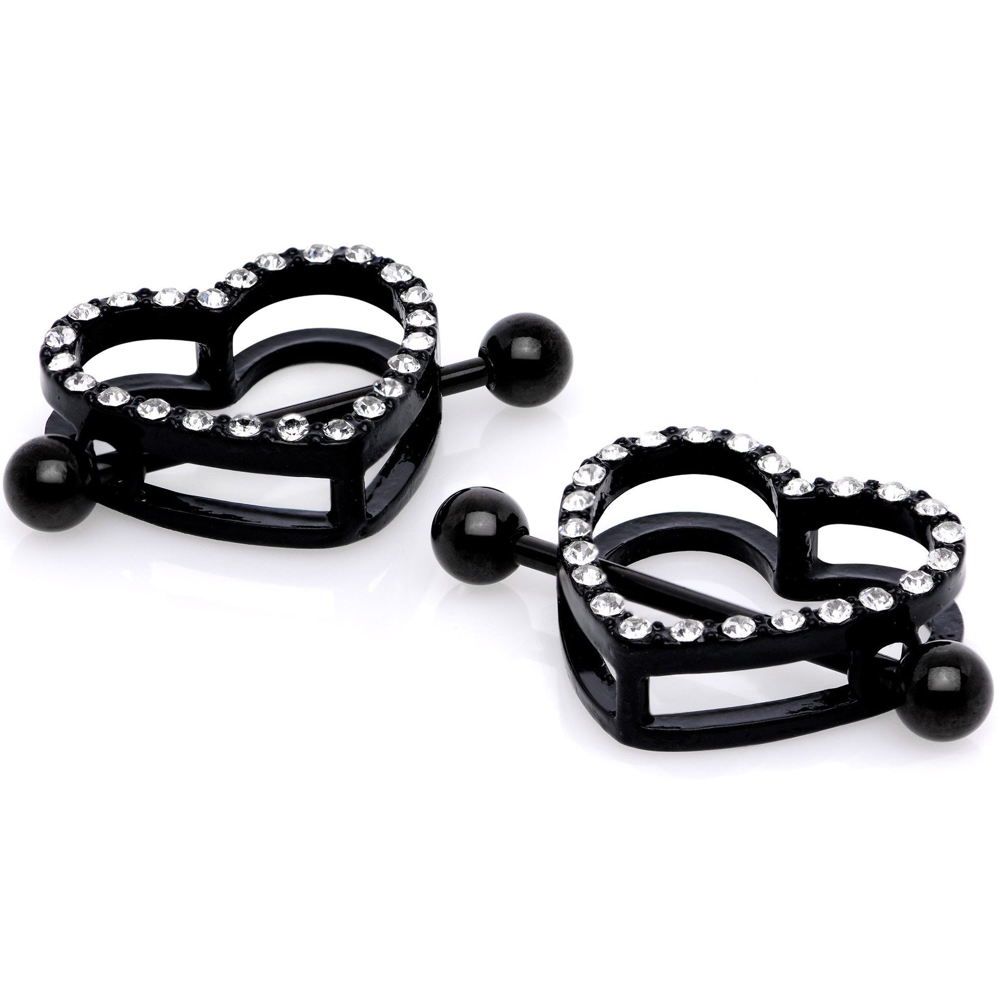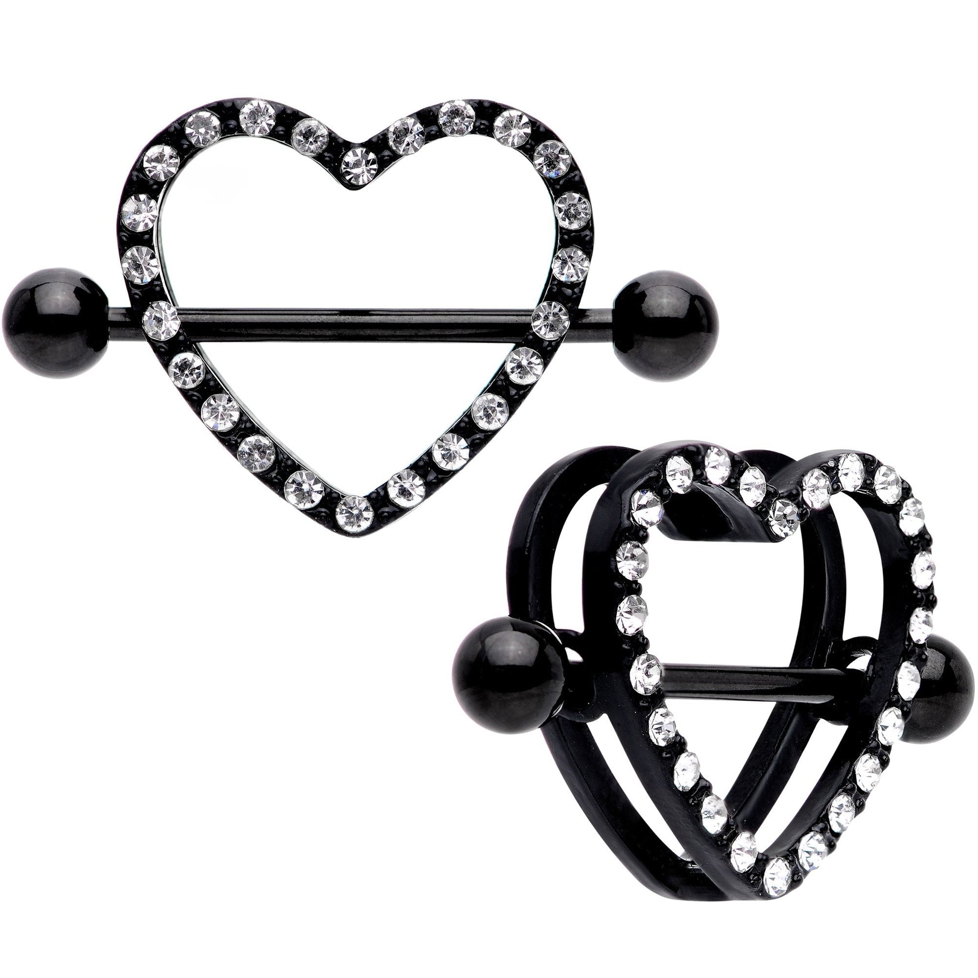 Get lost in love whenever you dress your breasts with this pretty pair of 14 gauge heart nipple piercings. Made with 16mm black anodized over 316L surgical grade stainless steel straight barbells, this navel jewelry features a double layered heart shield charm set with clear gems and is sold as a set of two.Specifications