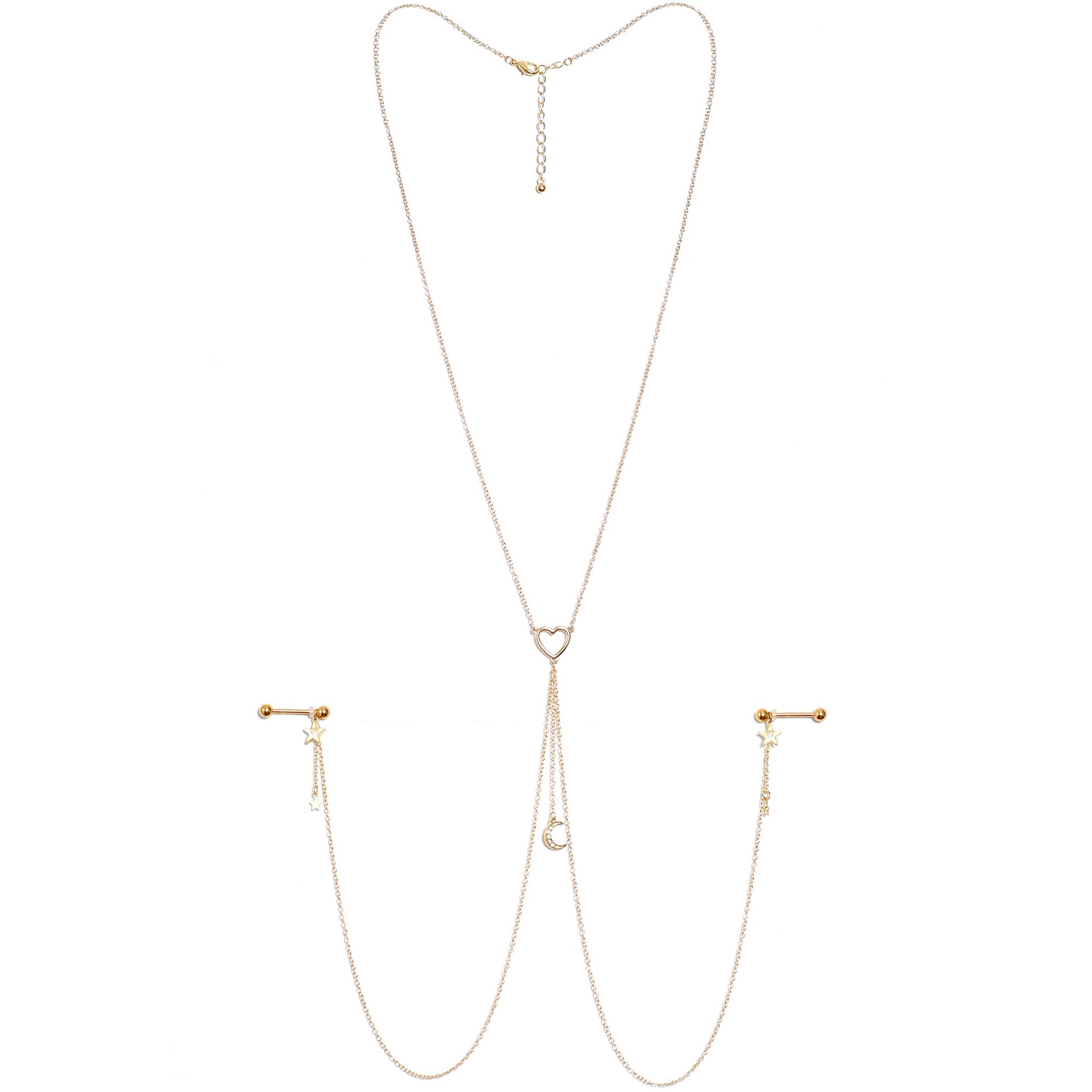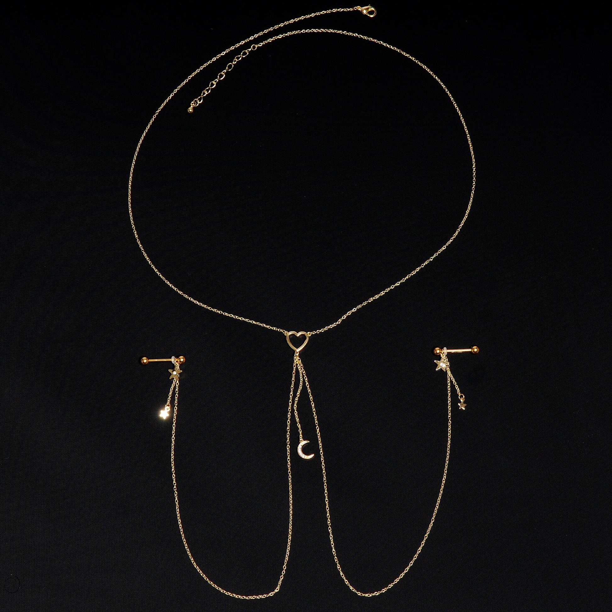 You're going to love this necklace to nipple chain to the stars and back! It features a 14" length gold tone necklace that has an openwork heart charm at the center. The heart has three lengths of matching chain dangling from it. The center one is 2" in length and supports gorgeous crescent moon charm set with clear gems. The other two chains are 12" and connect to the 16mm gold tone plated over 316L surgical grade stainless steel straight barbells with 5mm ball ends. Dangling from the barbells are gold tone star charms with a single clear gem and tiny unadorned gold tone star charms than dangle from a 1" length of chain. With this stunning necklace nipple chain, your nipple piercings are sure to be stars!Specifications