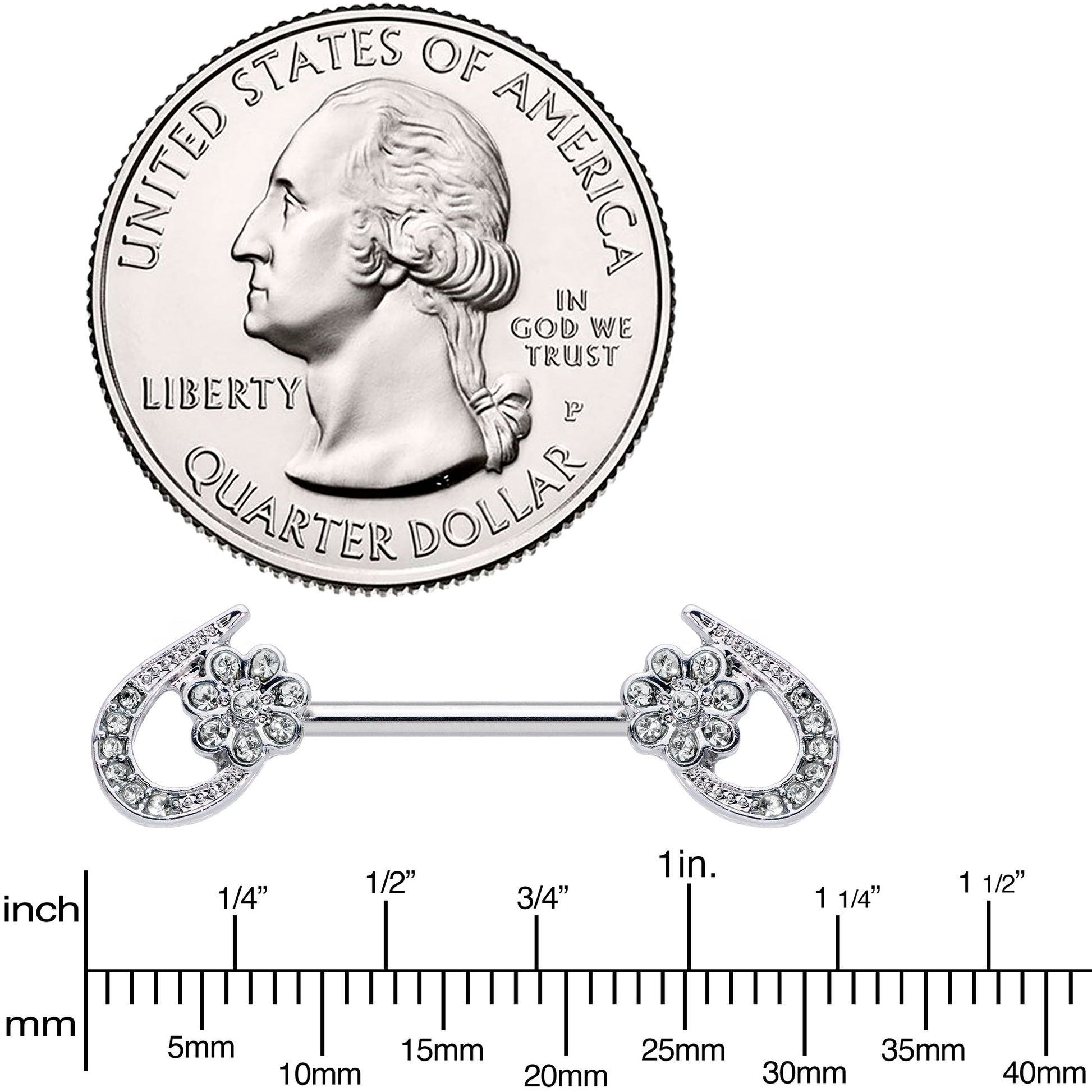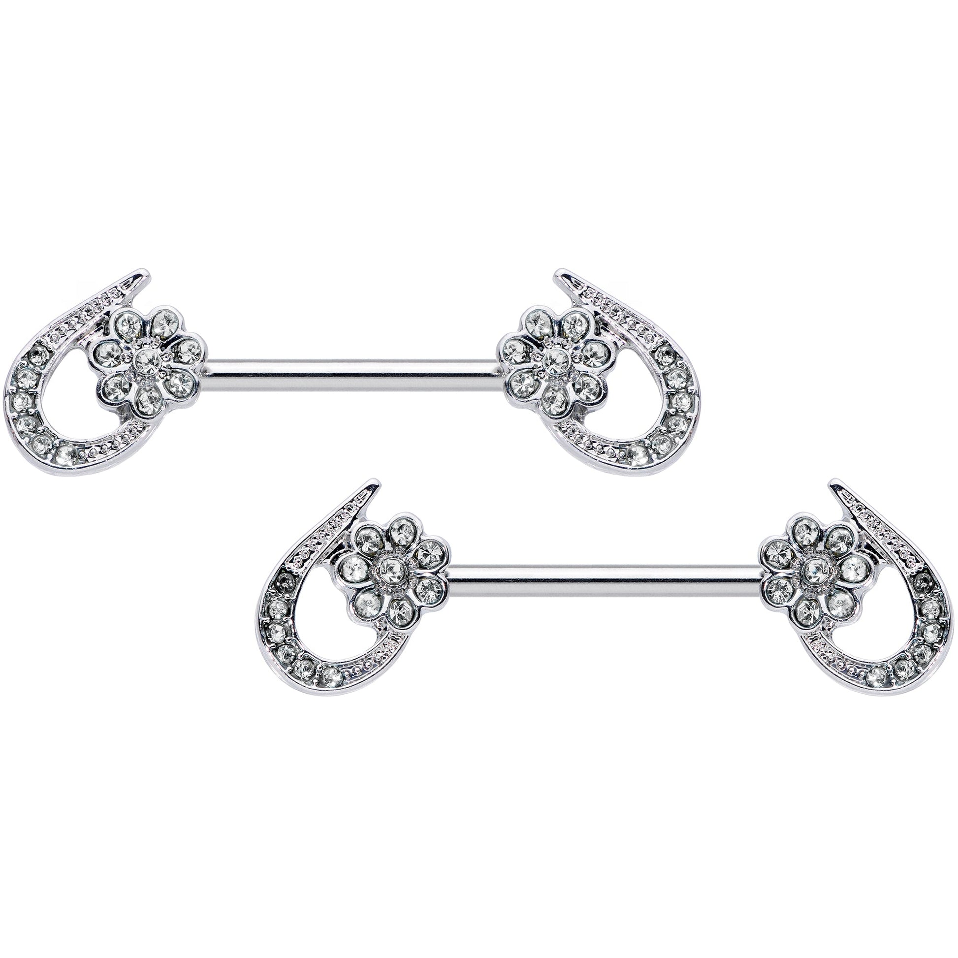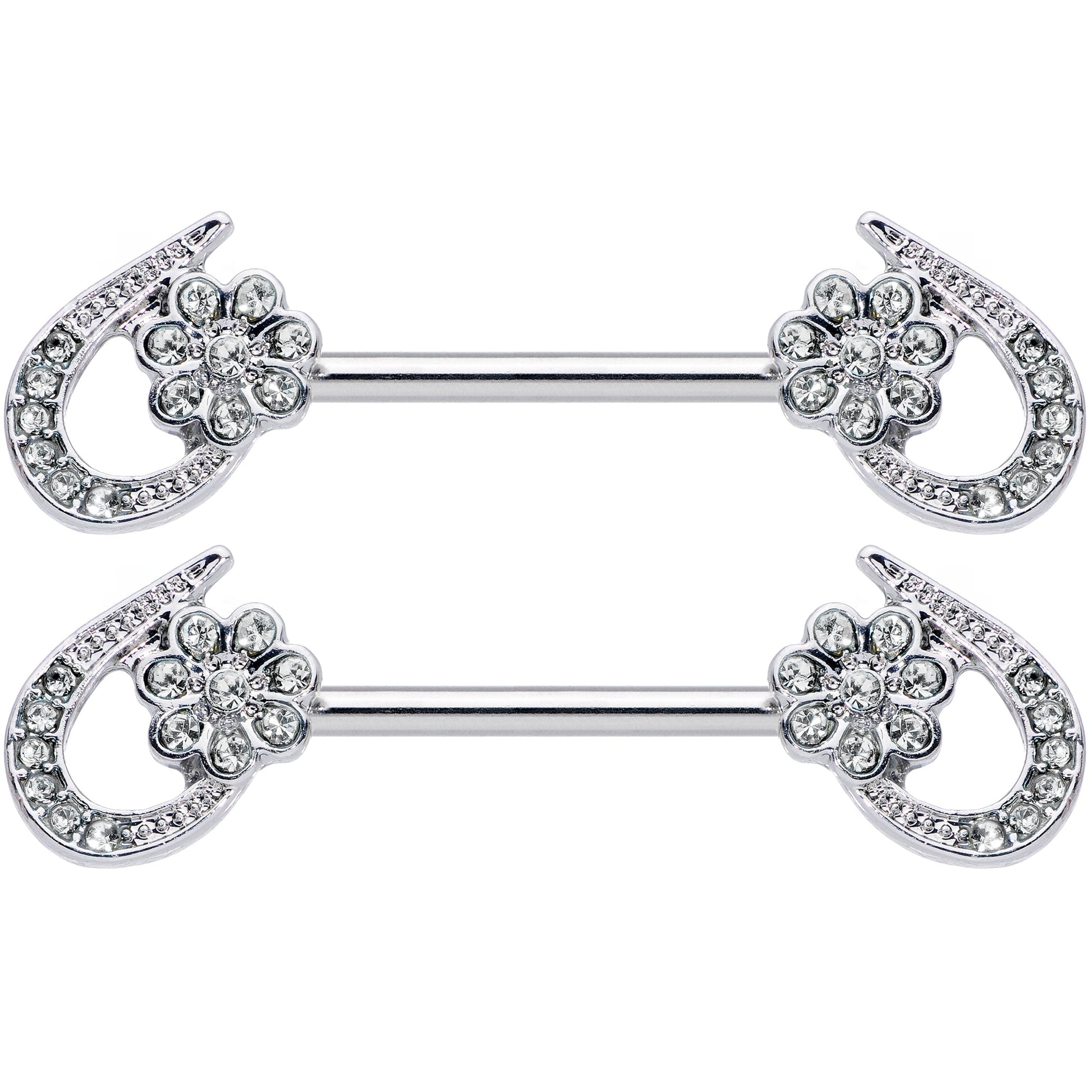 Half a heart this Valentine's Day with this 14 gauge nipple jewelry! It's made with 16mm durable 316L surgical grade stainless steel straight barbells. Each of the ends features a half heart charm set with clear gems. Between the heart's ends is a flower, composed of matching clear gems. These half hearts are sure to steal your whole heart with the graceful style they'll bring to your nipple piercings! Sold as a set of two.Specifications
