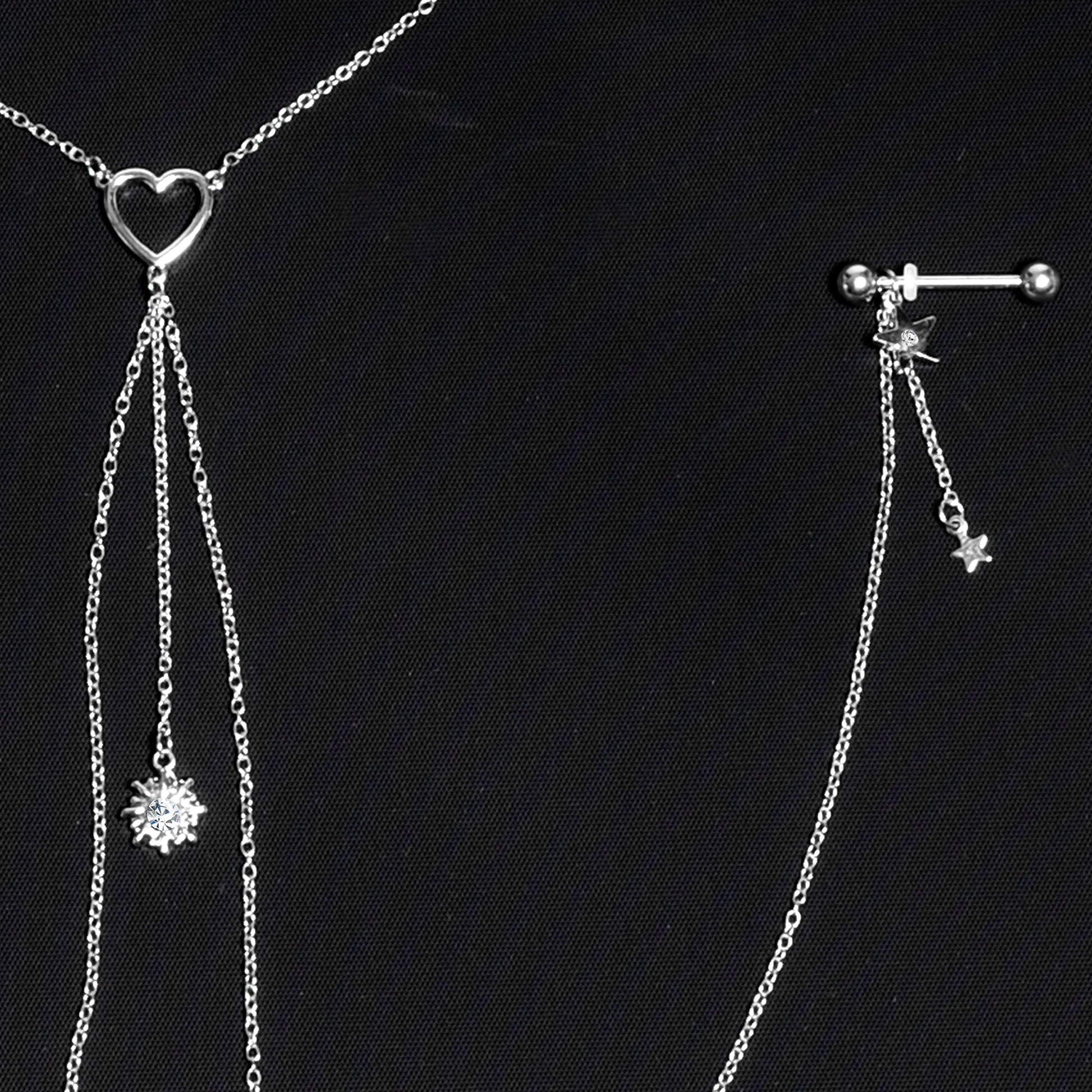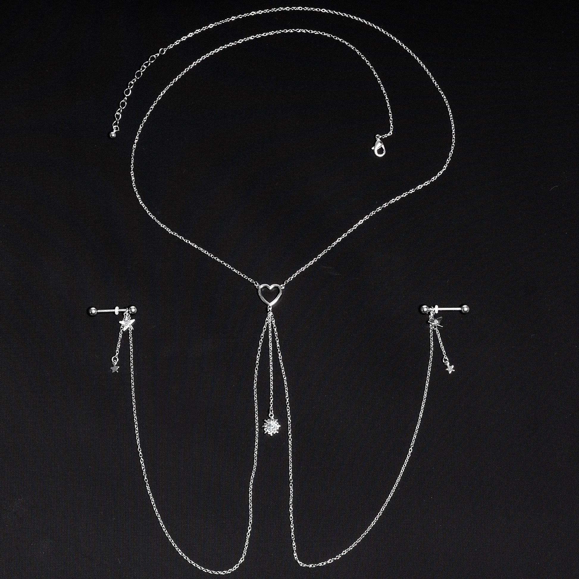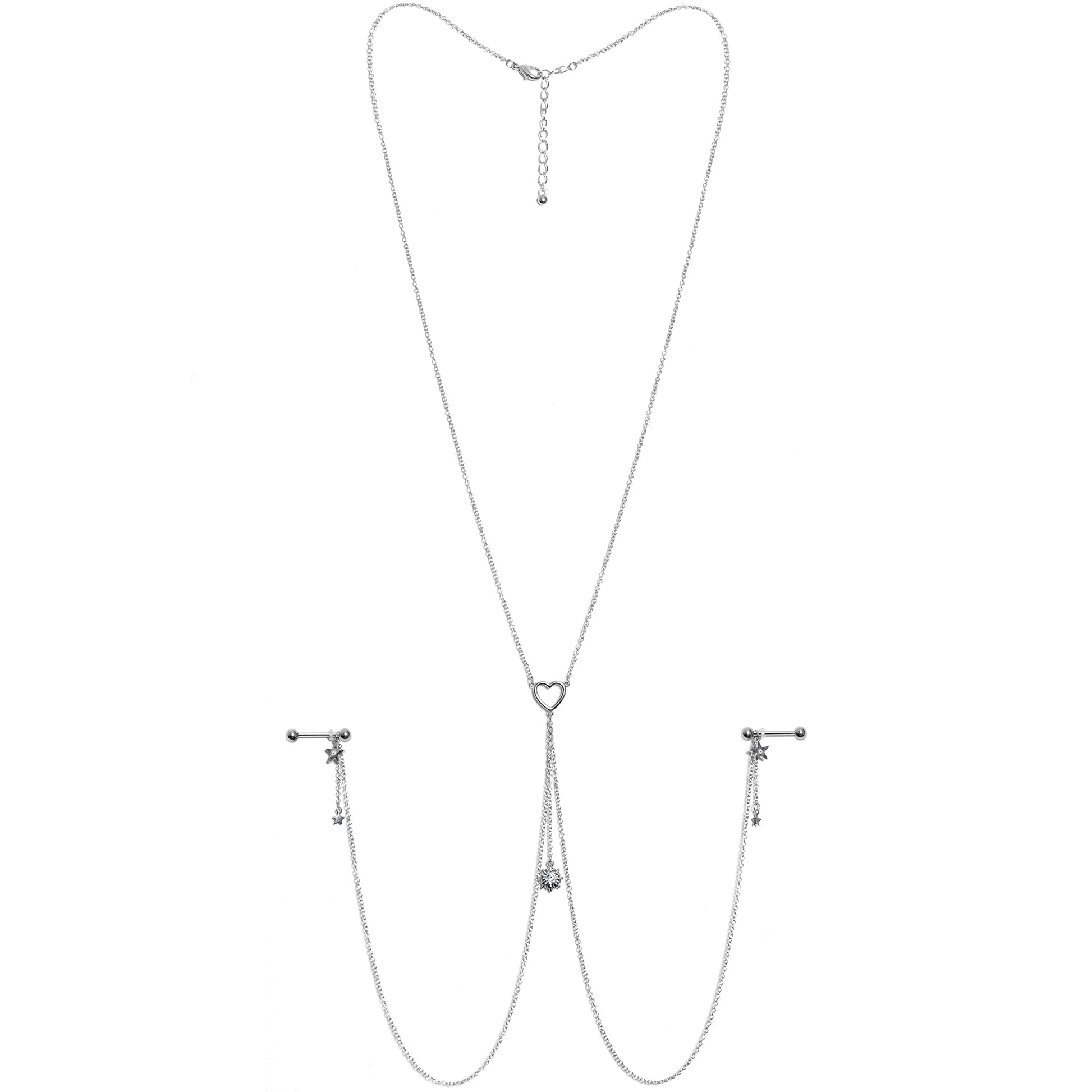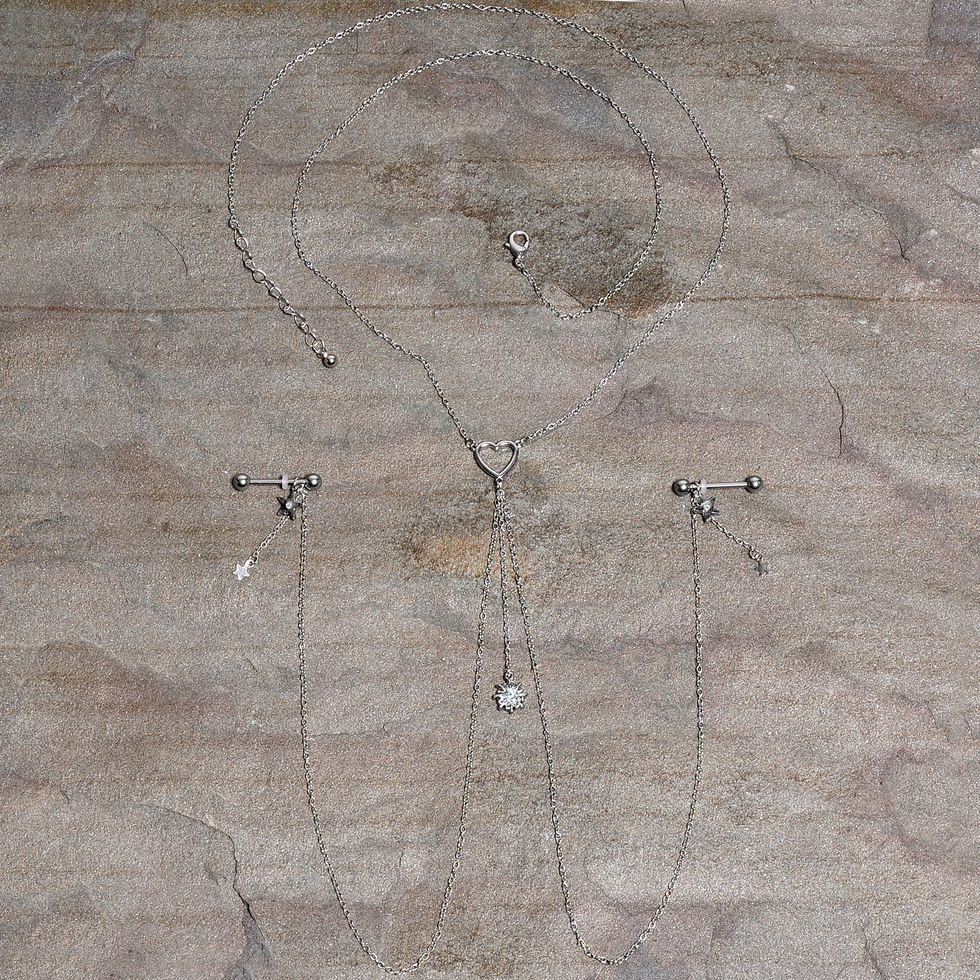 You're going to love this necklace to nipple chain to the stars and back! It features a 14" length necklace that has an openwork heart charm at the center. The heart has three lengths of matching chain dangling from it. The center one is 2" in length and supports gorgeous sun charm that's set with a clear gem in the center. The other two chains are 12" and connect to the 16mm durable 316L surgical grade stainless steel straight barbells with 5mm ball ends. Dangling from the barbells are star charms with clear gems and tiny unadorned stars than dangle from 1" lengths of chain. With this stunning necklace nipple chain, your pierced nipples are sure to be stars!Specifications