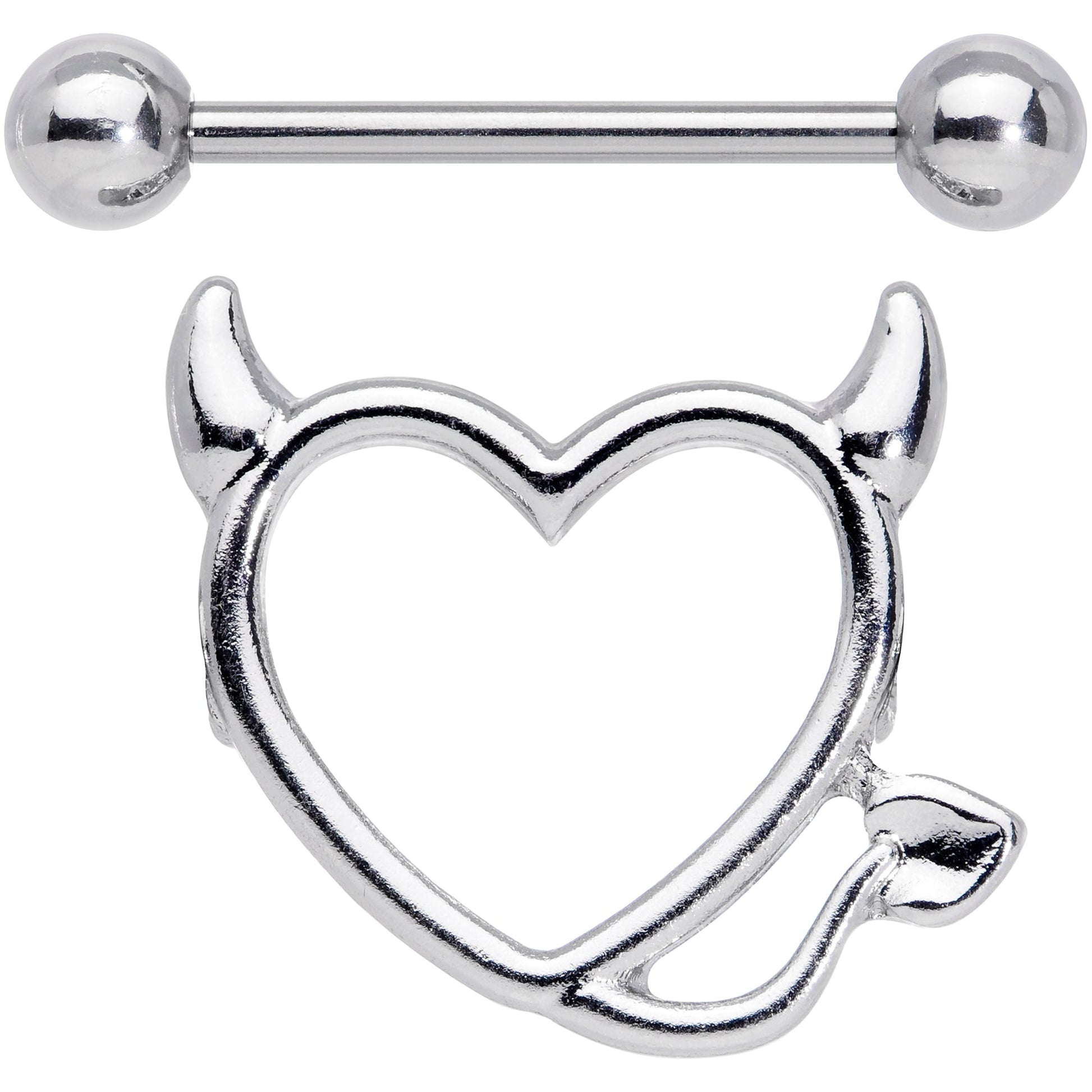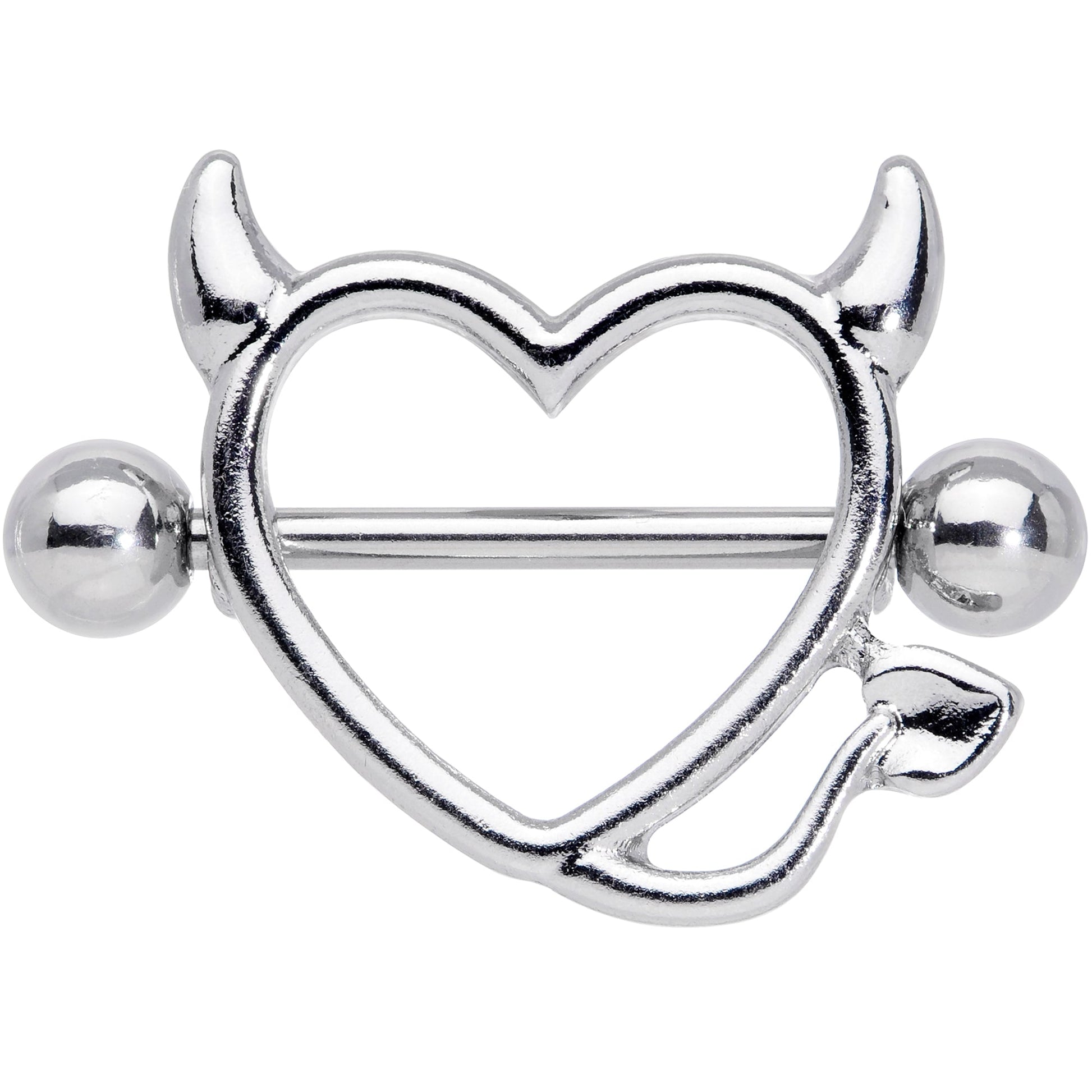 Be a little naughty...and love every minute with these 14 gauge nipple shields! They're made with 16mm durable 316L surgical grade stainless steel straight barbells with 5mm ball ends. The shield portion features a hollow heart shape with tiny horns and a pointed tail - perfect for showing off your devilish side! When worn with the shields, the barbells have a wearable length of 9/16" for a secure fit and the shields feature a 3/8" rise to give you the look you crave. So be a little evil....your nipple piercings will love you for it! Sold as a set of two.Specifications