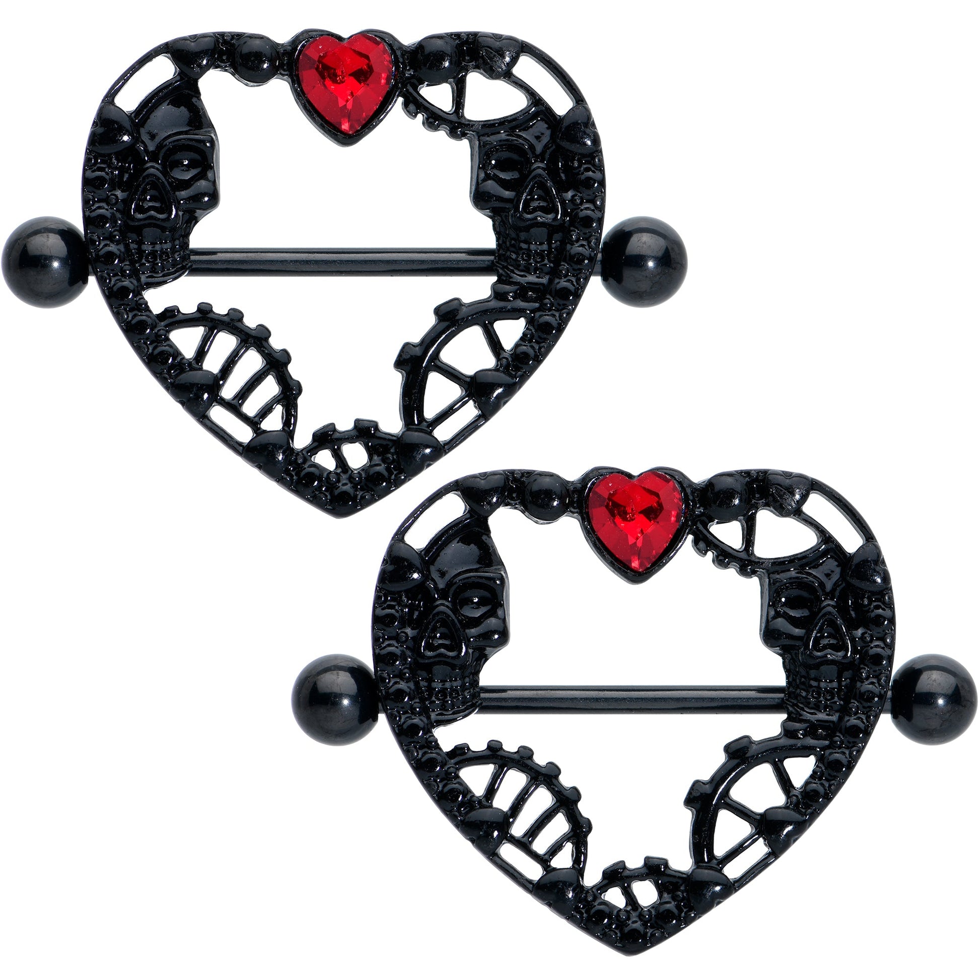 14G 7/8 Red Gem Black Skeleton Steampunk Heart Nipple Shield Set