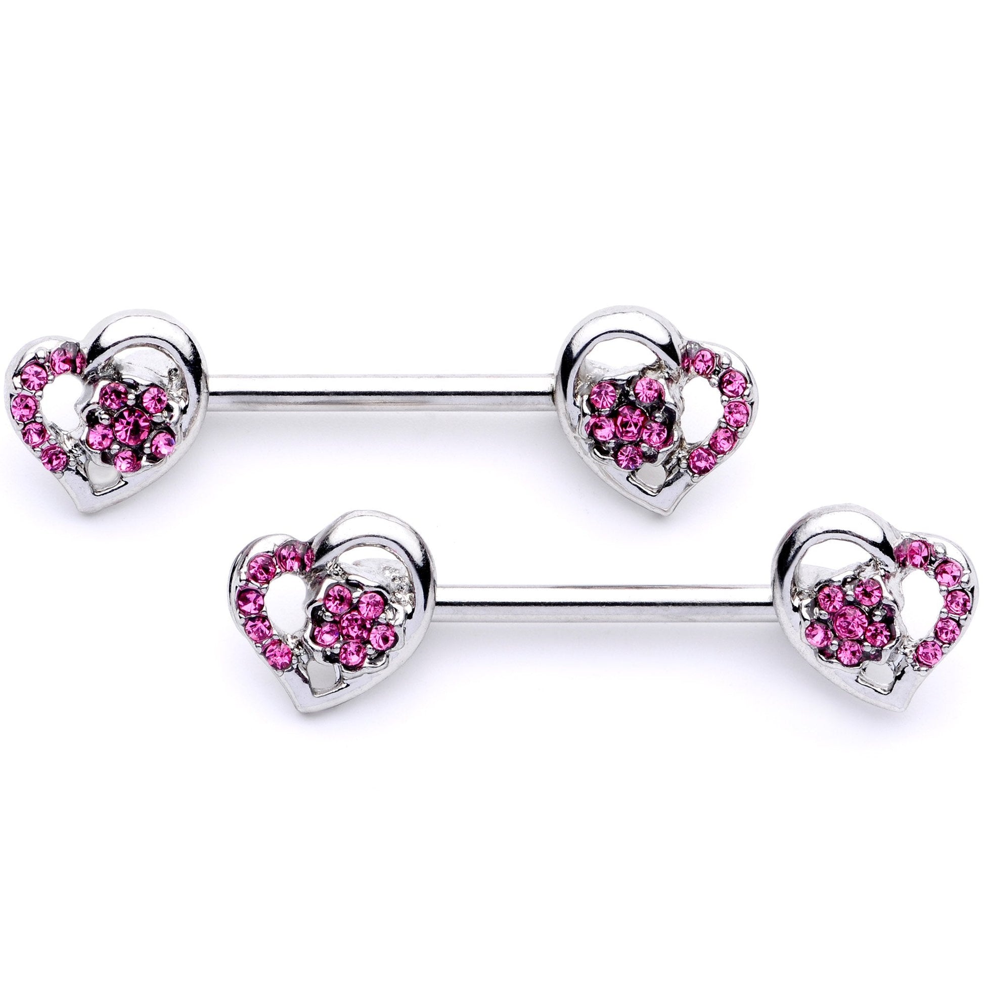 14 Gauge 9/16" 1/2" Pink Gem Floral Hearts BCR Barbell Nipple Ring Set