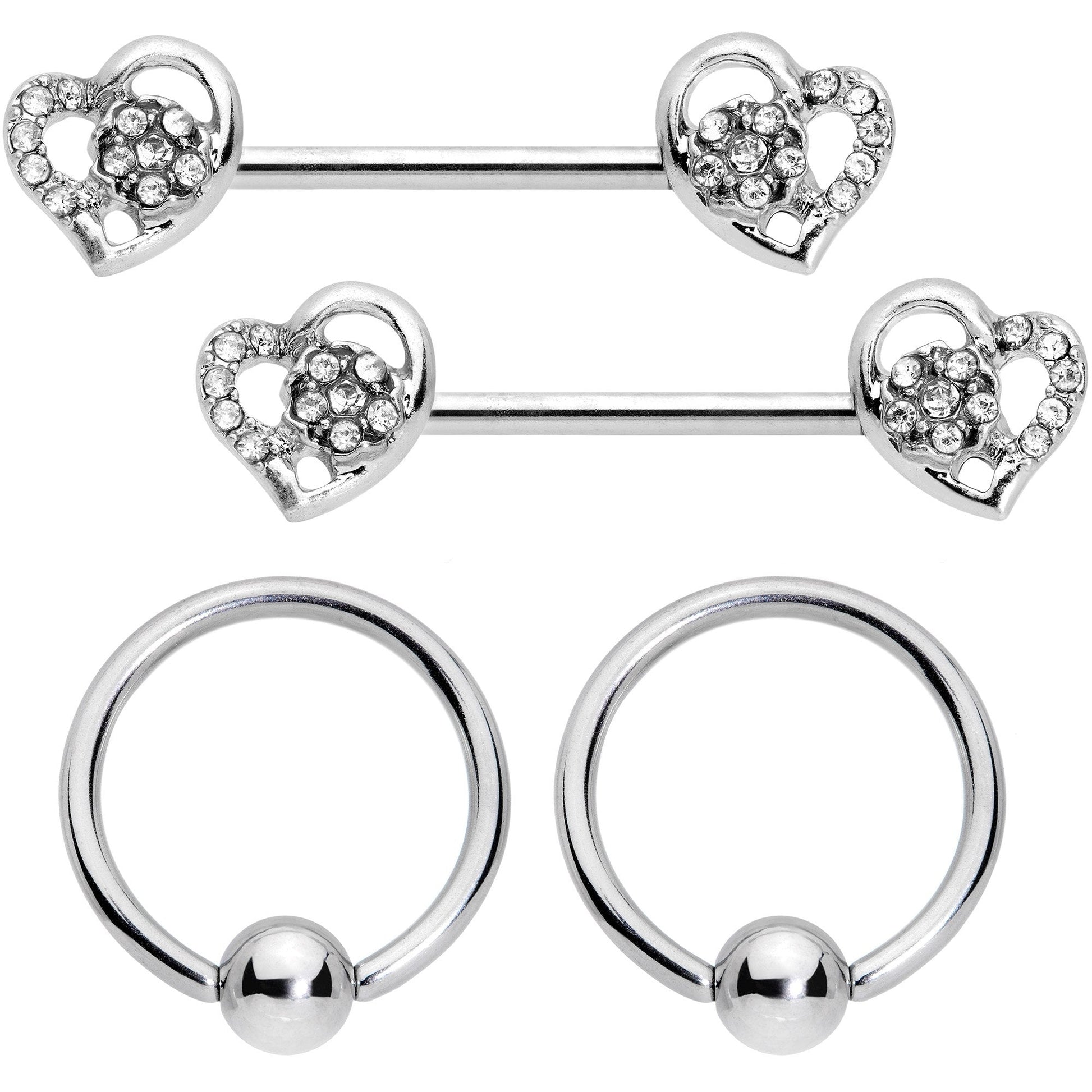 Whether you want simple or fancy, straight barbell or captive ring, this set of 14 gauge nipple jewelry has you covered! First, there's a set of 8mm durable 316L surgical grade stainless steel captive bead rings. They're simple, timeless, a classic look with effortless style. Also included are a pair of 14mm durable 316L surgical grade stainless steel straight barbells. These have ends shaped like hearts, encrusted with clear gems on one side and with a clear gem embellishment on the other. The asymmetrical look adds visual interest while keeping the overall look luxurious and extravagant without letting it become over-the-top. This set is a whole wardrobe of nipple jewelry in and of itself! Sold as a set of four.Specifications