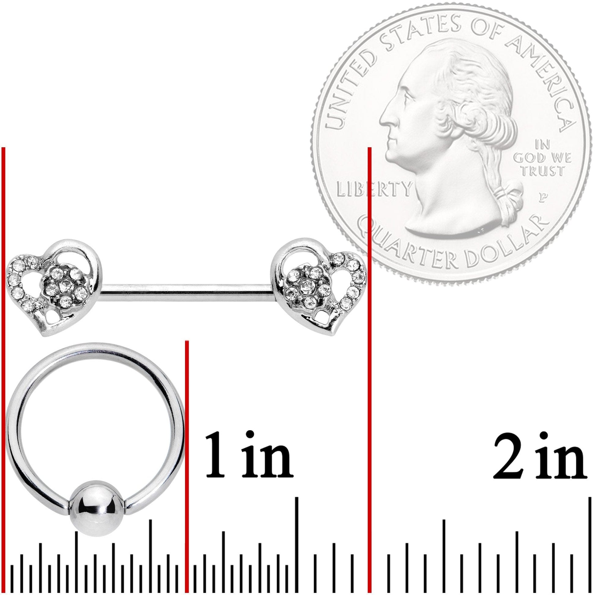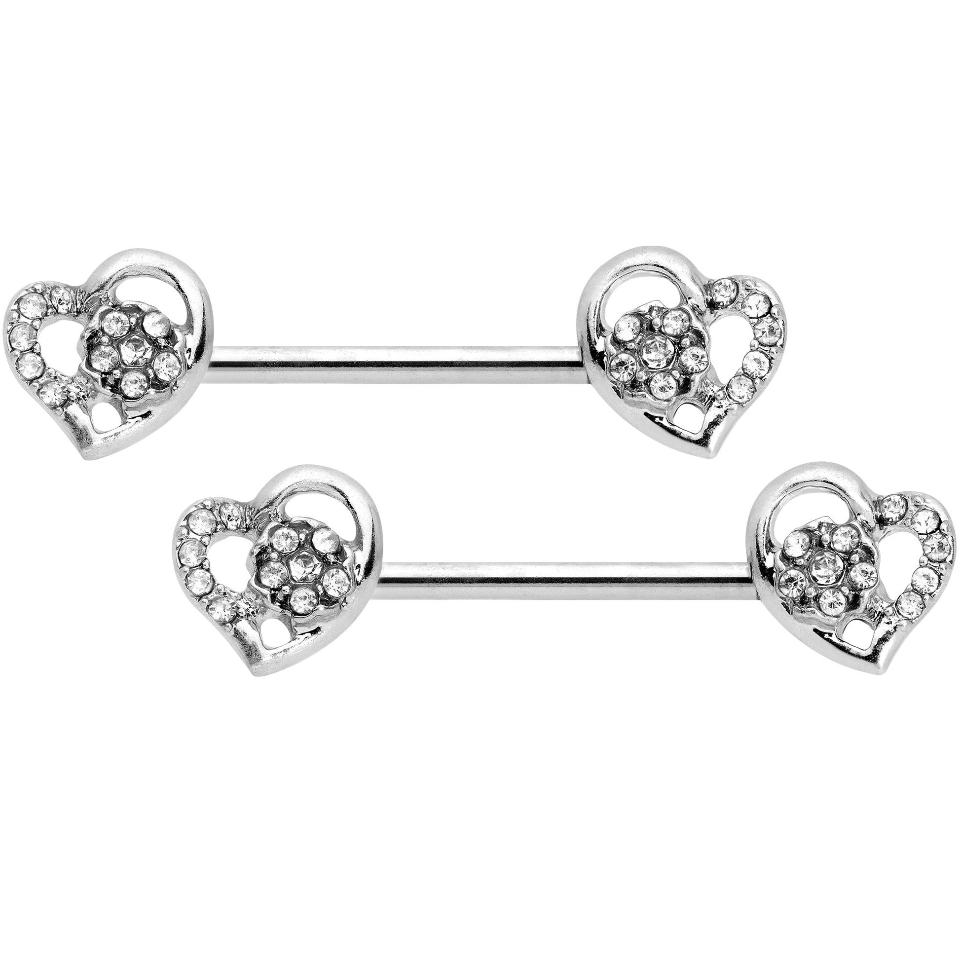 14 Gauge 9/16" 5/16" Clear Gem Hearts BCR Barbell Nipple Ring Set