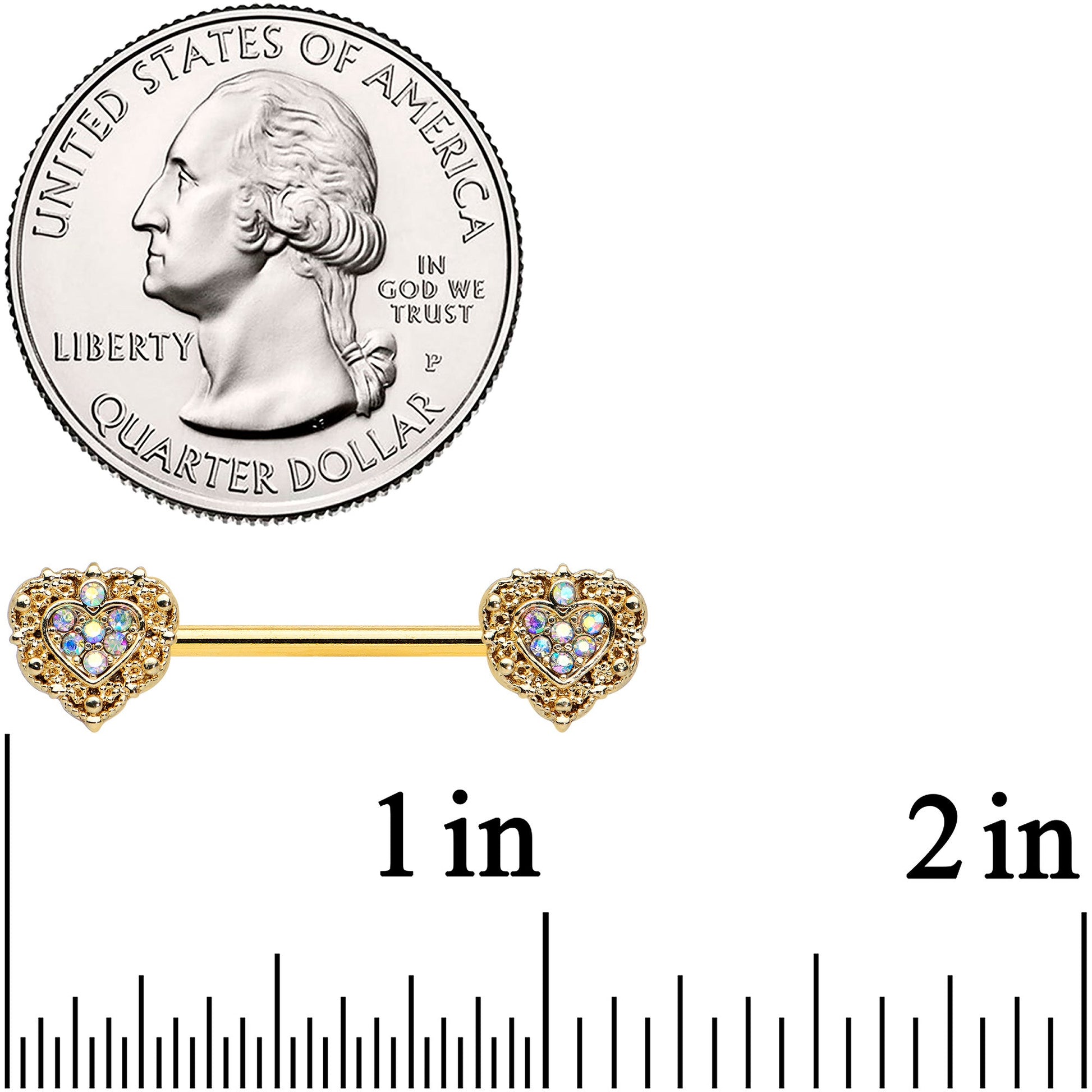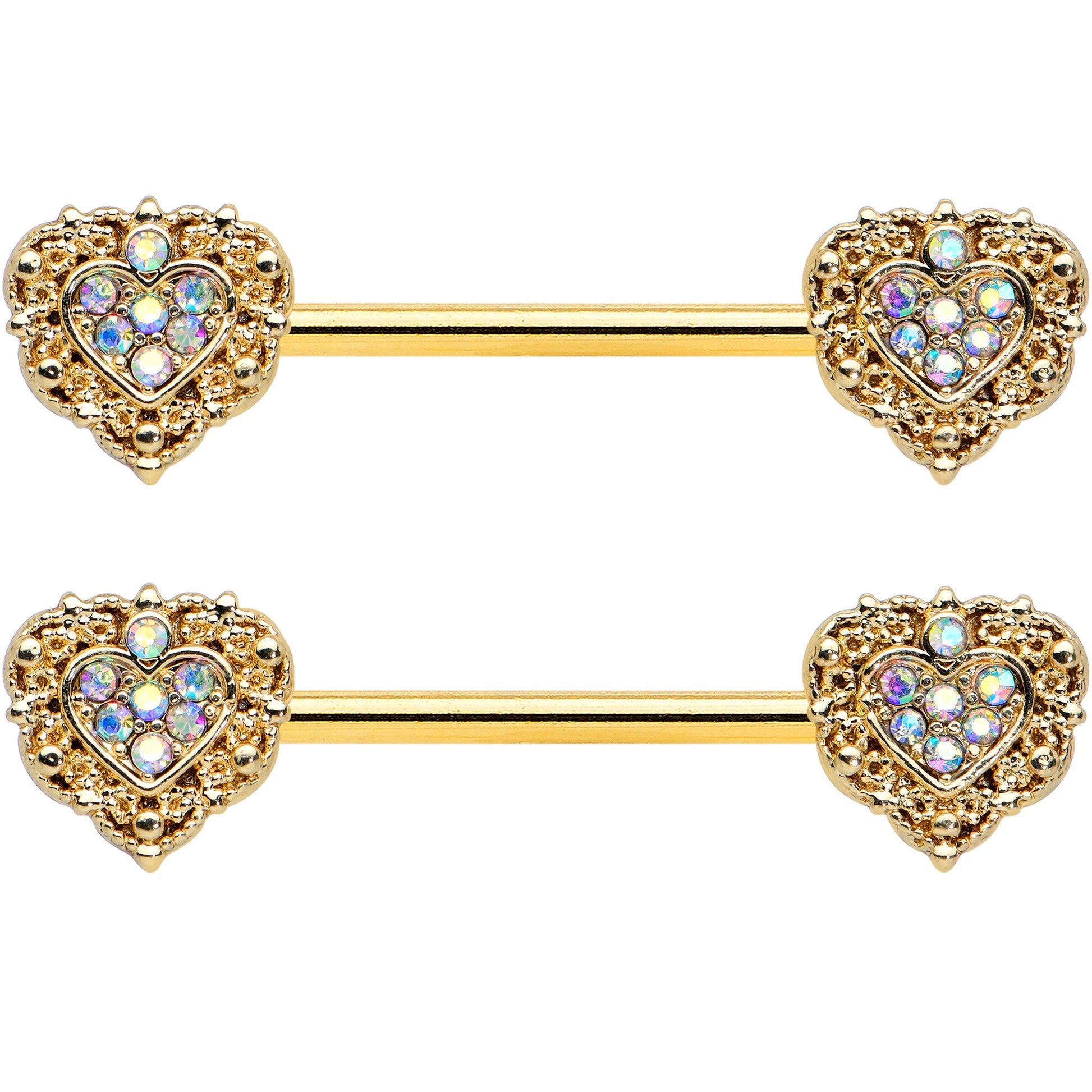 Look luxe without breaking the bank with this 14 gauge nipple jewelry! It's made with 14mm gold tone PVD over 316L surgical grade stainless steel straight barbells. Each of the ends features a heart charm, with ornate textured detailing and a cluster of aurora gems at the center. You're going to fall in love with the baroque look of these heart-themed nipple piercing rings! Sold as a set of two.Specifications