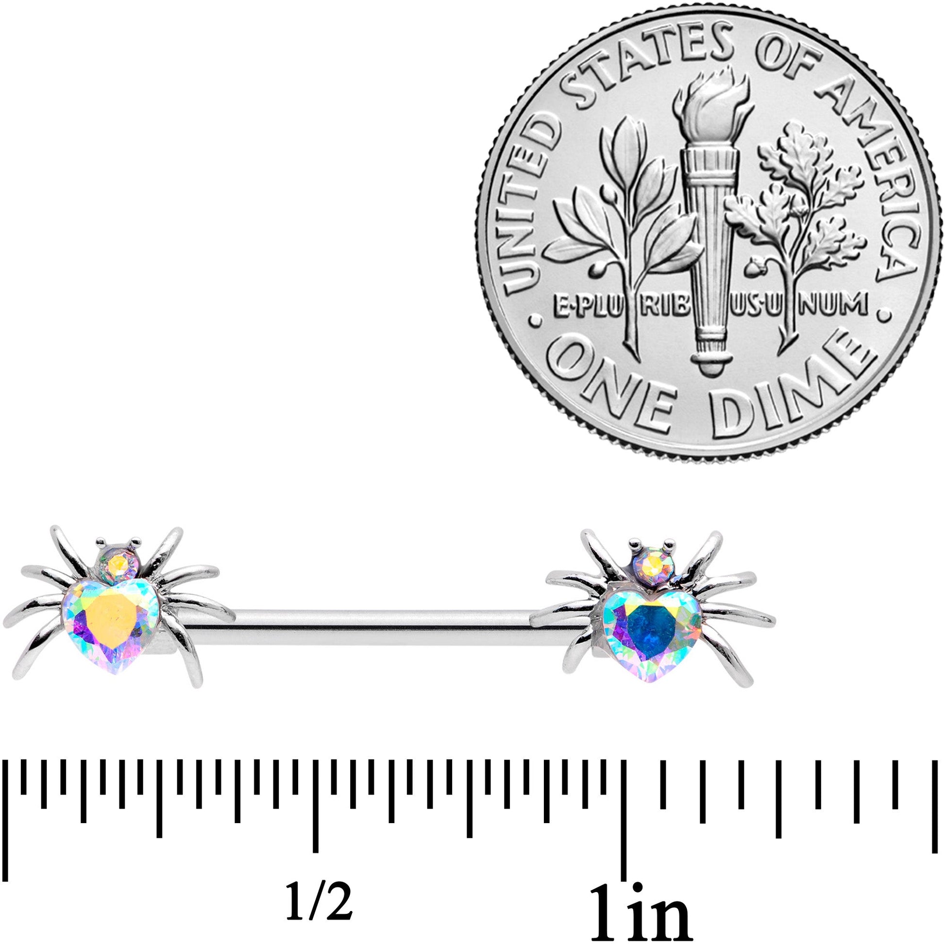 These little spiders will give you the shivers.....but not shivers of fear! This 14 gauge nipple jewelry is made with 14mm durable 316L surgical grade stainless steel straight barbells with Halloween spider charm ends. The spider's bodies are made of Valentine's Day heart-shaped aurora gems with the head composed of smaller aurora gems. So whether you love and cherish creepy crawlies or appreciate arachnids, this nipple jewelry is sure to snare you in their web! Sold as a set of two.Specifications