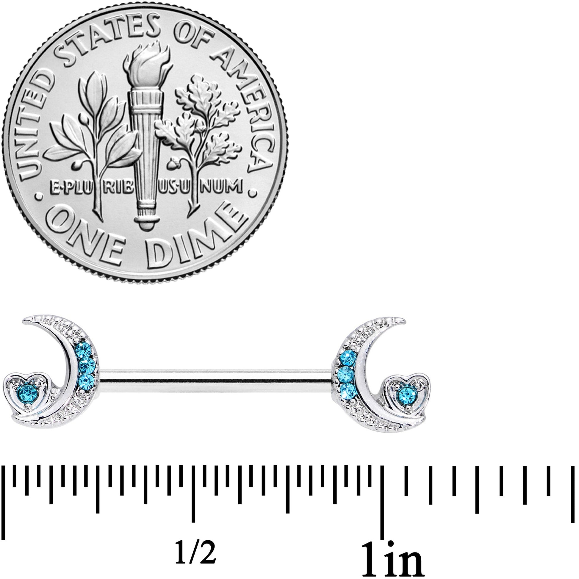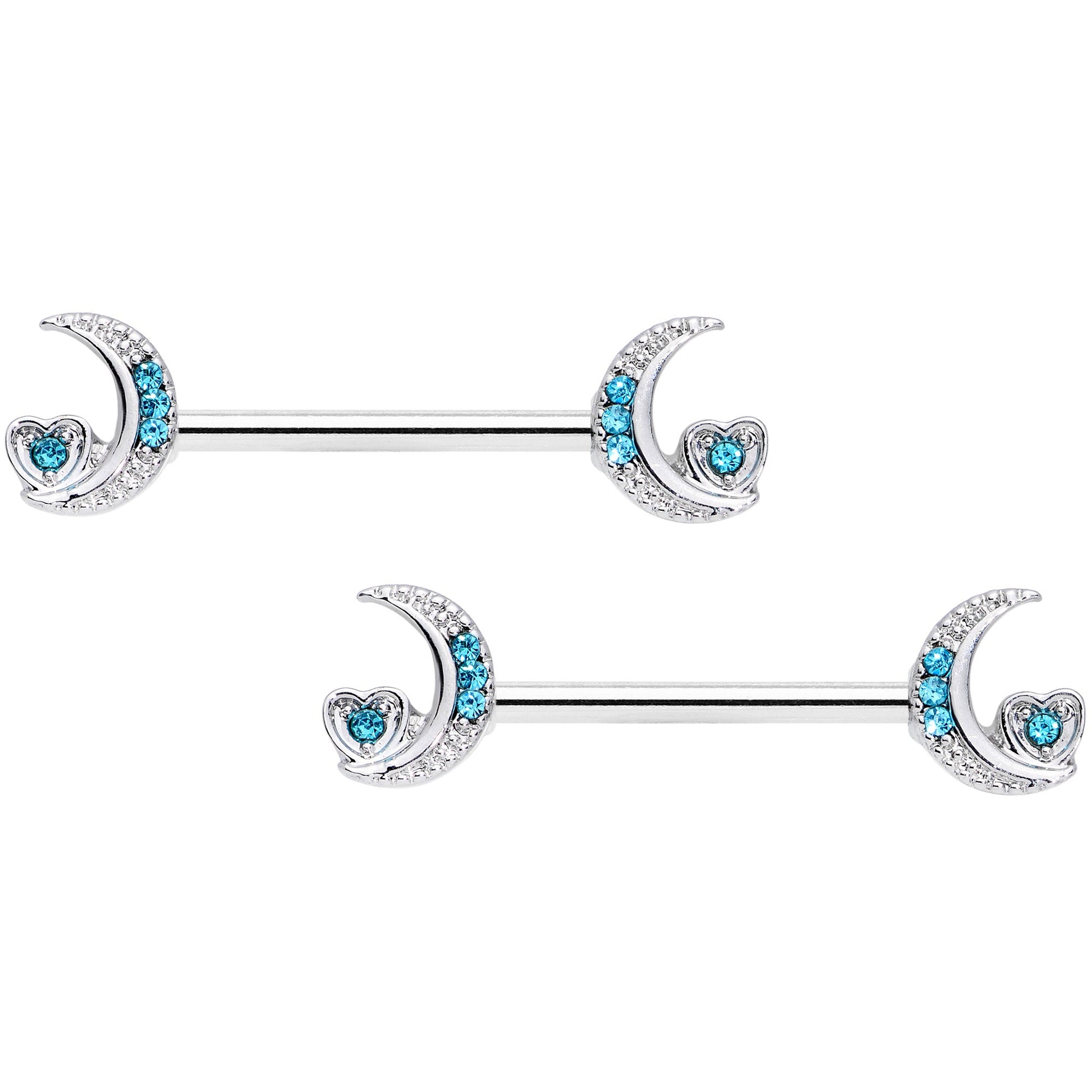 If you love all things lunar, this 14 gauge nipple jewelry is sure to win your heart! It's made with 14mm durable 316L surgical grade stainless steel straight barbells. The ends feature crescent moon charms set with blue gems. Sitting in the moon's lower curve is a heart set with a matching blue gem for a cohesive appearance. If you're mad about the moon, you'll love having these in your nipple piercings! Sold as a set of two.Specifications