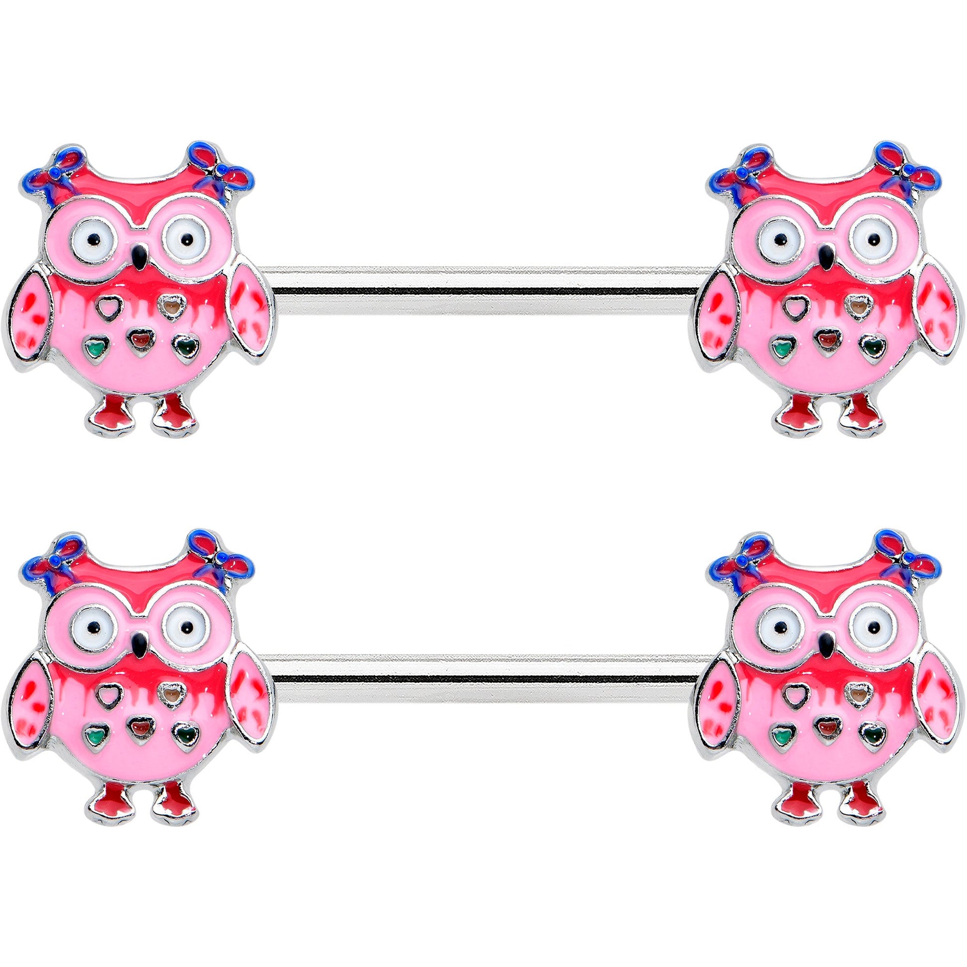 Someone's all gussied up for Valentine's Day...like the owls on this 14 gauge nipple jewelry! It's made with 14mm durable 316L surgical grade stainless steel straight barbells. Each of the ends features a pink inlaid owl charm. The owls are embellished with little hairbows and also features little hearts on their chests. Give your nipple piercings some whimsical avian action with these charming nipple piercing rings! Sold as a set of two.Specifications