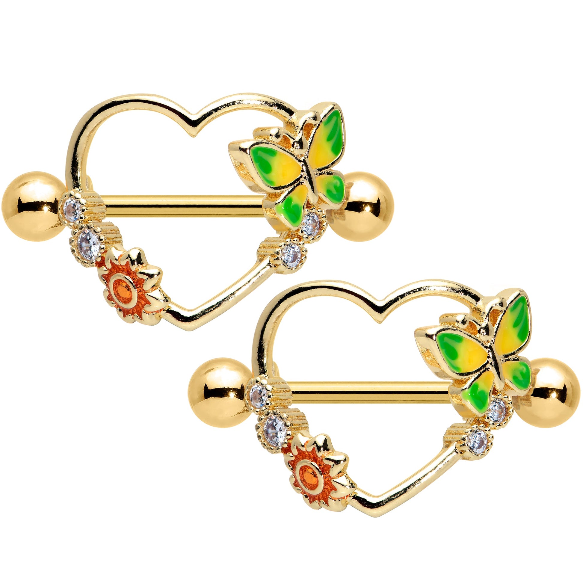 If your heart is open, show the world with this 14 gauge nipple jewelry! It's made with 14mm wearable length gold tone PVD over 316L surgical grade stainless steel straight barbells with 5mm ball ends. The shield portions each feature an open heart design, flanked by a green butterfly and a tiny sun. The hearts are further embellished with small clear cubic zirconia gems for an added touch of glamour. Keep your heart open - you're sure to fall in love with these heart-themed nipple piercing rings! Sold as a set of two.Specifications