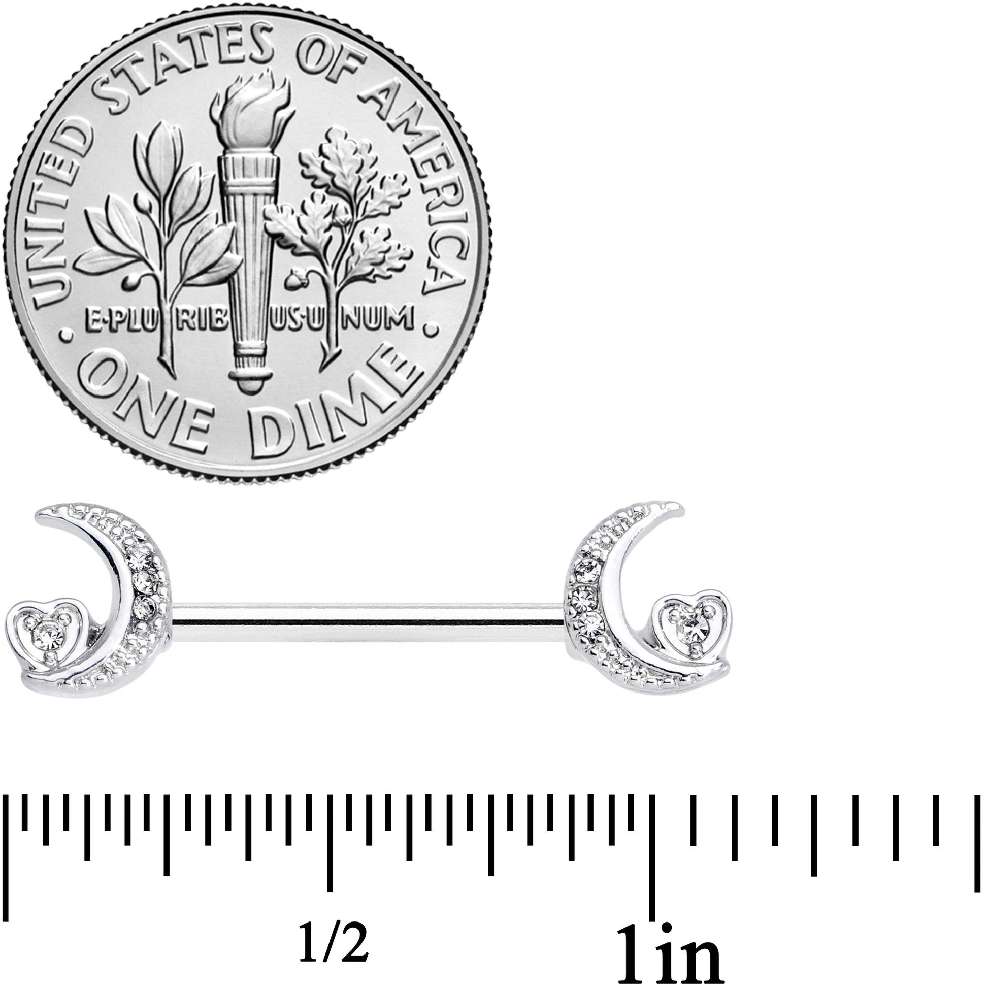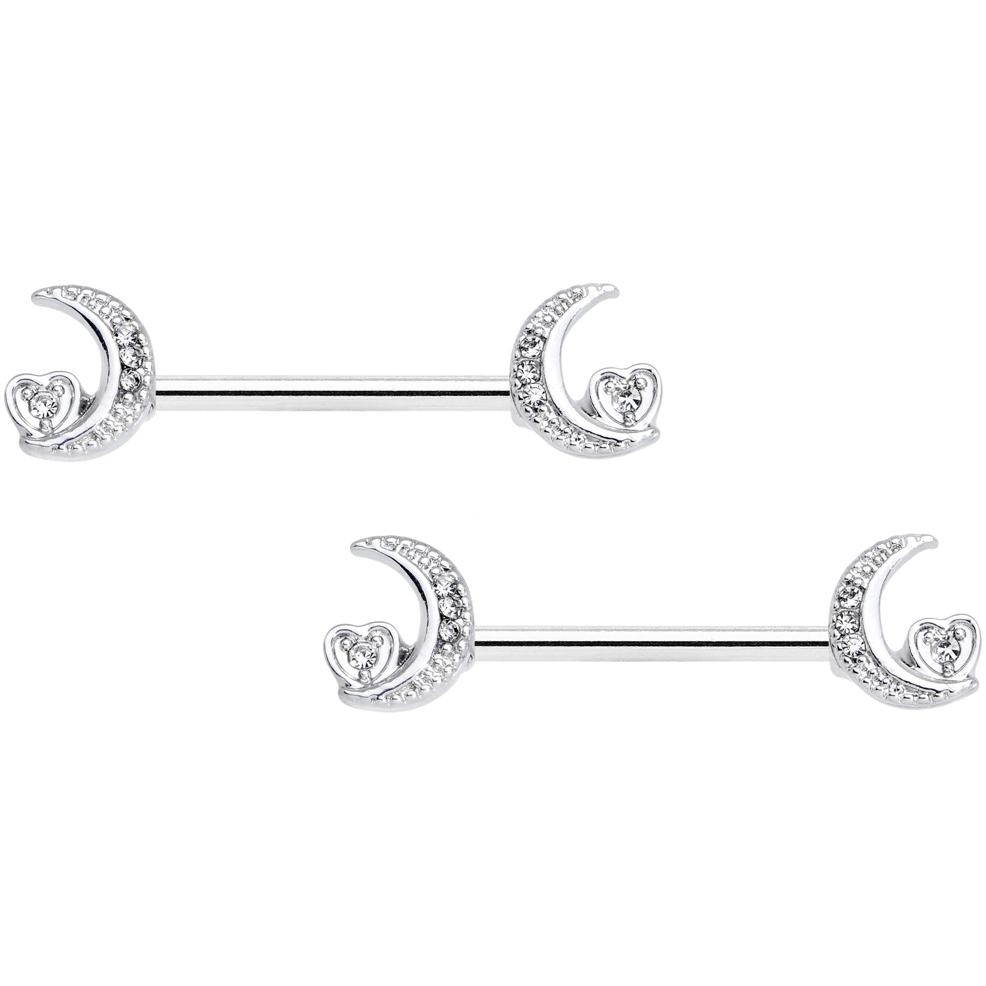 Love your nipple piercings all the way to the moon with these elegant 14 gauge nipple rings! They're made with a 14mm durable 316L surgical grade stainless steel straight barbells. The ends feature crescent moon charms set with several small clear cubic zirconia gems. Set on the bottom curve of each moon is a small heart, also set with a clear cubic zirconia gem. Send your heart into orbit this Valentine's Day with this lovely lunar nipple jewelry! Sold as a set of two.Specifications