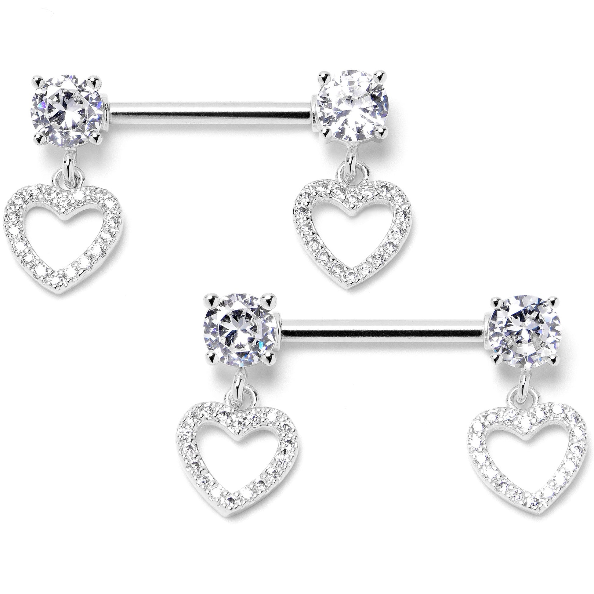 Pave the way to style with this 14 gauge nipple jewelry. It's made with 14mm durable 316L surgical grade stainless steel straight barbells with forward facing, clear cubic zirconia gem ends. Dangling beneath them are heart charms, with open centers for an airy look. The hearts are paved with matching clear cubic zirconia gems for look that adds a luxurious touch. You're sure to fall in love with these ornate heart nipple piercing rings. Sold as a set of two.Specifications