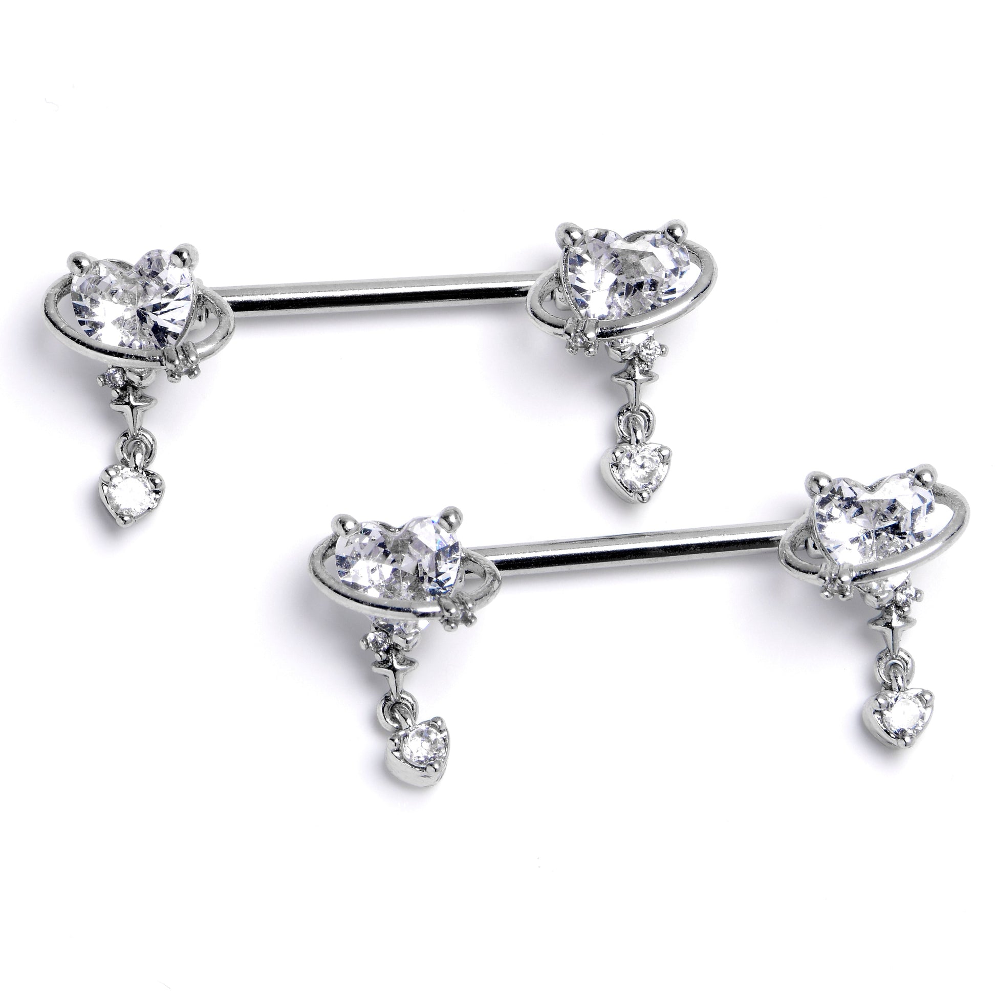 14 Gauge 9/16 Clear CZ Gem Saturn Heart Dangle Nipple Ring Set