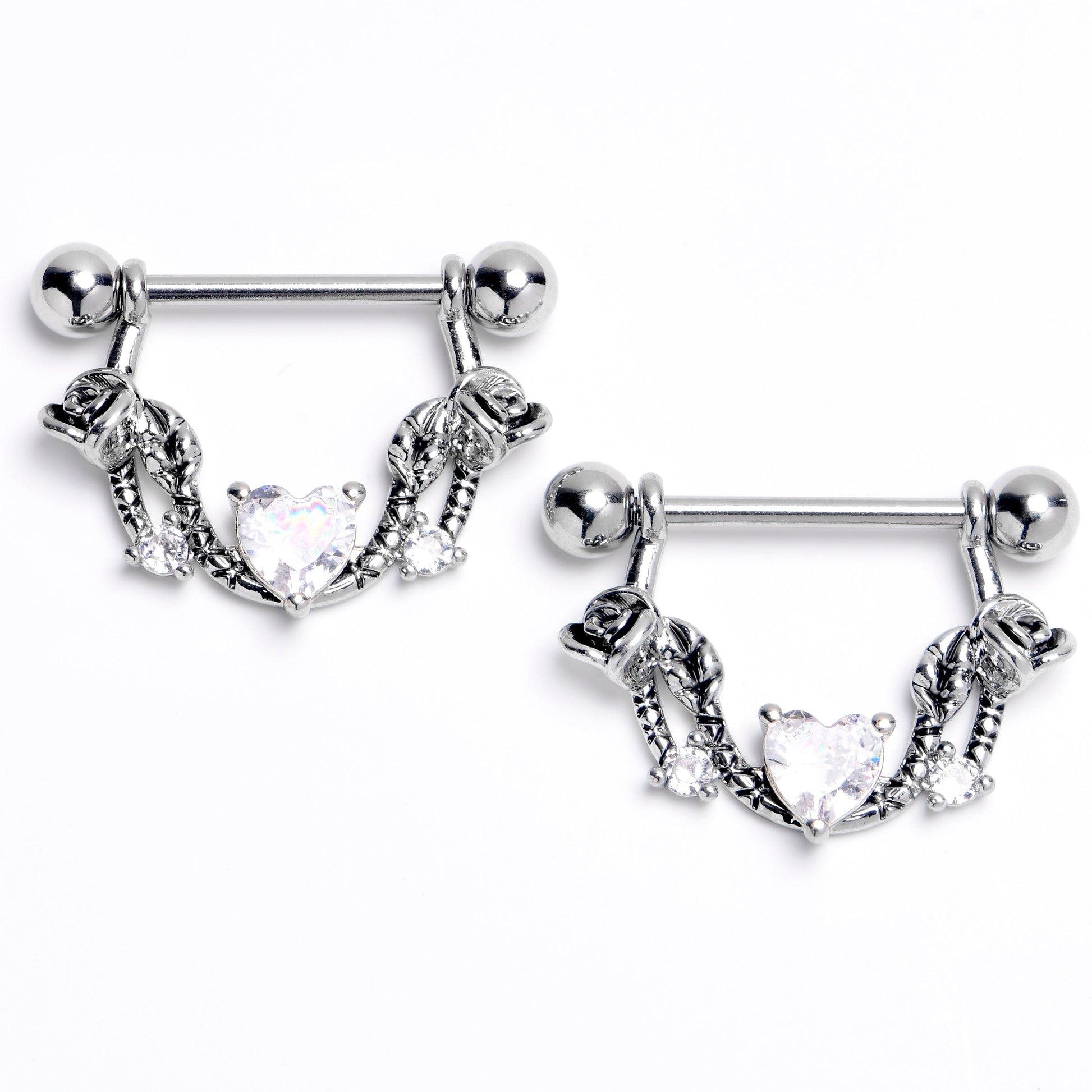 Let love slither into your heart with this 14 gauge nipple jewelry, It is made with 14mm durable 316L surgical grade stainless steel straight barbells with 5mm ball ends. Each barbell supports a clear cubic zirconia heart charm, set in a serpentine styled setting, with more clear cubic zirconia gem heart embellishments at the ends. You will totally fall in love with these nipple piercing rings. Sold as a set of two.Specifications