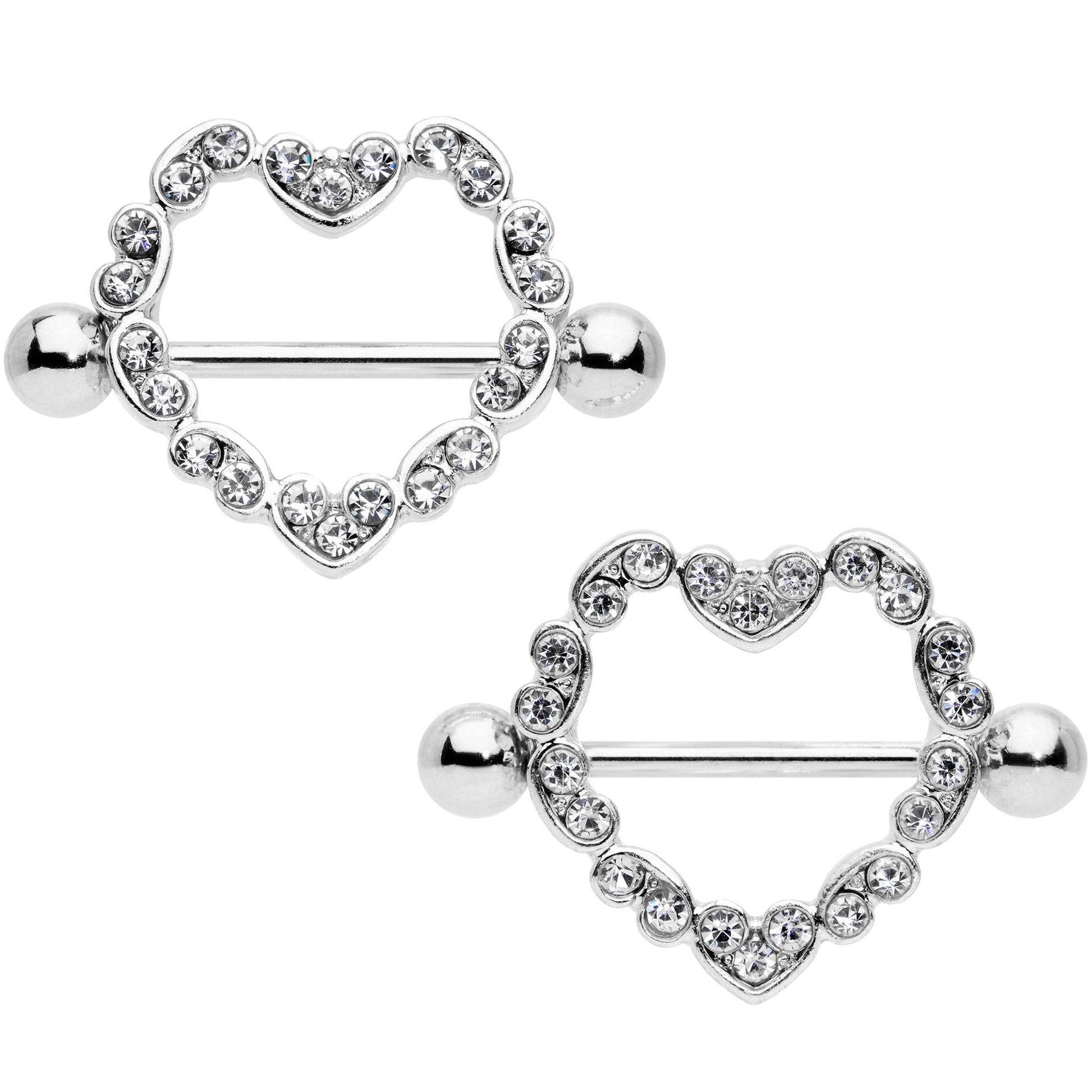 Show off just how much you love your 14 gauge nipple piercings with these Valentine-shaped nipple rings! These shields are made with 14mm durable 316L surgical grade stainless steel straight barbells. They feature a heart shaped halo of clear gems with a 13mm diameter opening for that perfect fit that will truly fill your heart with love. Sold as a set of two.