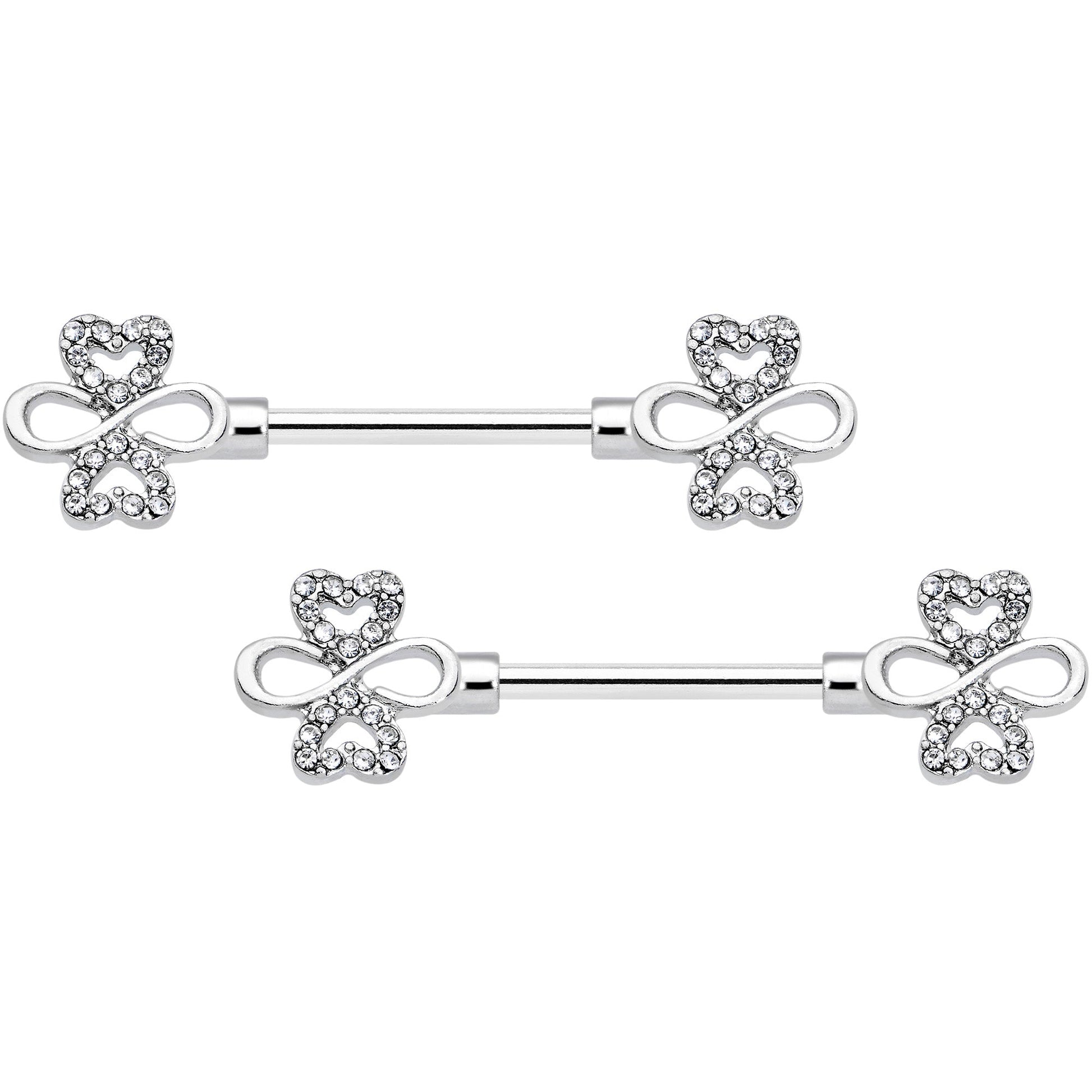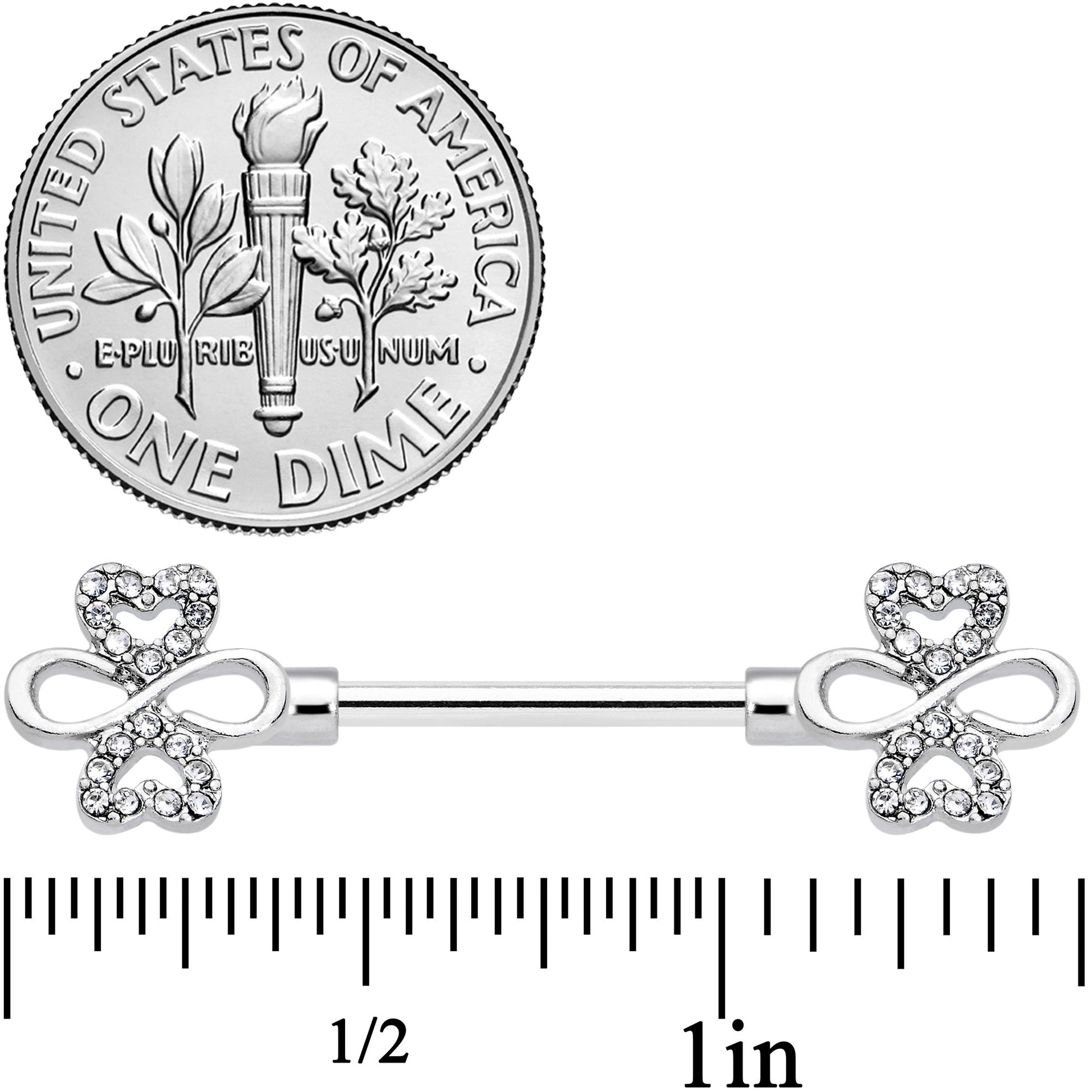If your love of all things Irish is infinite then show it off with this 14 gauge nipple jewelry! It's made with 14mm durable 316L surgical grade stainless steel straight barbells and each features a shamrock charm with the top and bottom leaves shaped like hearts and paved with small clear gems. The side leaves curve around like a figure eight to form the symbol for infinity. The overall look is both opulent and airy and absolutely perfect for celebrating St Patrick's Day! Sold as a set of two.Specifications