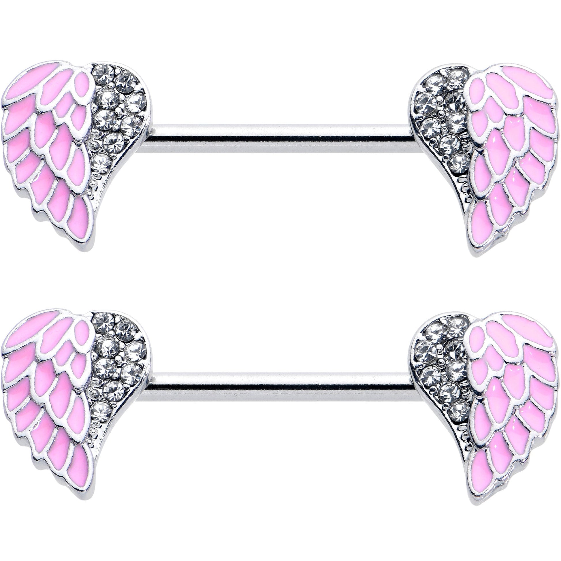 Give yourself a heavenly new look with this 14 gauge nipple jewelry. It's made with 14mm durable 316L surgical grade stainless steel straight barbells. Each of the ends features a heart shaped charm featuring an angel's wings, with one side paved with clear gems. The other sides feature pink inlay and simply styled feather details. Let your look and your spirit soar with these stylish and spiritual nipple piercing rings. Sold as a set of two.Specifications