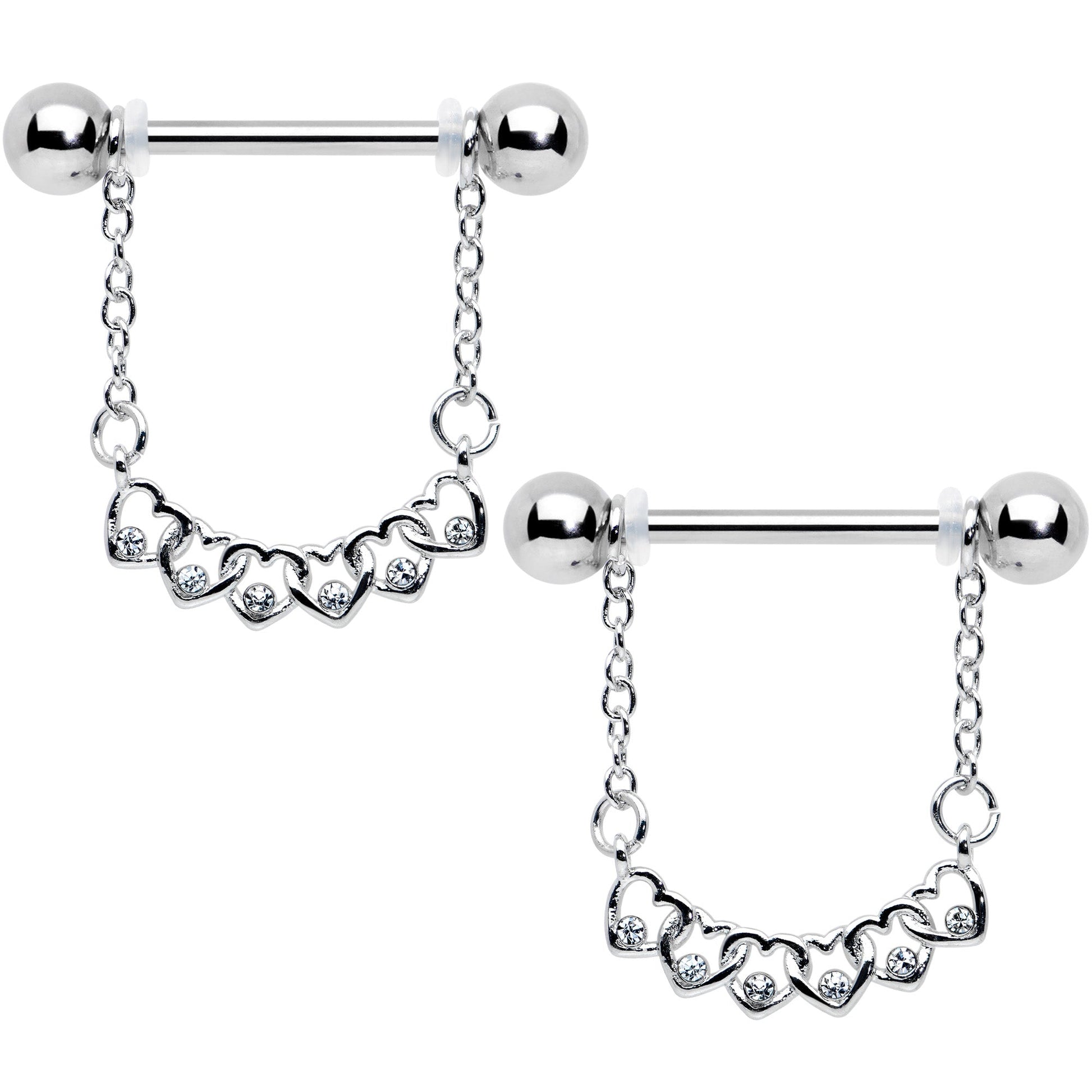 Love means the linking of hearts...like on this 14 gauge nipple jewelry! It's made with 14mm durable 316L surgical grade stainless steel straight barbells with 5mm ball ends. Each one has a pair of chains hanging from it, which supports a hearts charm. The hearts are linked together and each one is embellished with a small clear gem. Link up for love this Valentine's Day with these heart-themed nipple piercing rings! Sold as a set of two.Specifications