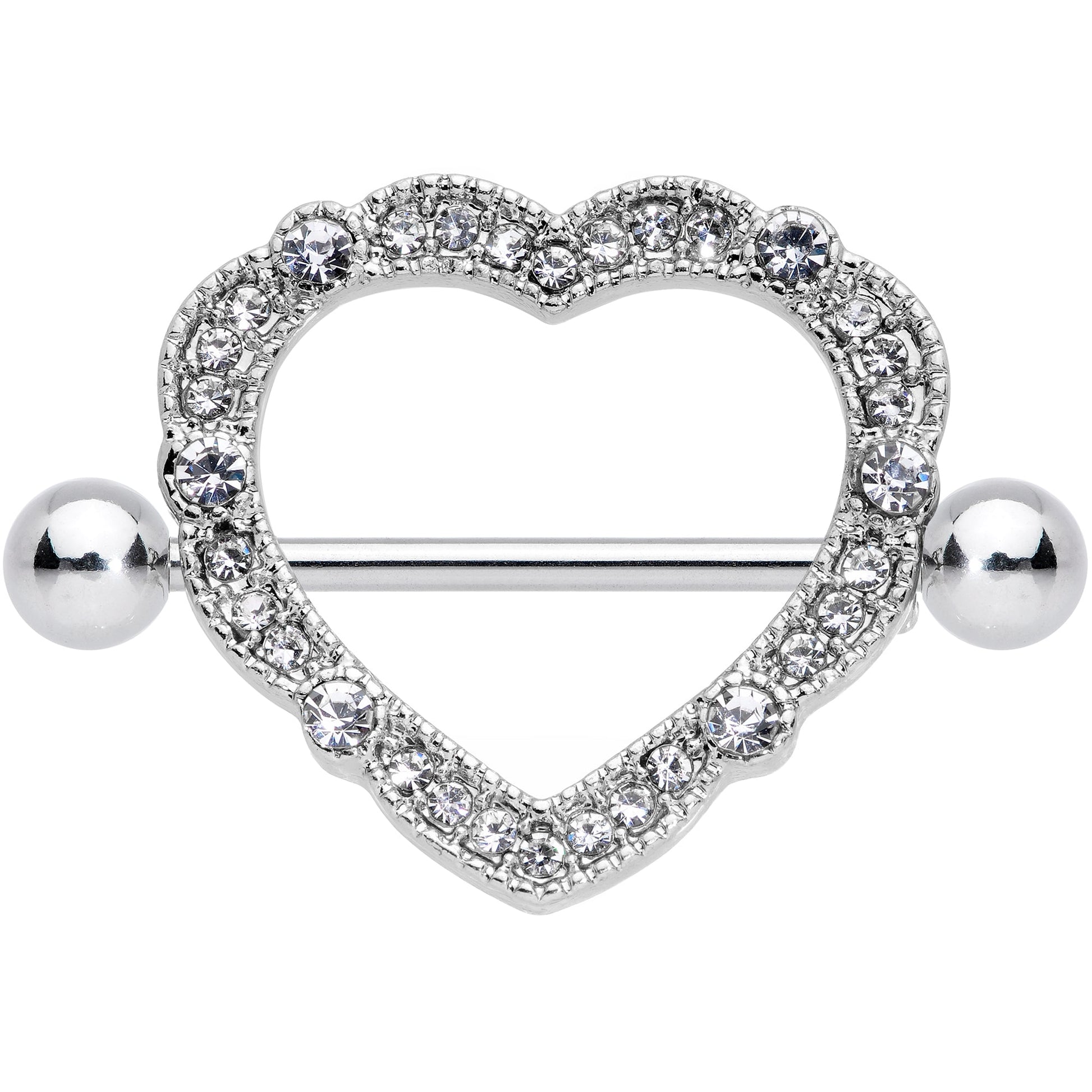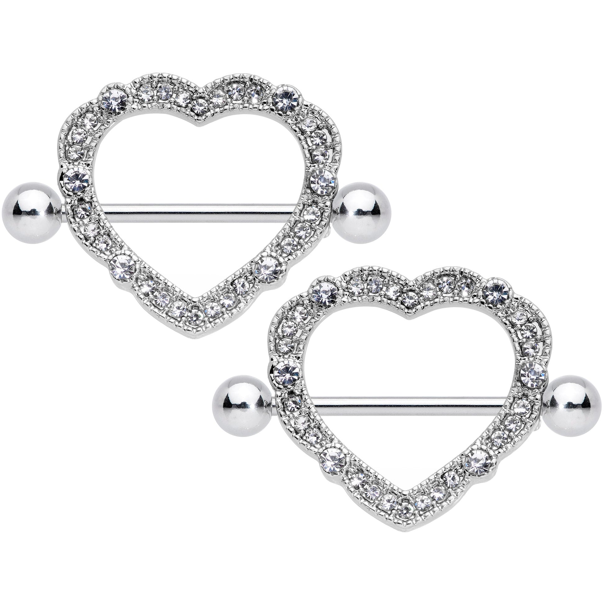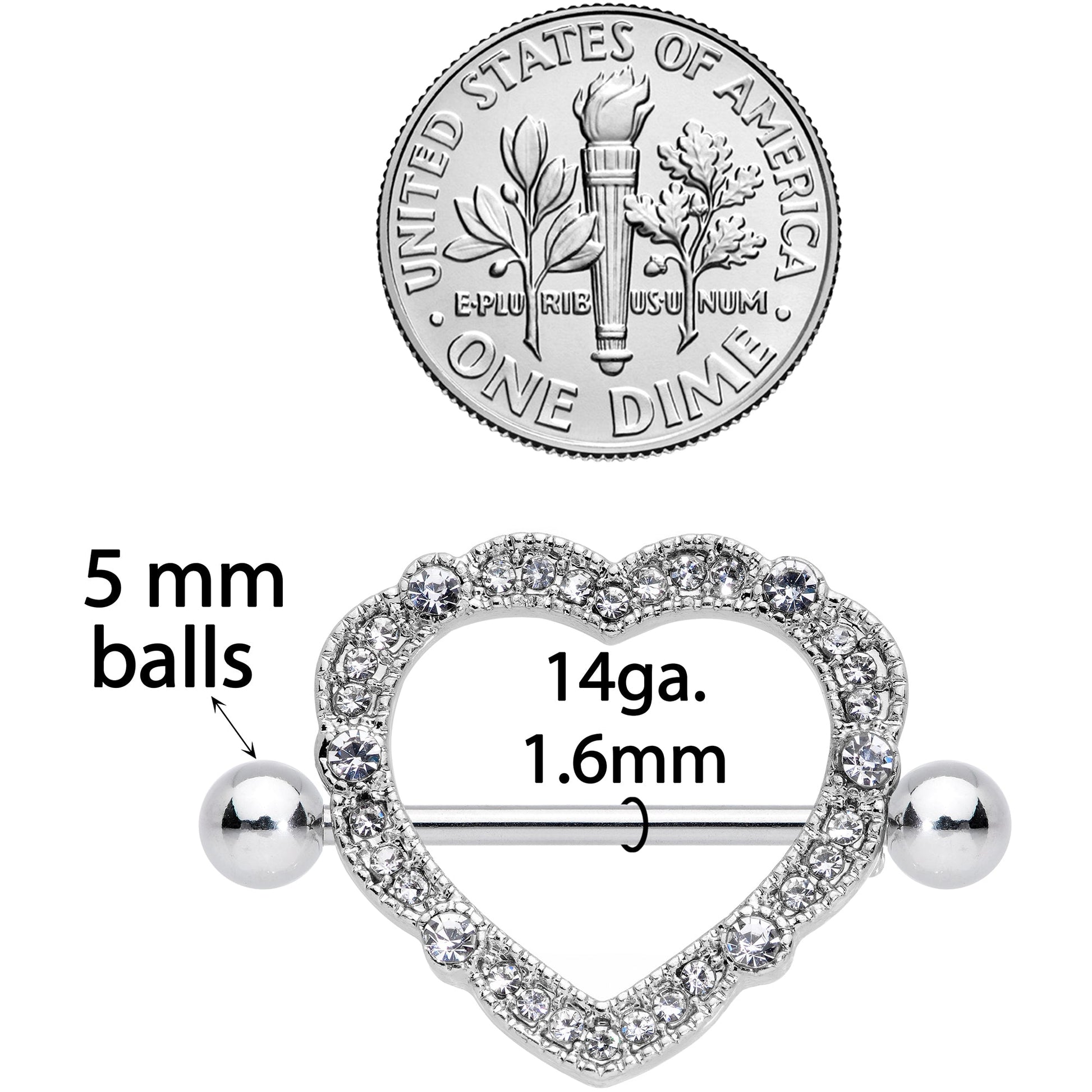 Keep your piercings close to your heart with these 14 gauge nipple shields! They're made with 14mm wearable length 316L surgical grade stainless steel straight barbells with a total length of 7/8" and 5mm ball ends and feature heart shield charms with clear gems. With their classic symbols of love and their snazzy, showy style, this nipple jewelry definitely emphasizes how you feel about your nipple piercings this Valentine's Day! Sold as a set of two.Specifications