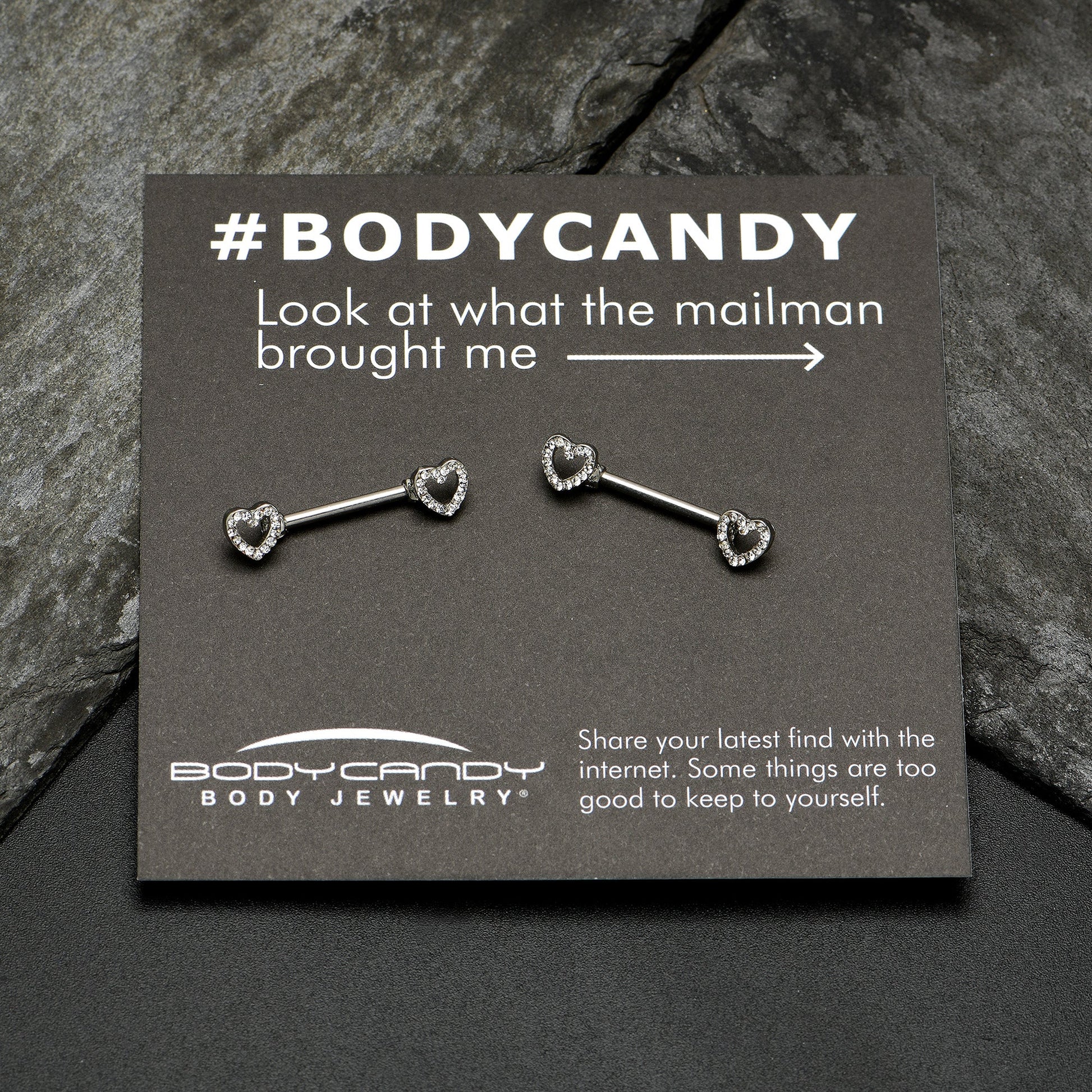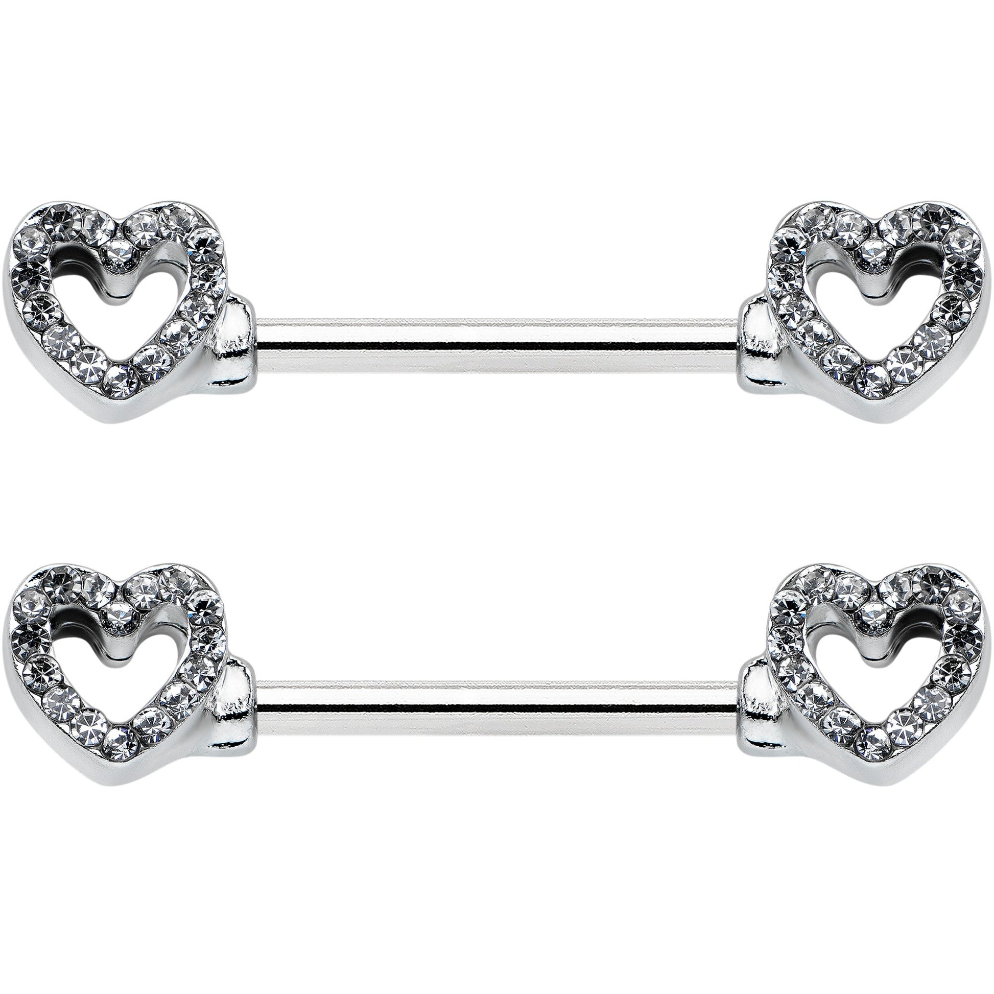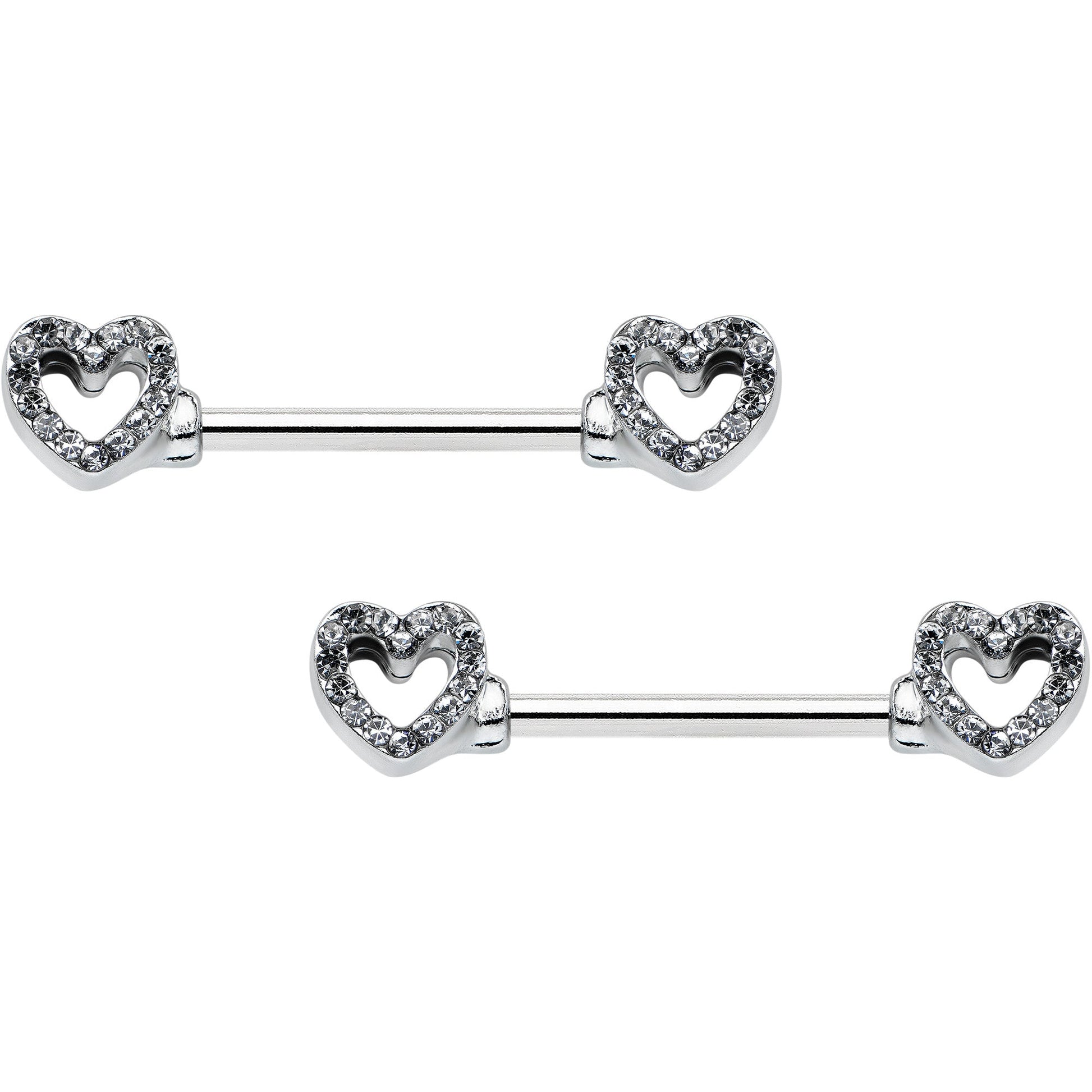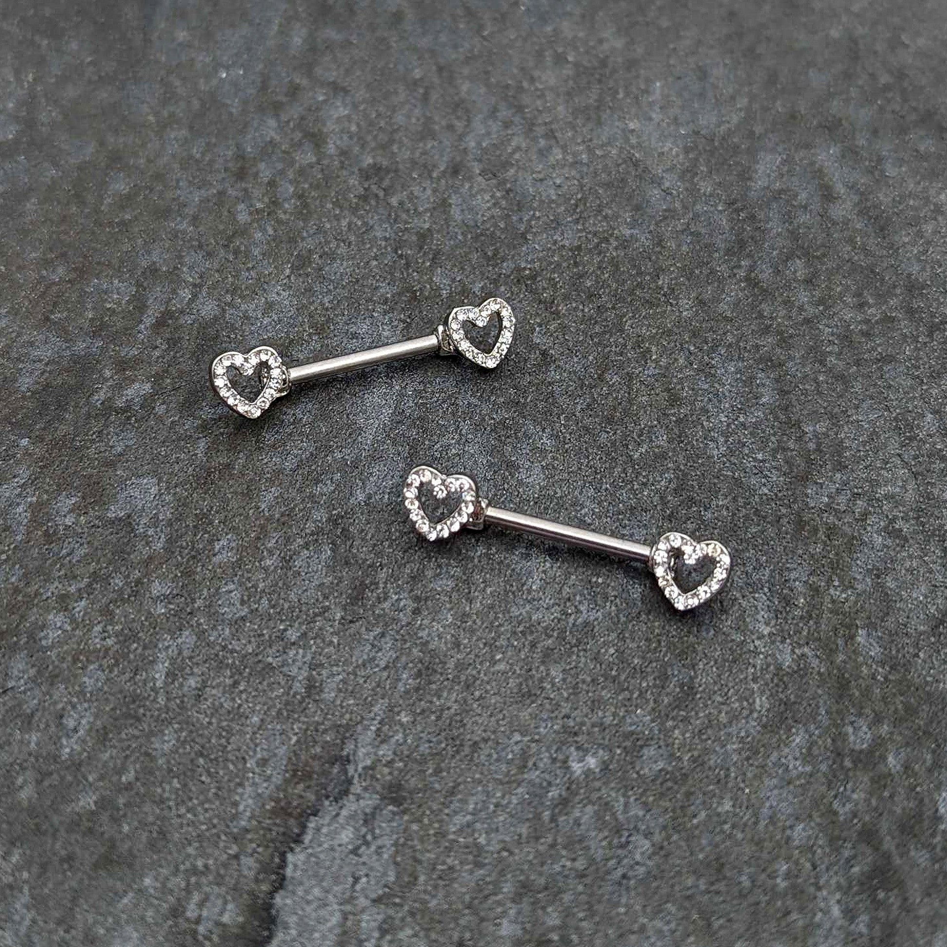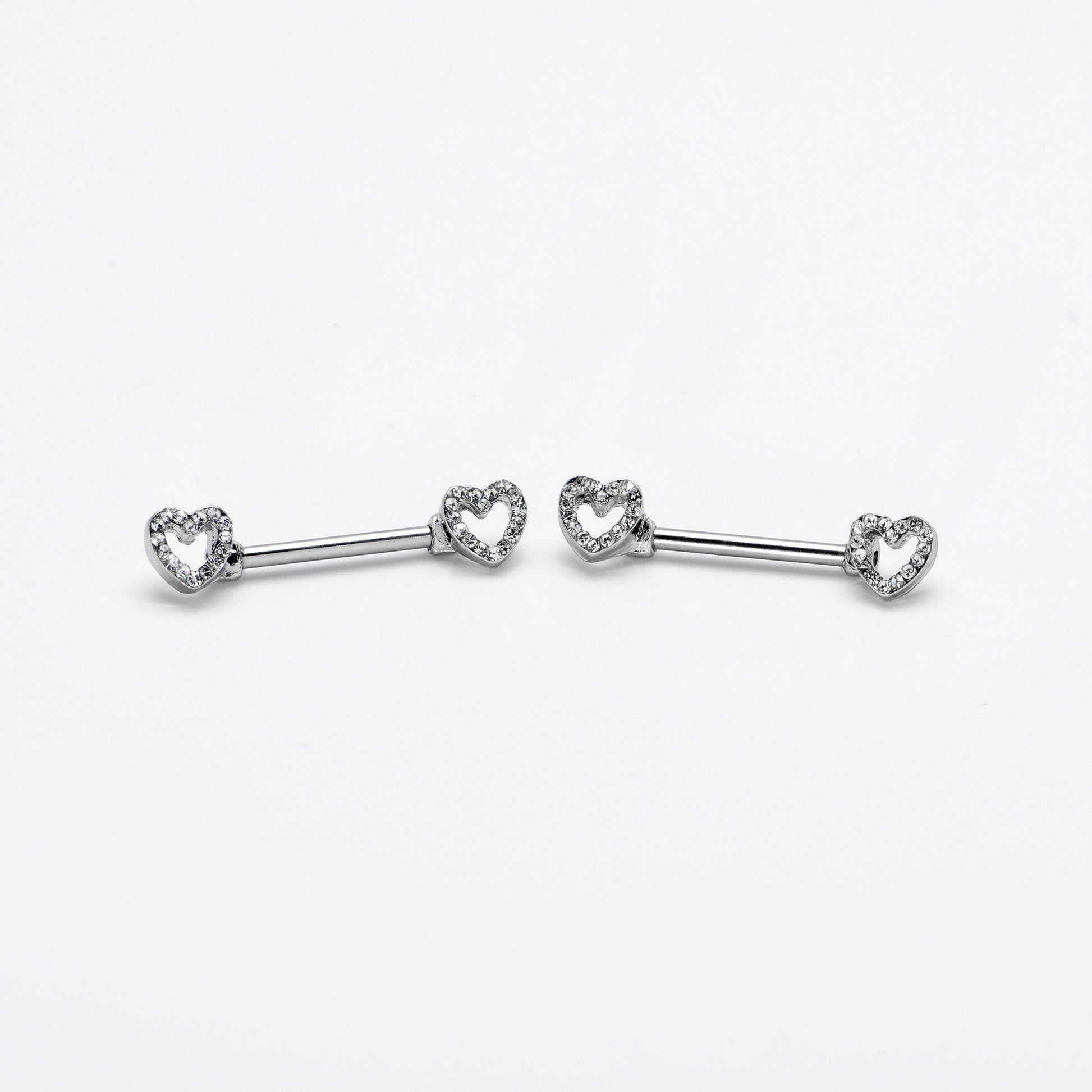 Keep your heart open and the world will notice - like on this 14 gauge nipple jewelry! It's made with 14mm durable 316L surgical grade stainless steel straight barbells. Each of the ends features a hollow heart charm, with the hearts paved with clear gems. The hearts are open at the centers for an airy look. For the incurable romantic, these understated valentine's nipple piercing rings are sure to make you fall in love! Sold as a set of two.Specifications
