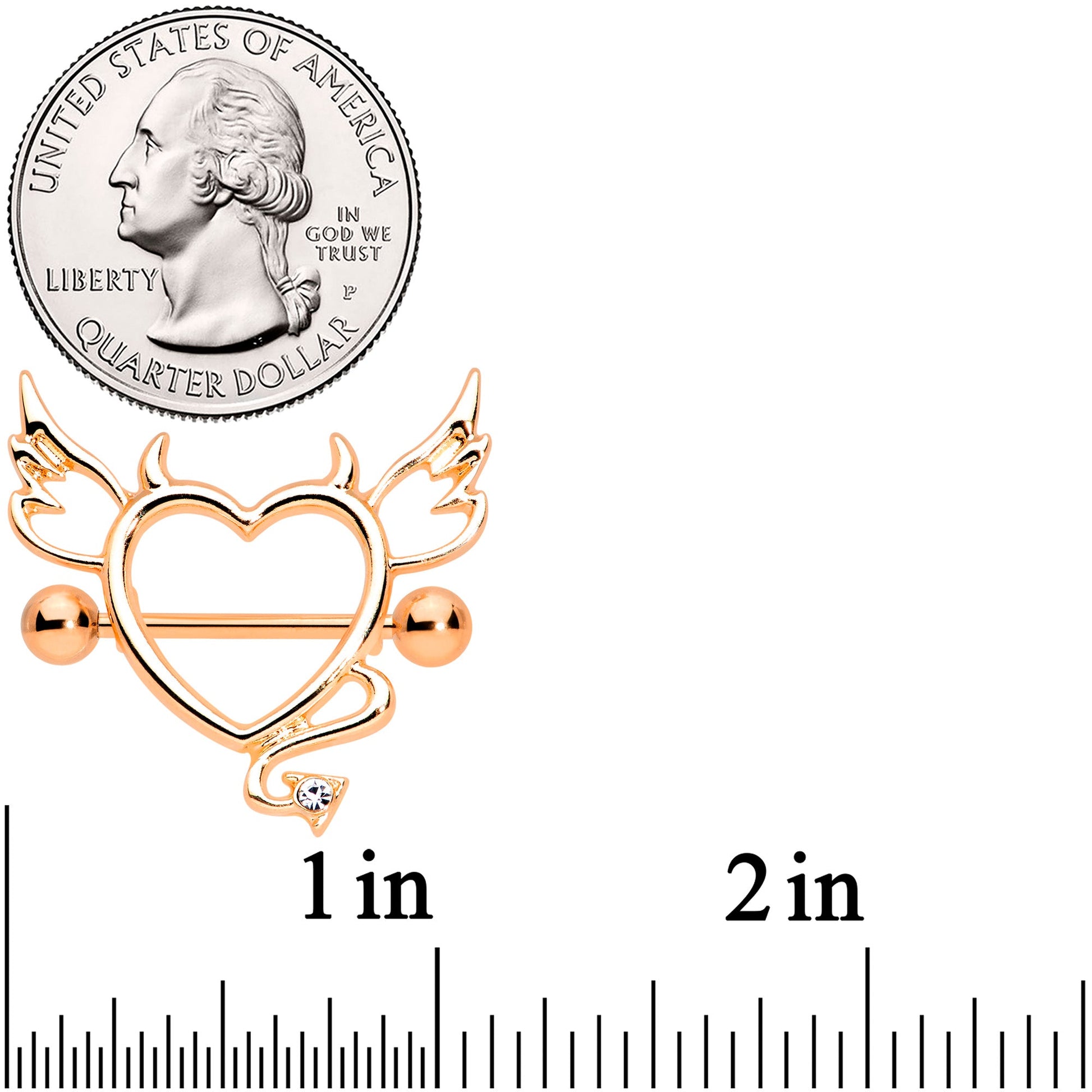 Even the most angelic heart can have a devilish side this Valentine's Day with these 14 gauge nipple shields! They're made with 14mm rose gold tone PVD over 316L surgical grade stainless steel straight barbells with 5mm ball ends. The shield portion features a hollow heart with detailed openwork wings. They also feature tiny horns and a short devilish tail that has a clear gem set into the triangular end. Whether your heart is naughty, nice, or both, you can express all three with this wickedly wonderful nipple jewelry! Sold as a set of two.Specifications