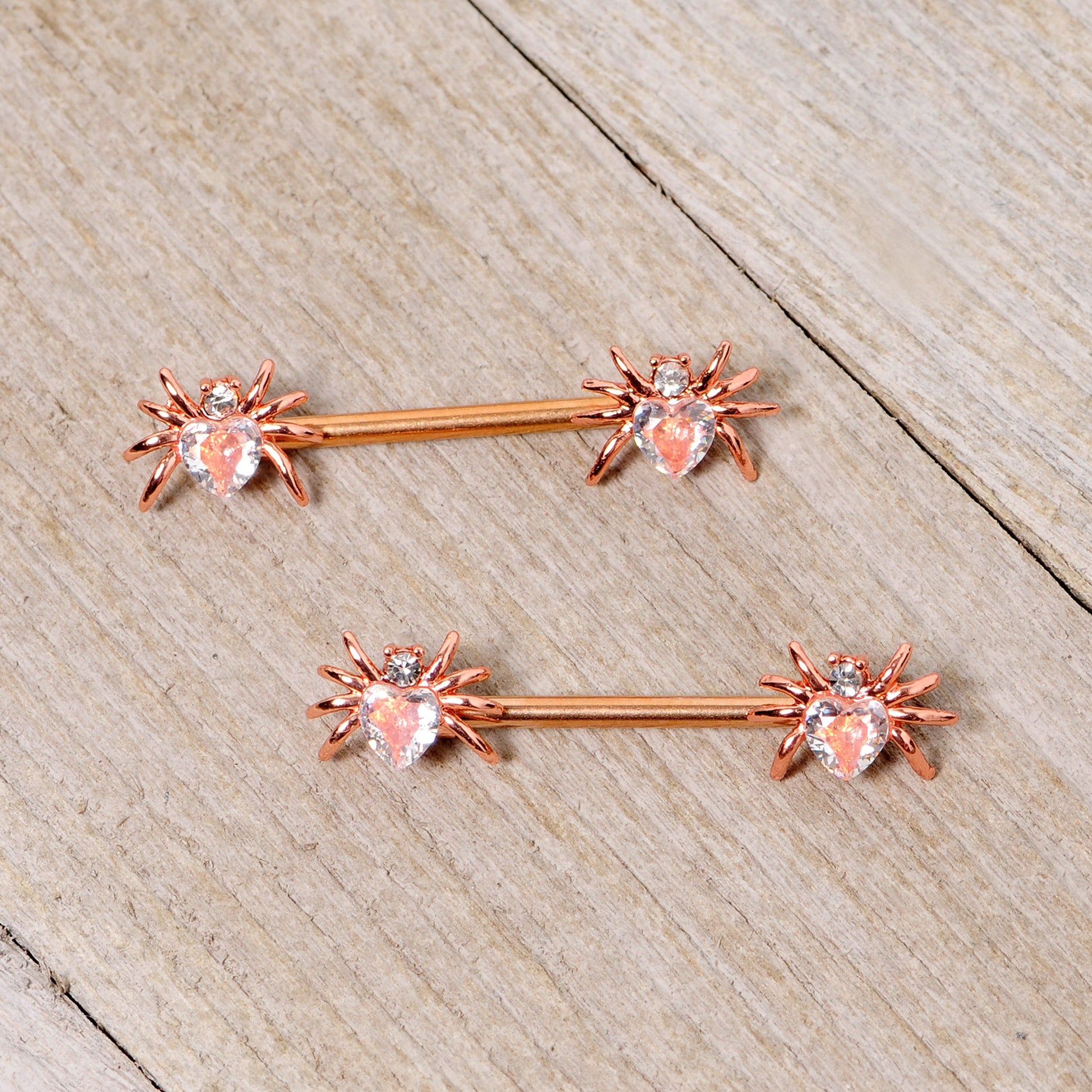 These spider's bodies will give you the Halloween shivers.....but not shivers of fear! This 14 gauge nipple jewelry is made with 14mm rose gold tone plated over 316L surgical grade stainless steel straight barbells. The ends feature spider charms with the body made of a Valentine's Day heart-shaped clear gem and the head composed of a smaller clear gem. So whether you cherish creepy crawlies or appreciate arachnids, these nipple rings are sure to snare you in their web! Sold as a set of two.Specifications