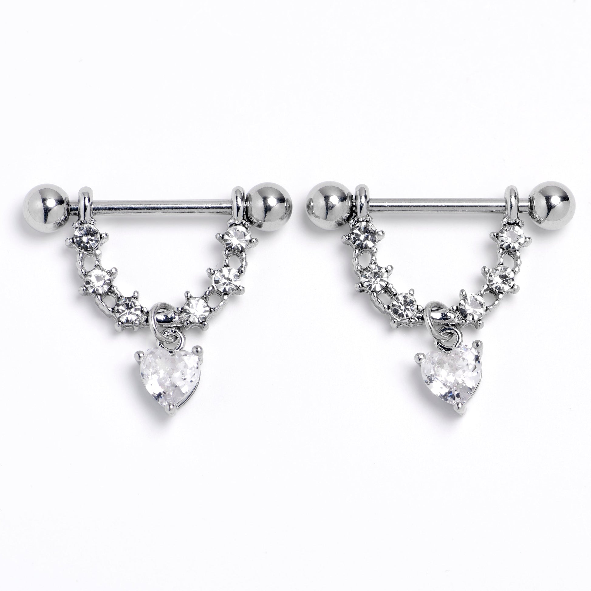 Feel like you are among the stars with this 14 gauge nipple jewelry. It is made with 14mm durable 316L surgical grade stainless steel straight barbells with 5mm ball ends. Each one supports a length of clear gem stars. Dangling beneath each one is a single clear gem with a heart shape. You will be starry eyed in love with these heavenly nipple piercing rings. Sold as a set of two.Specifications