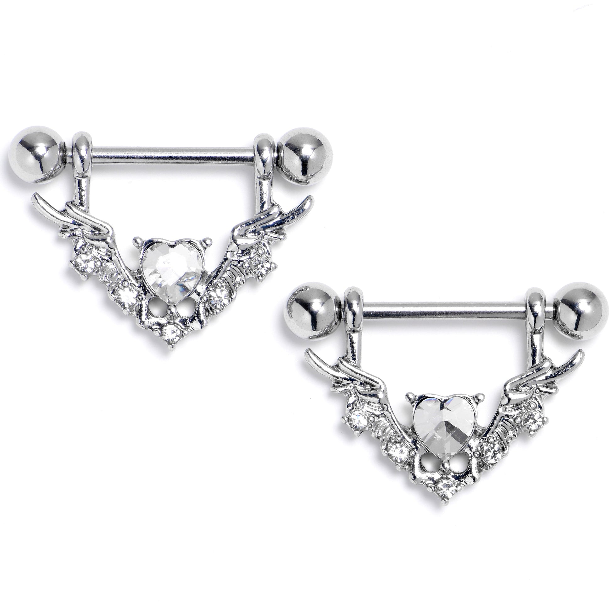 Fly to style with this classic 14 gauge nipple jewelry. It is made with 14mm durable 316L surgical grade stainless steel straight barbells with 5mm ball ends. Dangling from each is an angel wings charm. They are highly detailed and set with clear gems. At the top center of each one is a clear gem heart for a cohesive appearance. Let your look and your heart soar with these elegantly angelic nipple piercing rings. Sold as a set of two.Specifications