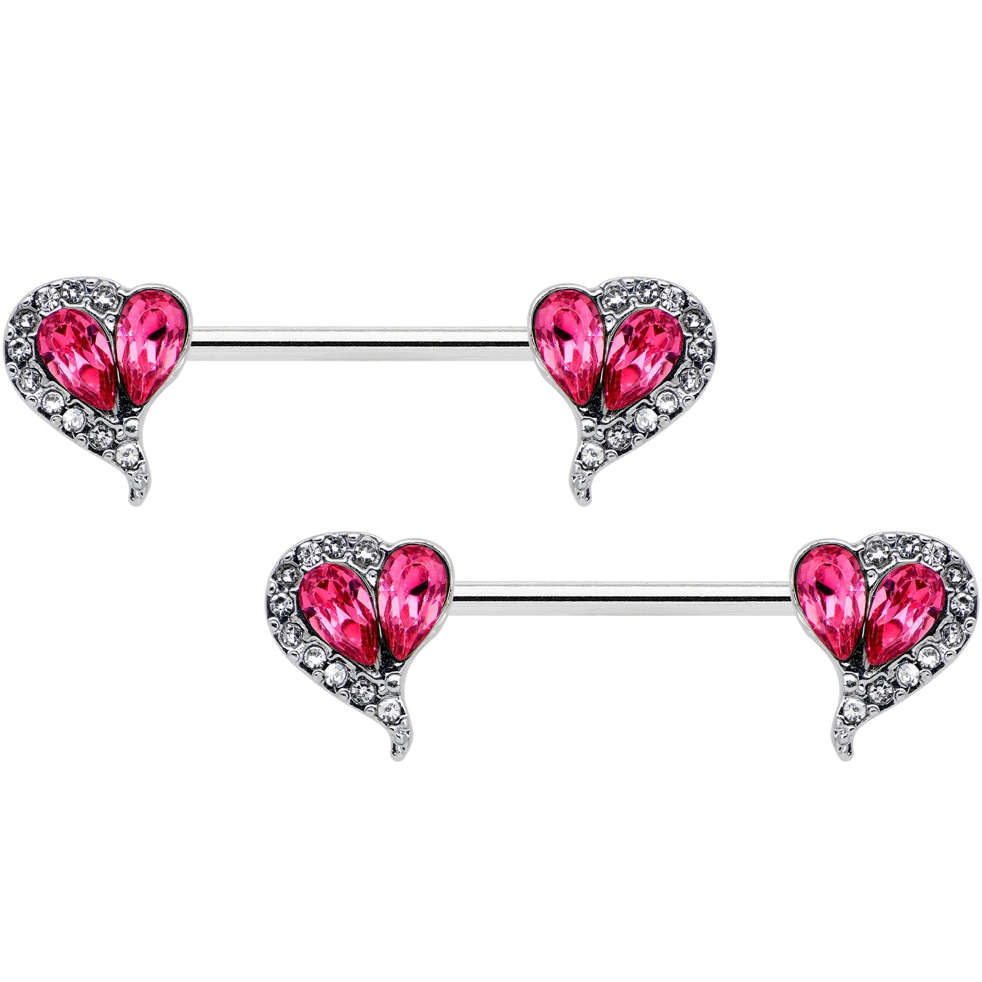 When love throws you a curve, wear it with pride with this 14 gauge nipple jewelry! It's made with 14mm durable 316L surgical grade stainless steel straight barbells. Each of the ends features a heart charm, with the heart composed entirely of two pink gems. Curving around the side of the hearts are elegant swirls, paved with small clear gems for added style. Wear your heart with elegant style with these charming Valentine nipple piercing rings! Sold as a set of two.Specifications